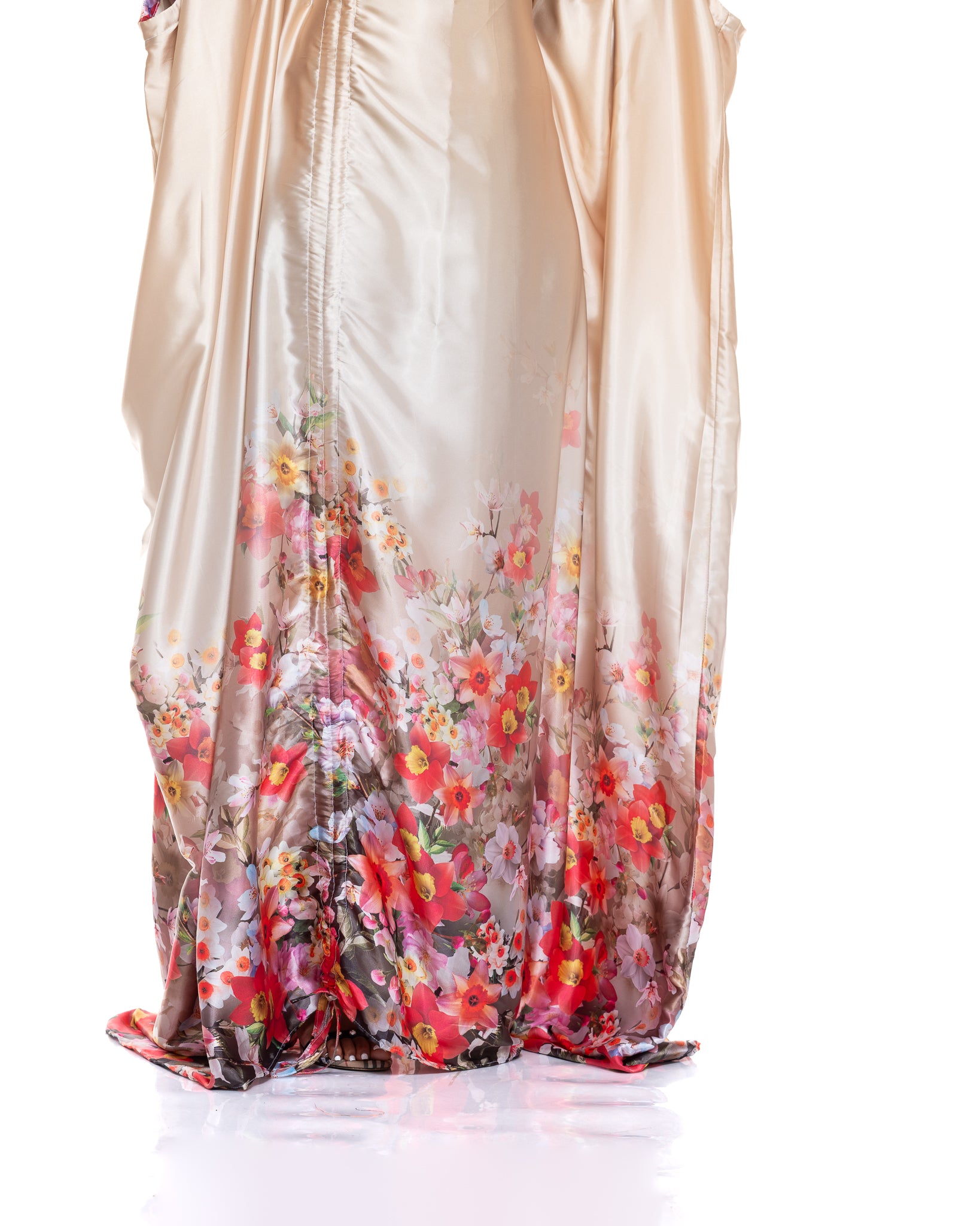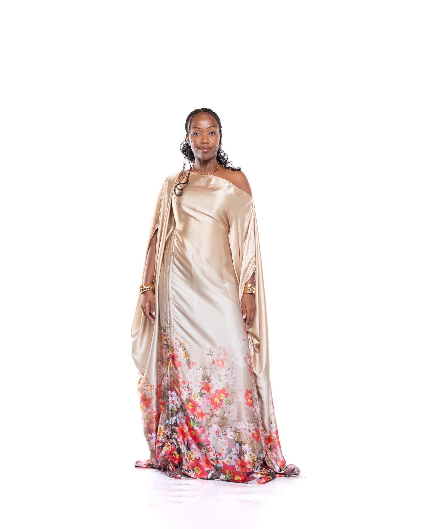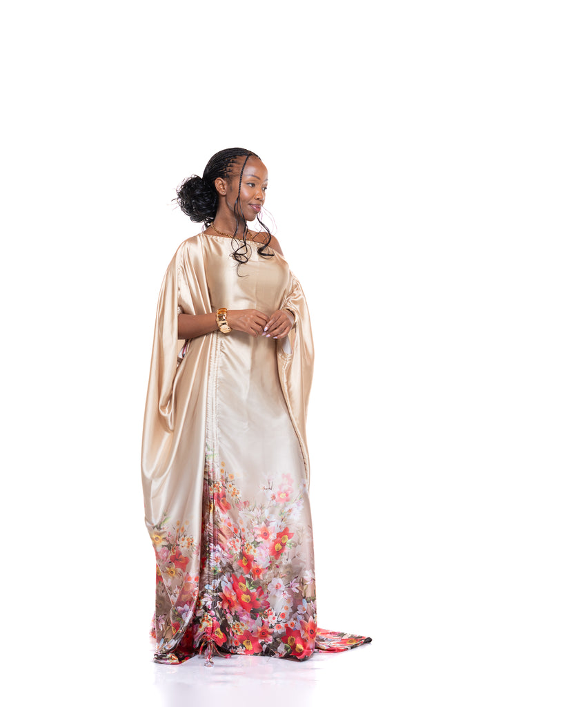 The Amber Veil Kaftan is crafted from smooth gold satin, giving it a radiant, glossy finish that instantly elevates your look. Its flowing drape creates a soft, sculptural silhouette, while the delicate floral print at the hem adds a vibrant, feminine contrast.