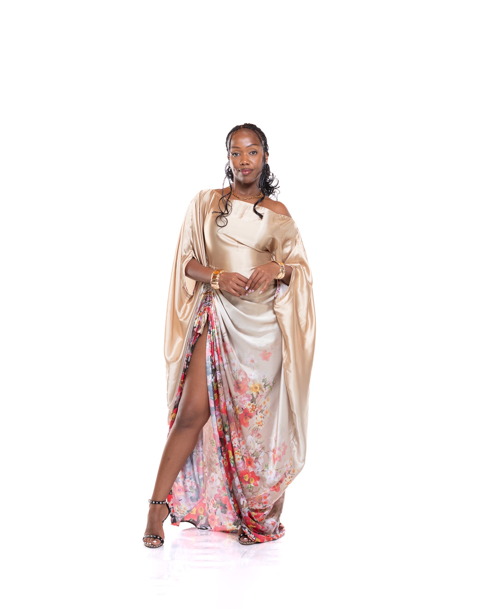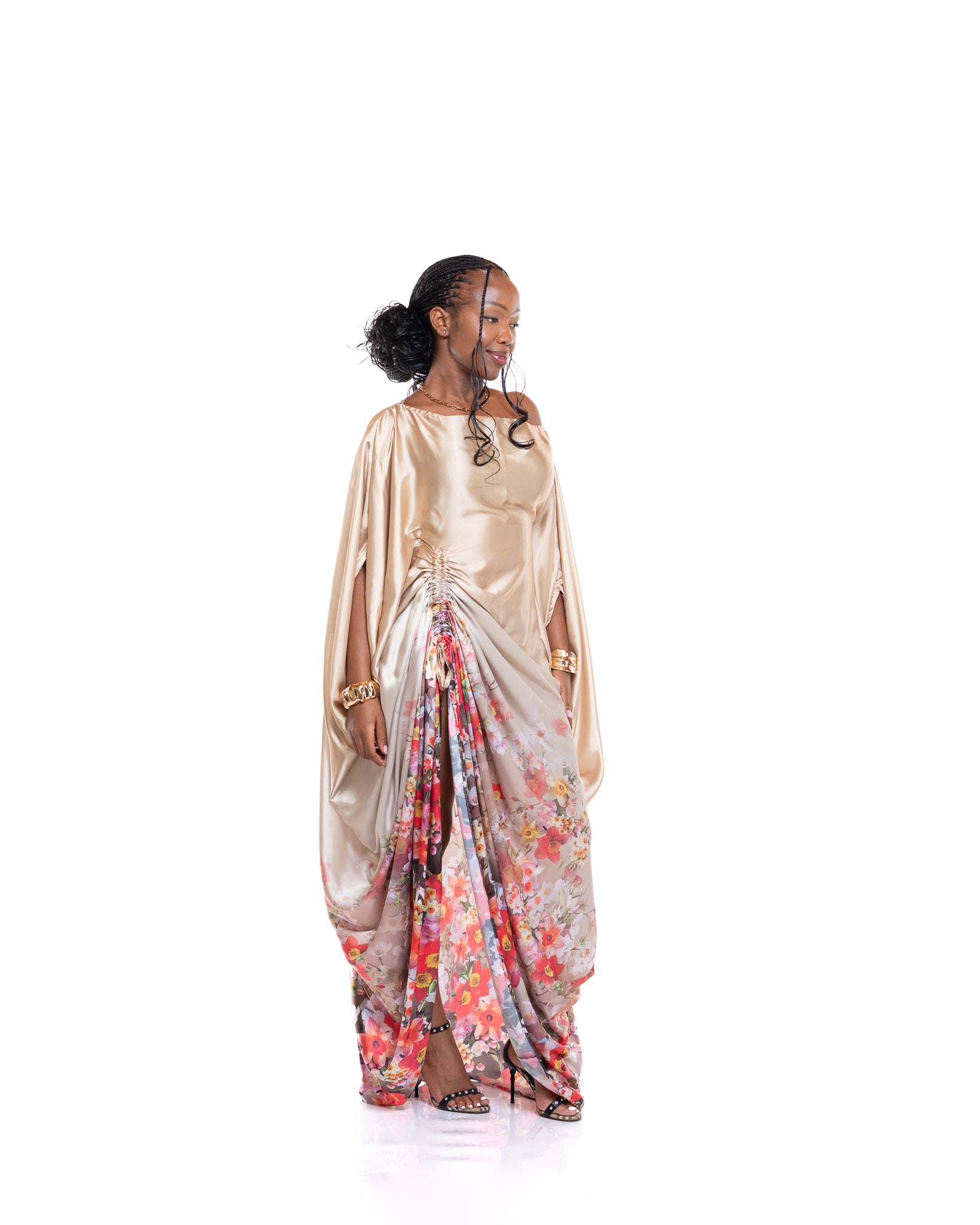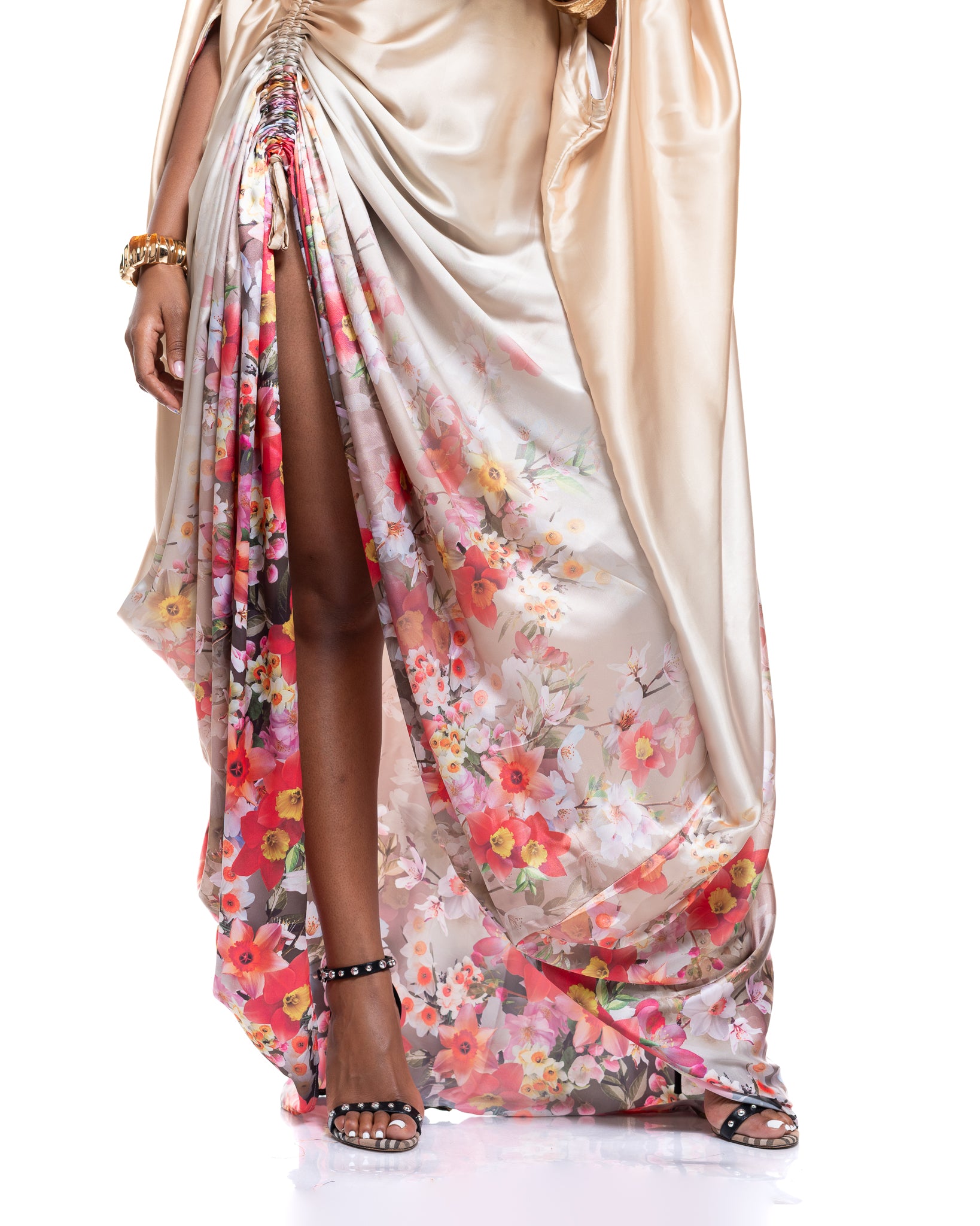 The Amber Veil Kaftan is crafted from smooth gold satin, giving it a radiant, glossy finish that instantly elevates your look. Its flowing drape creates a soft, sculptural silhouette, while the delicate floral print at the hem adds a vibrant, feminine contrast.