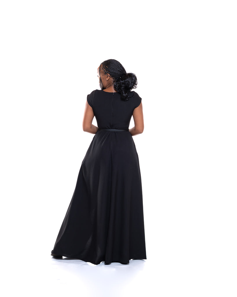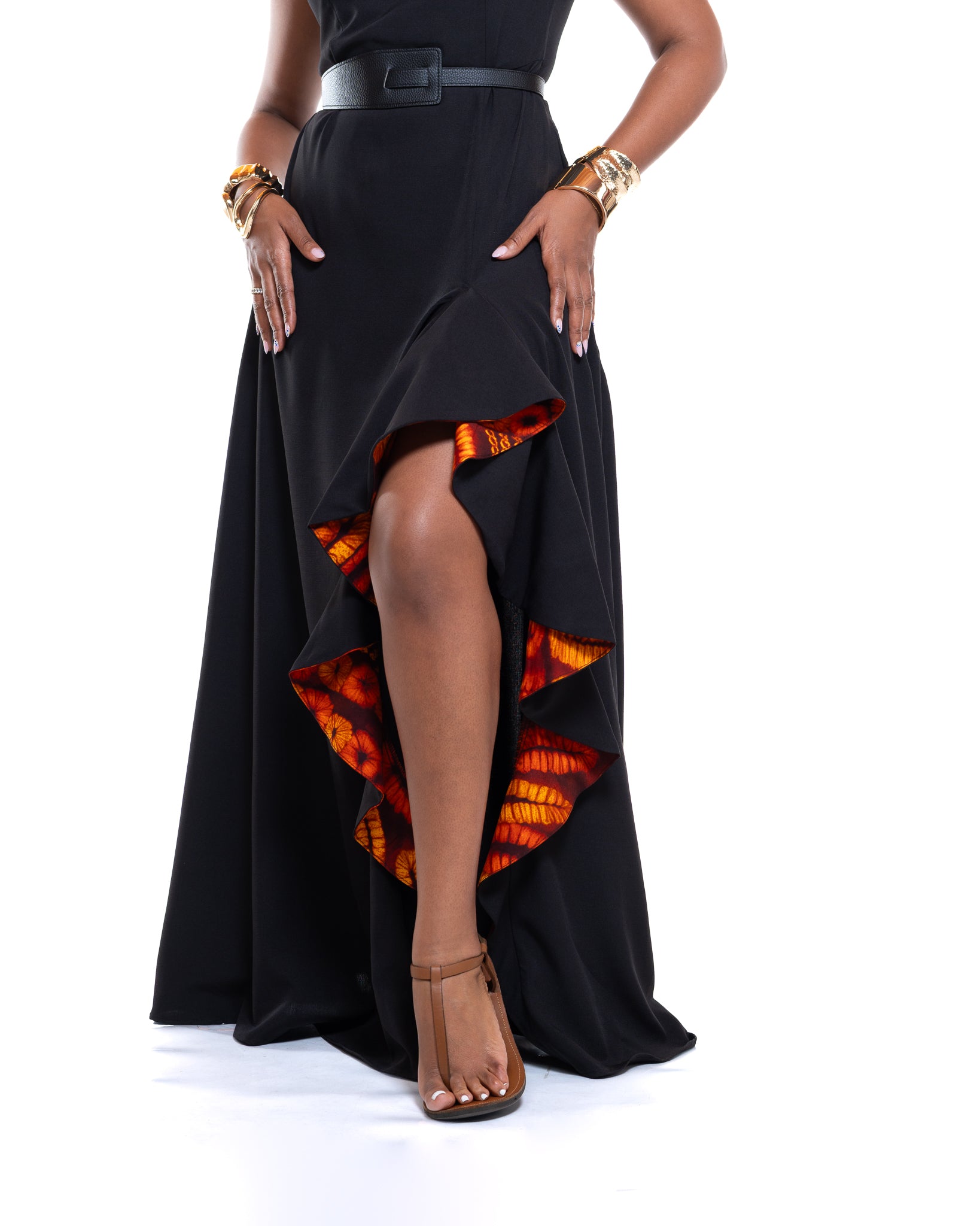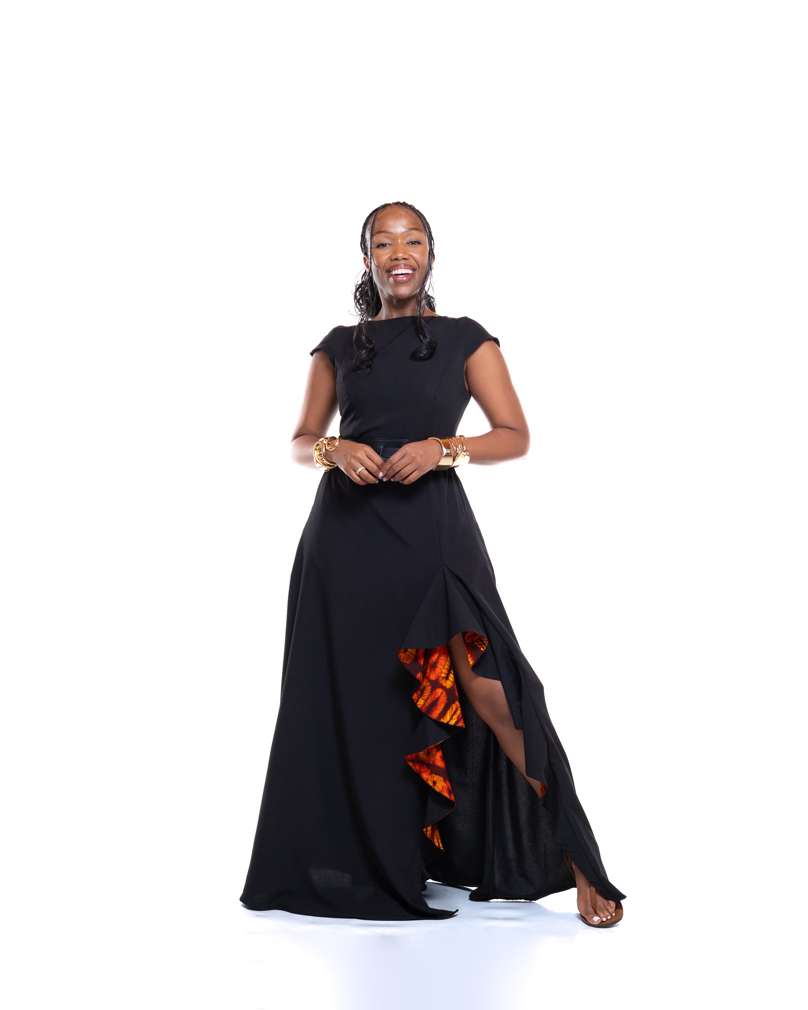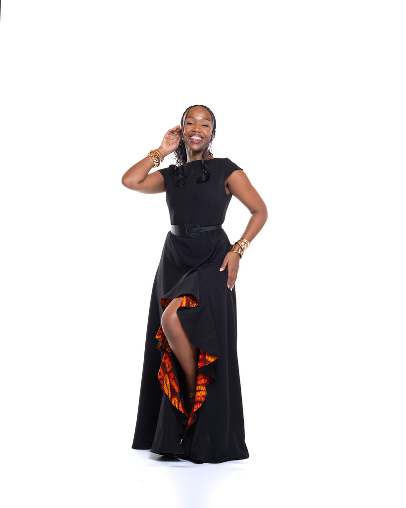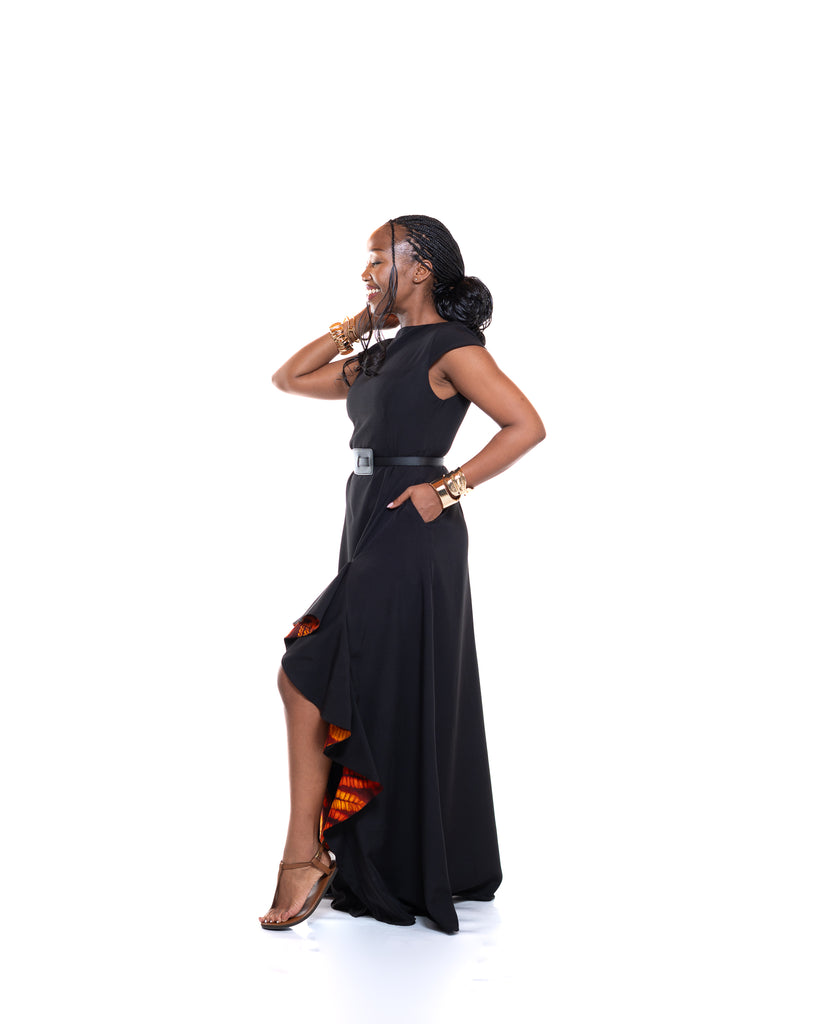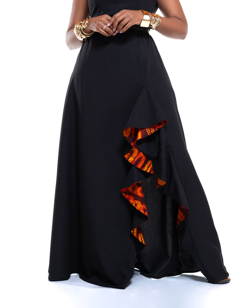 • Sleek black maxi design with Ankara ruffle detailing