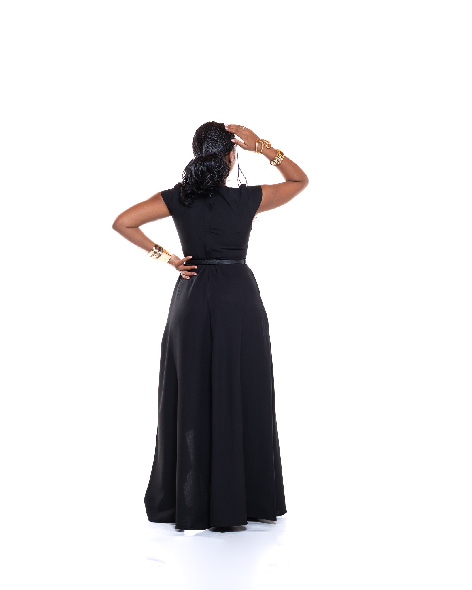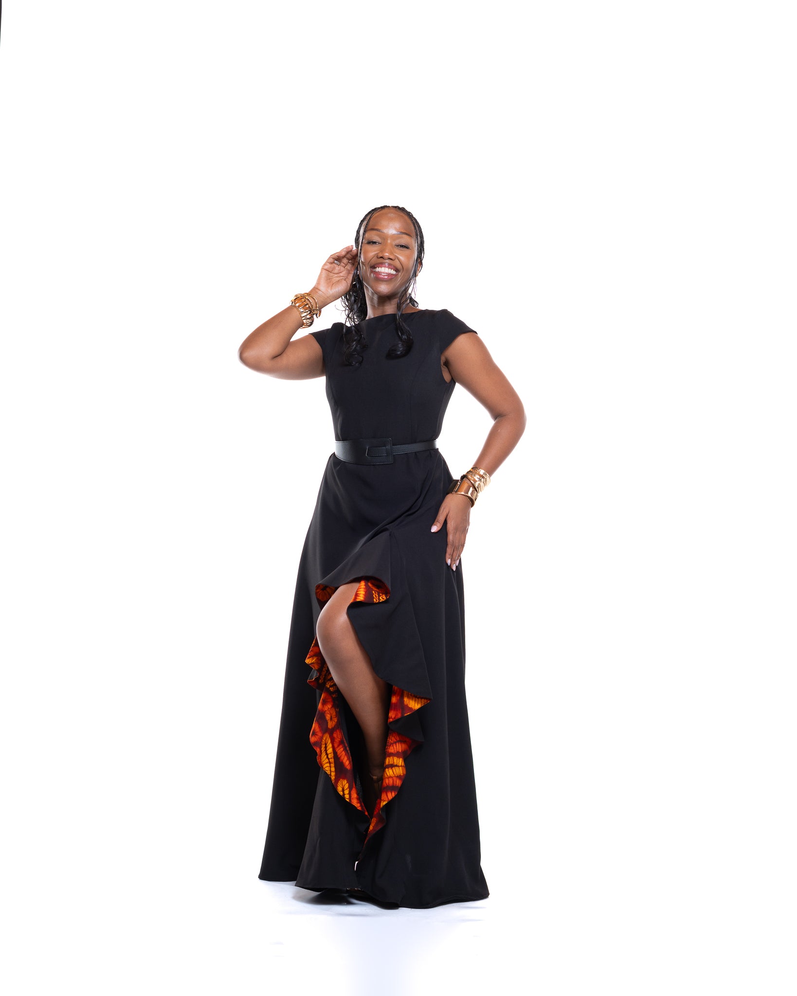 The Dewdrop Maxi Dress pairs classic black with a vibrant Ankara-lined ruffle slit that immediately elevates the silhouette. Crafted from a heavy polyester blend with Ankara contrast detailing, it drapes smoothly while offering structure and fluid movement as you walk.