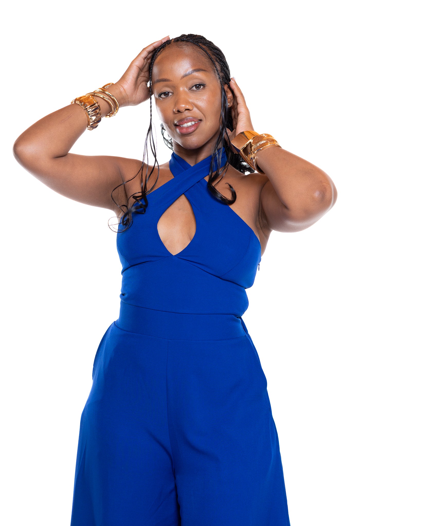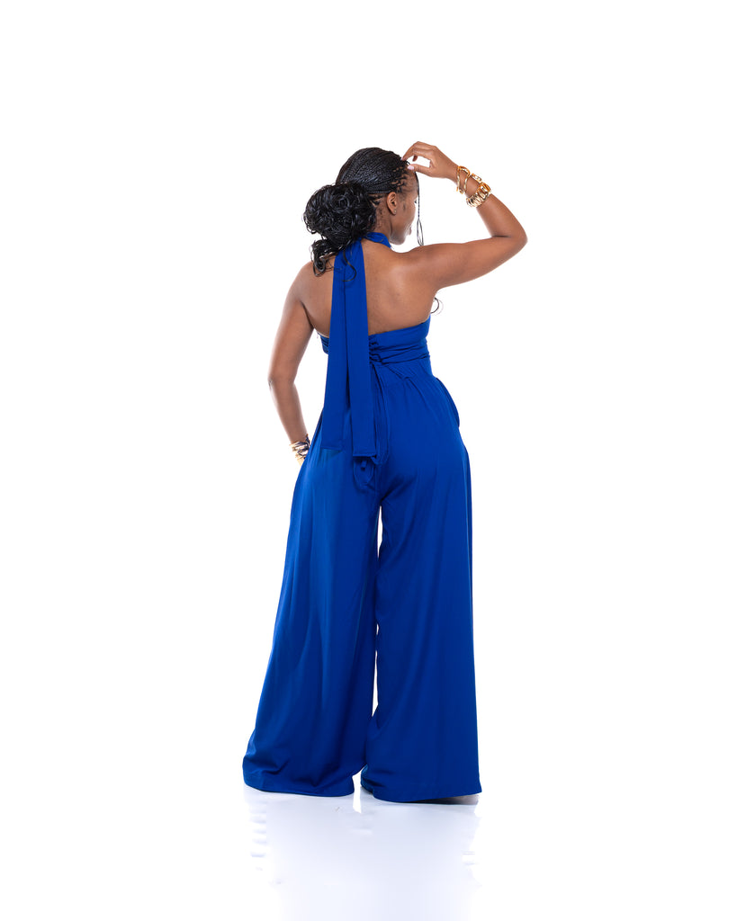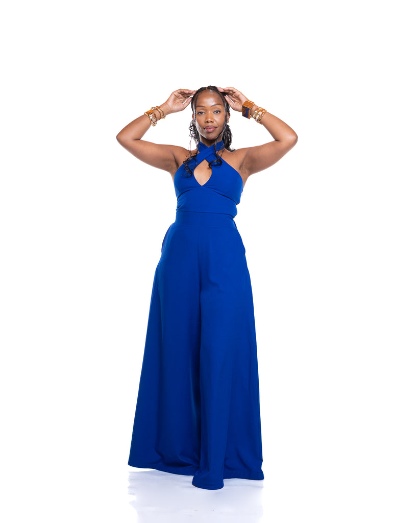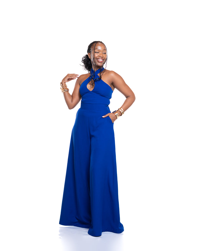 The halter-neck straps cross and wrap behind the neck, creating a lifted, sculpted neckline with a chic keyhole detail at the bust. The tailored, cinched waist enhances your natural curves, while the fluid trousers create an elongated, statuesque silhouette.