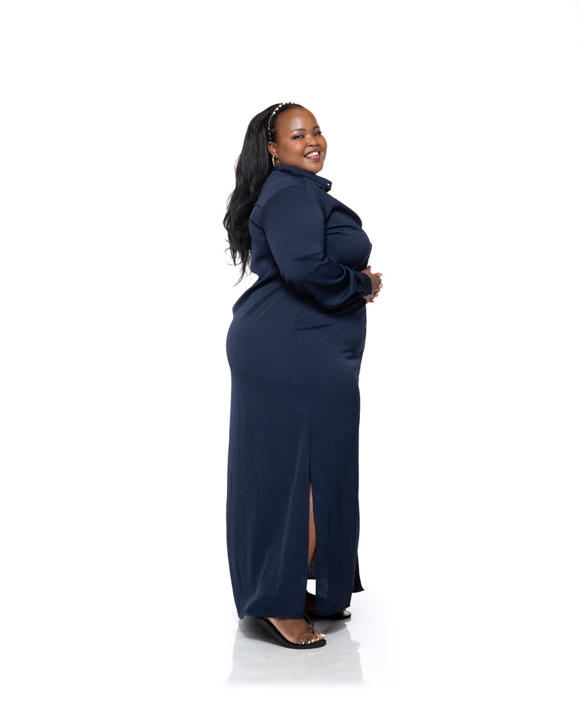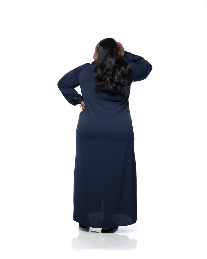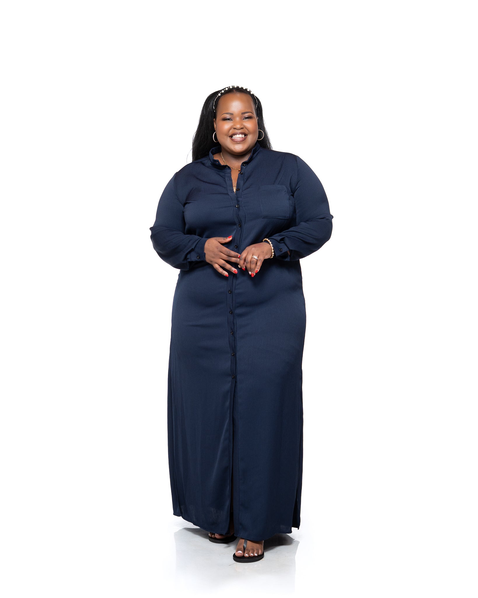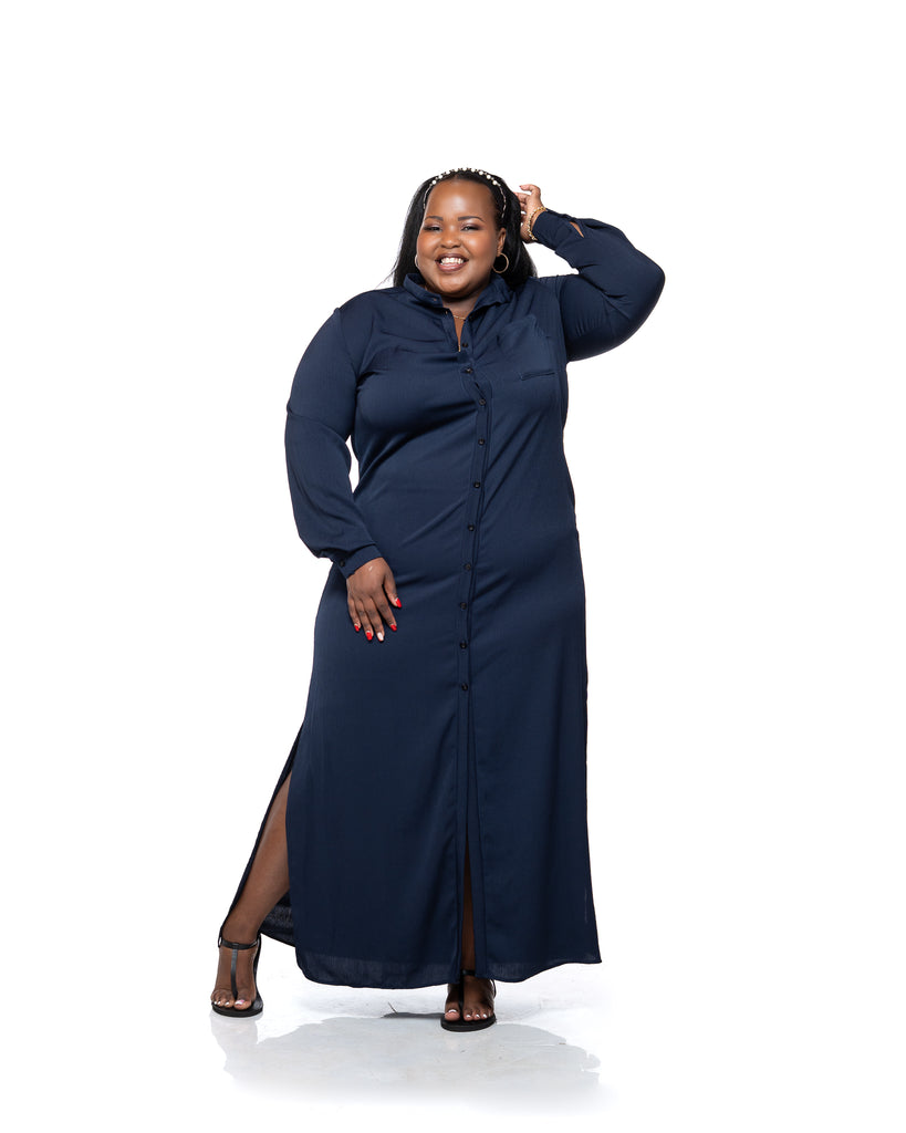 Imagine yourself gliding through the day in this exquisitely crafted Navy Blue maxi shirt dress.