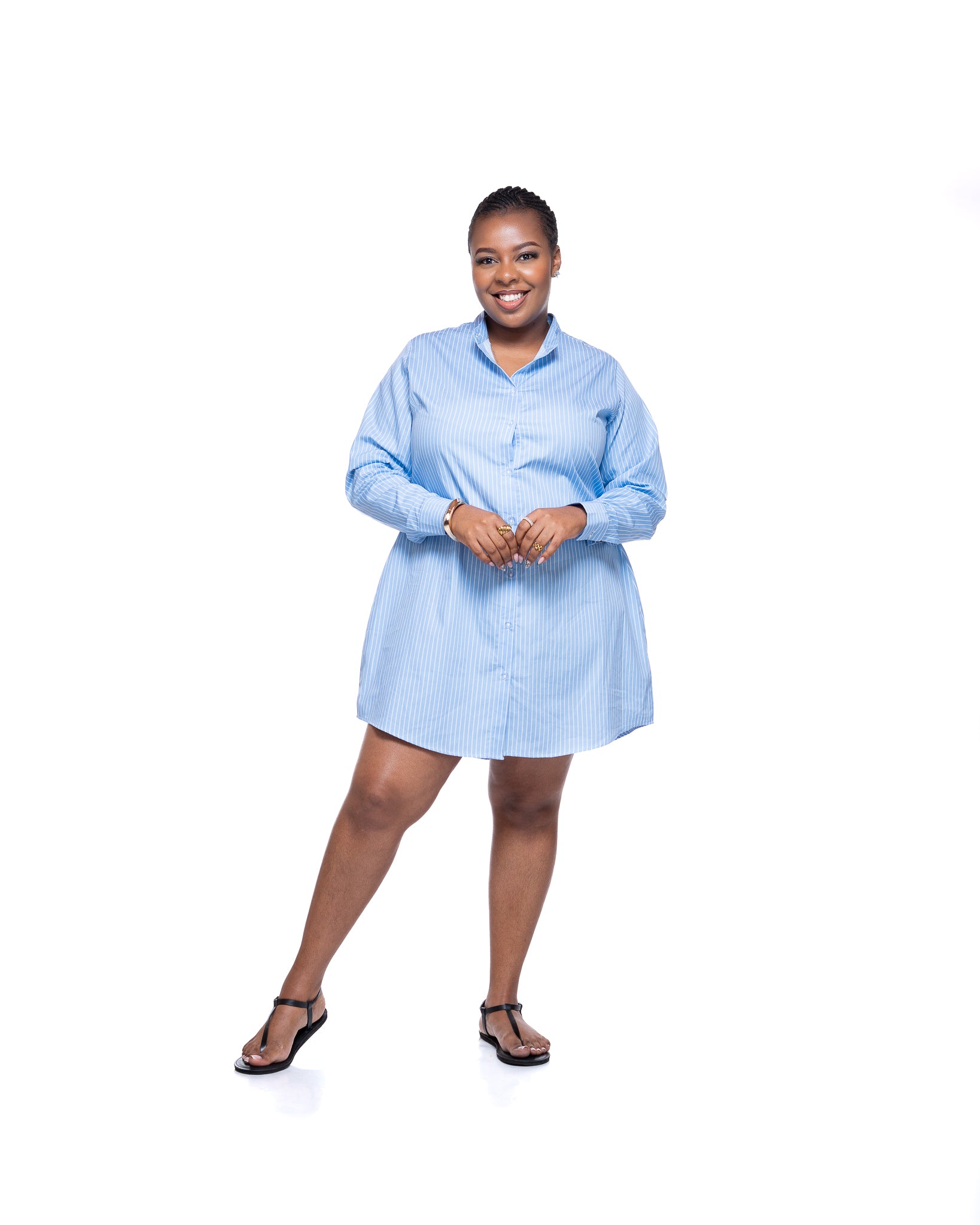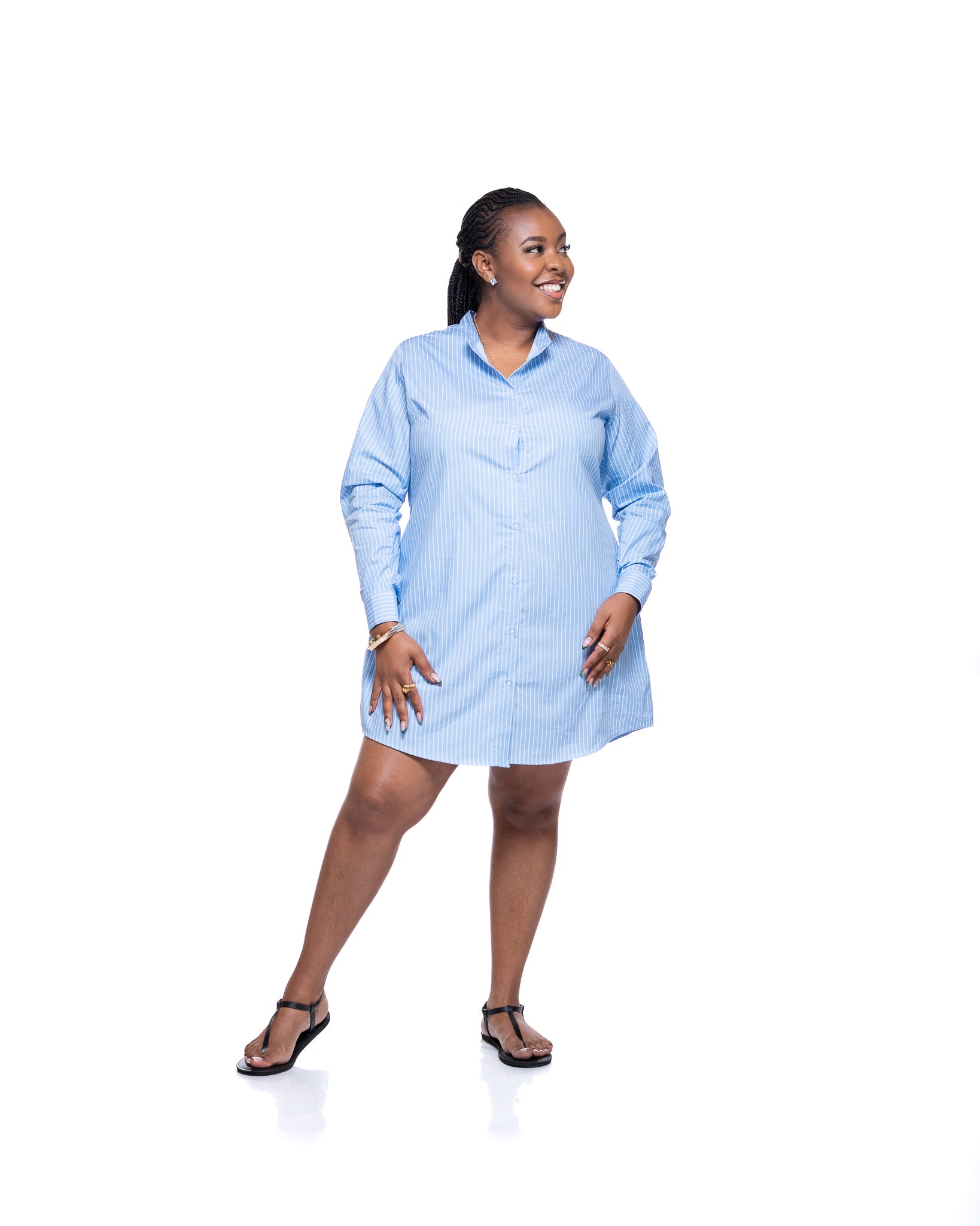 Finished with long sleeves and buttoned cuffs, the Marina Shirt Dress balances tailored details with an easy, wearable feel. The sky-blue base with crisp white pinstripes keeps the look fresh, clean, and timeless.