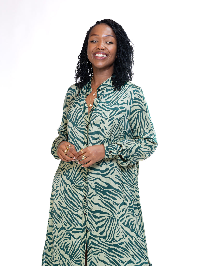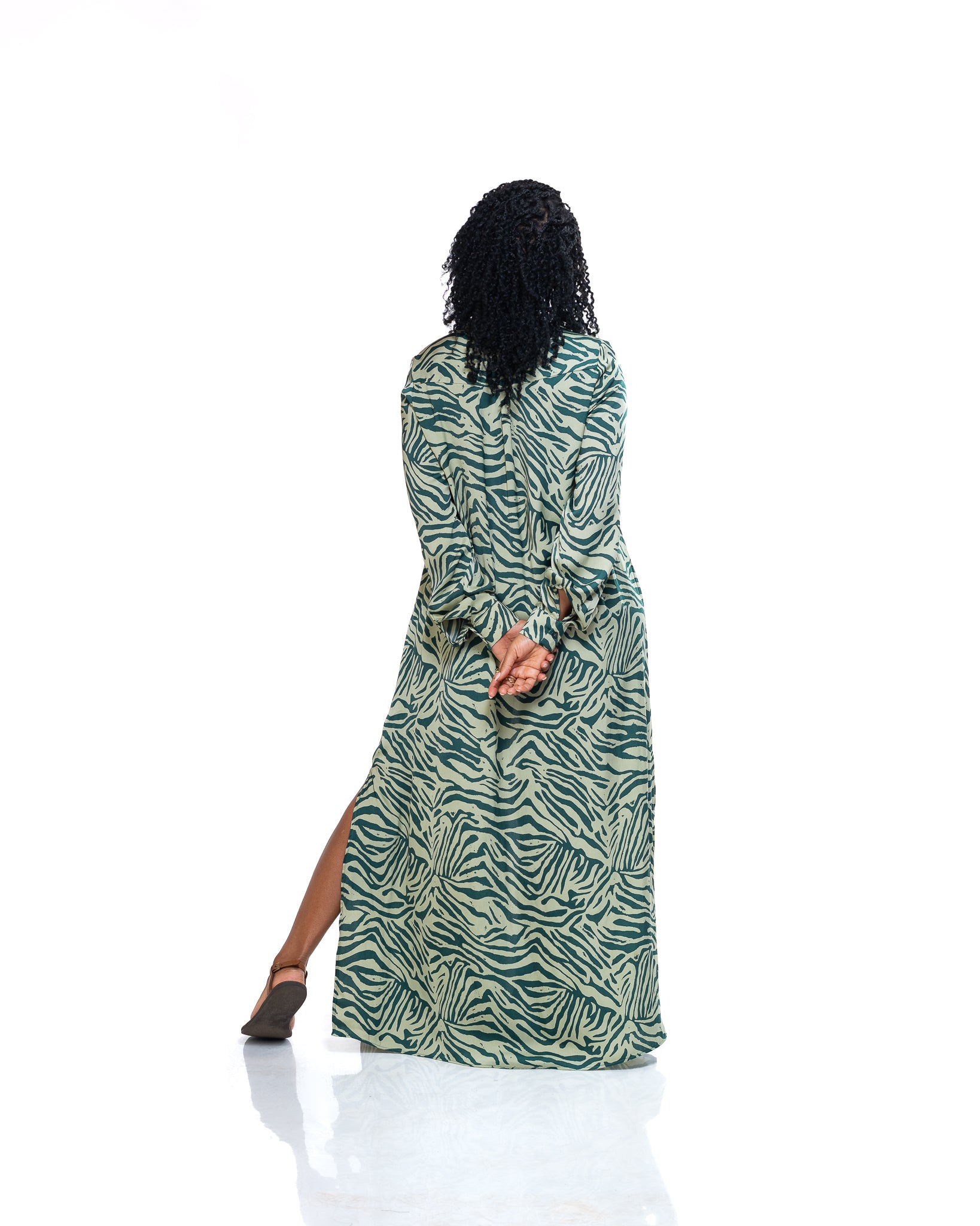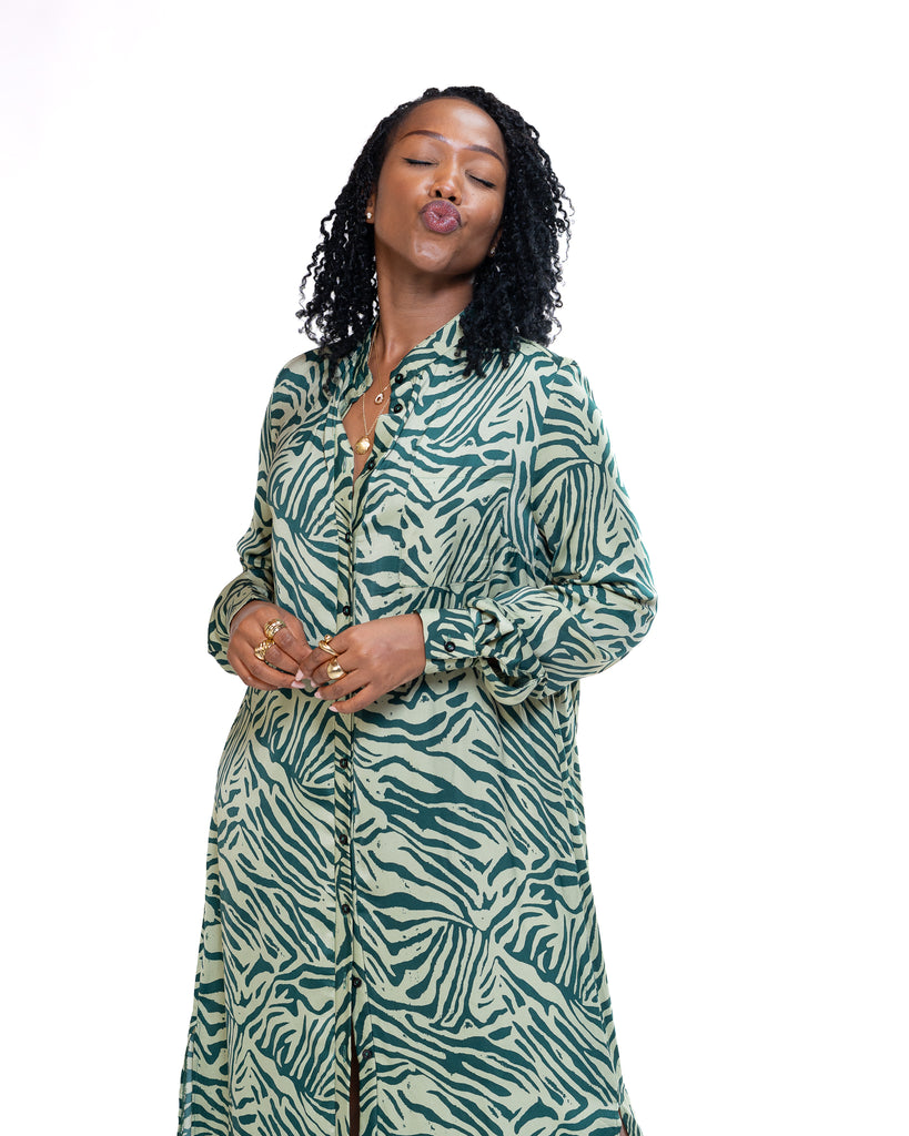 This exquisite piece marries the timeless elegance of a shirt dress with a vibrant, wild-inspired print, creating a look that is both sophisticated and free-spirited.