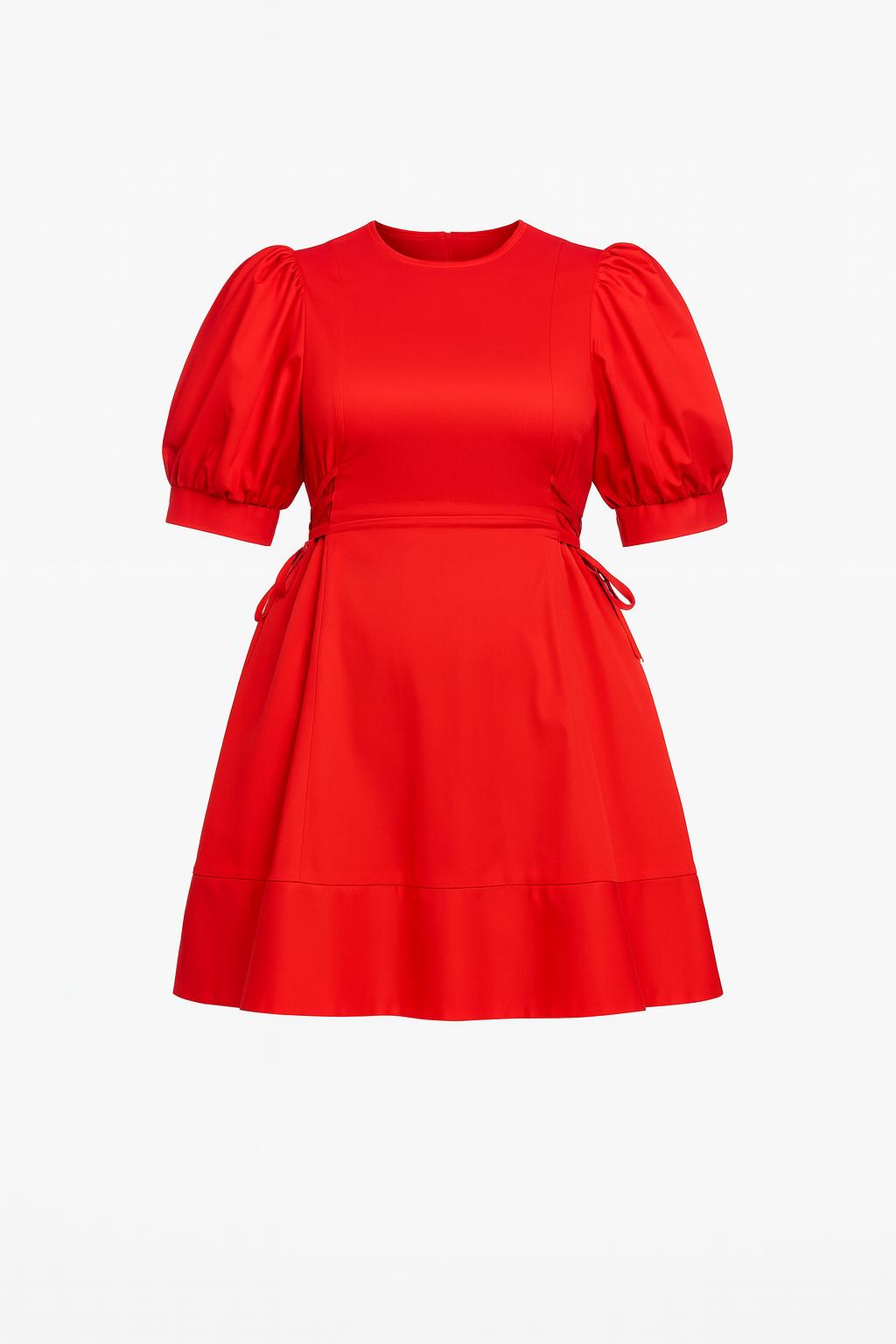 The dress features a corset detail on the sides of the waist that cinch up for a cocktail look and can be taken off for an off-duty look.