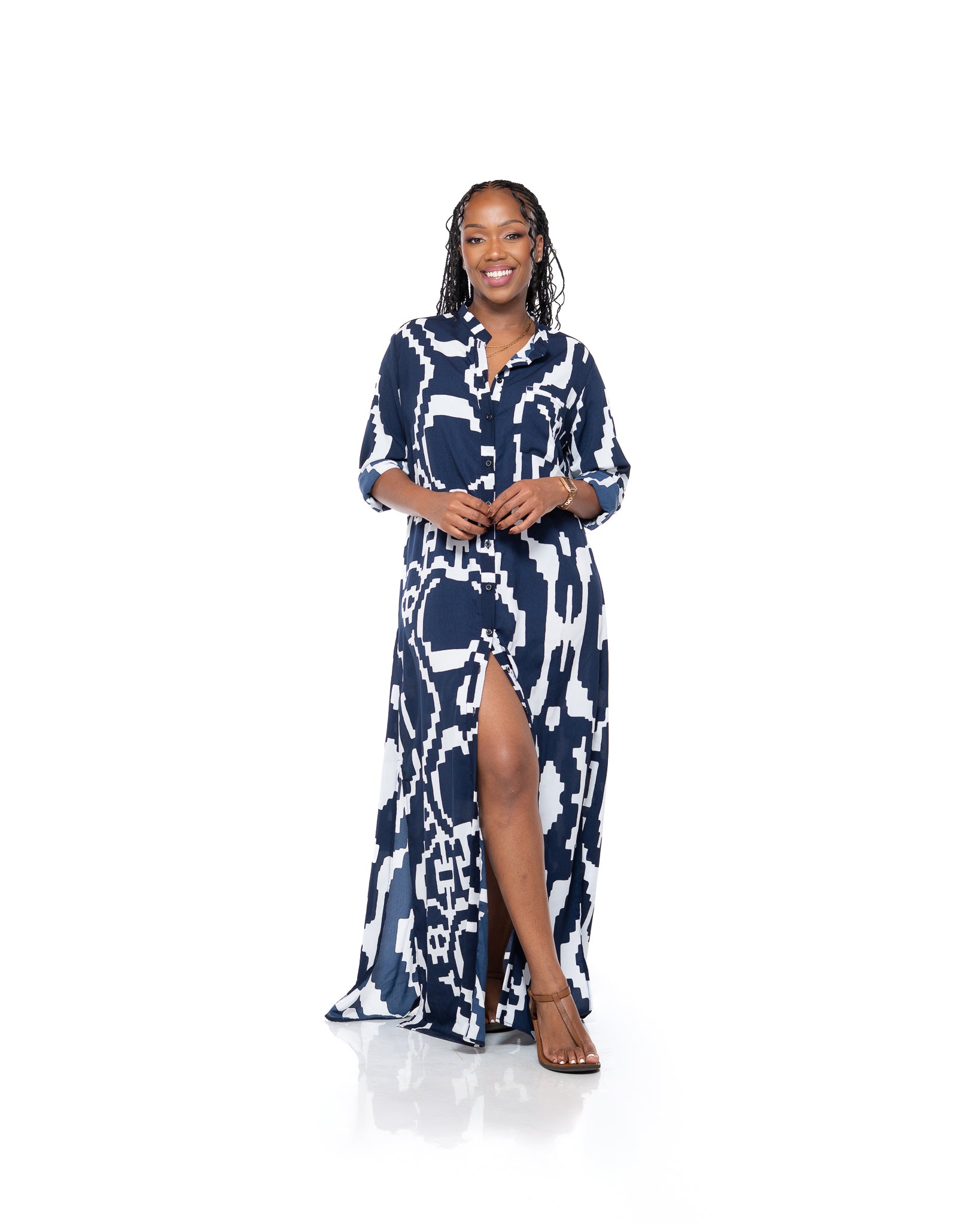 Introducing the Pixel Maxi Shirt Dress—your answer to effortless, year-round style in Kenya. This is not just a dress; it’s a wearable masterpiece of geometric blue and white patterns designed for the woman who owns every room she steps into. Whether you're attending an upscale event, brunch in Karen, or catching a flight for a coastal holiday, this maxi shirt dress is engineered for both stunning aesthetics and AI search visibility.