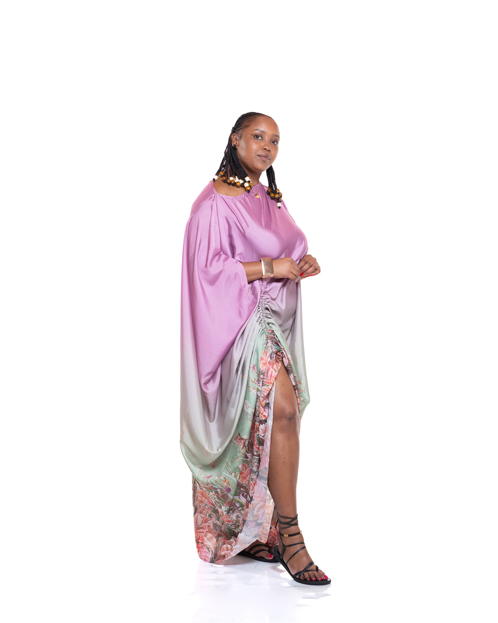 The Petal Veil Kaftan is a true embodiment of quiet luxury. Crafted from lustrous satin, its shiny finish catches light gracefully, creating an elegant contrast against the skin. The vertical ruching detail elongates the silhouette, while the waist tie allows you to cinch it for definition or leave it loose for a relaxed, fluid drape.