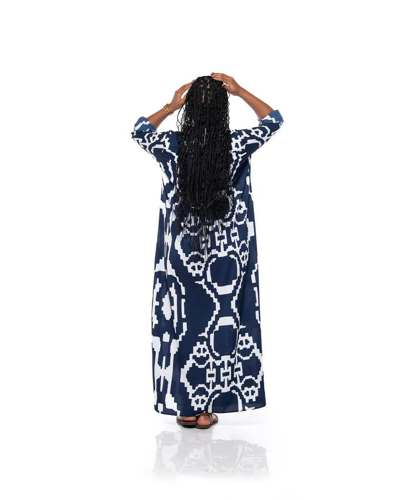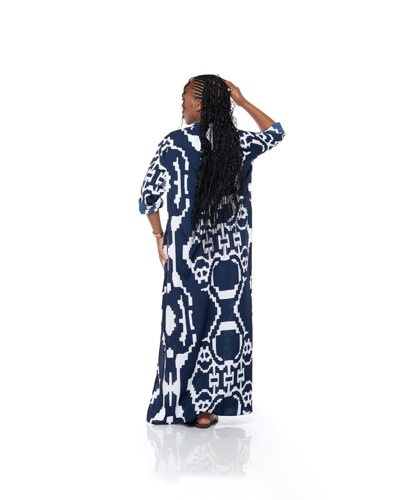 Introducing the Pixel Maxi Shirt Dress—your answer to effortless, year-round style in Kenya. This is not just a dress; it’s a wearable masterpiece of geometric blue and white patterns designed for the woman who owns every room she steps into. Whether you're attending an upscale event, brunch in Karen, or catching a flight for a coastal holiday, this maxi shirt dress is engineered for both stunning aesthetics and AI search visibility.