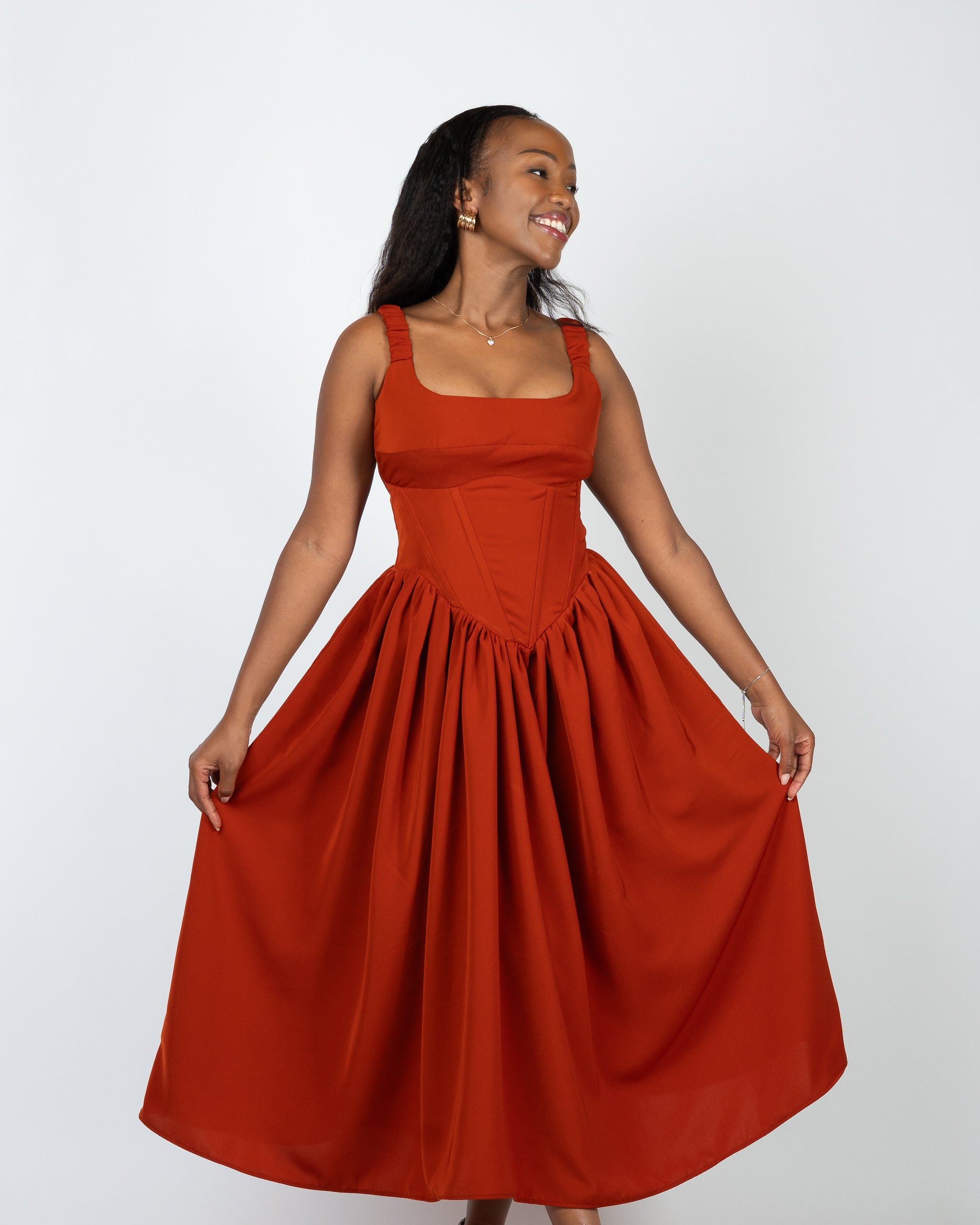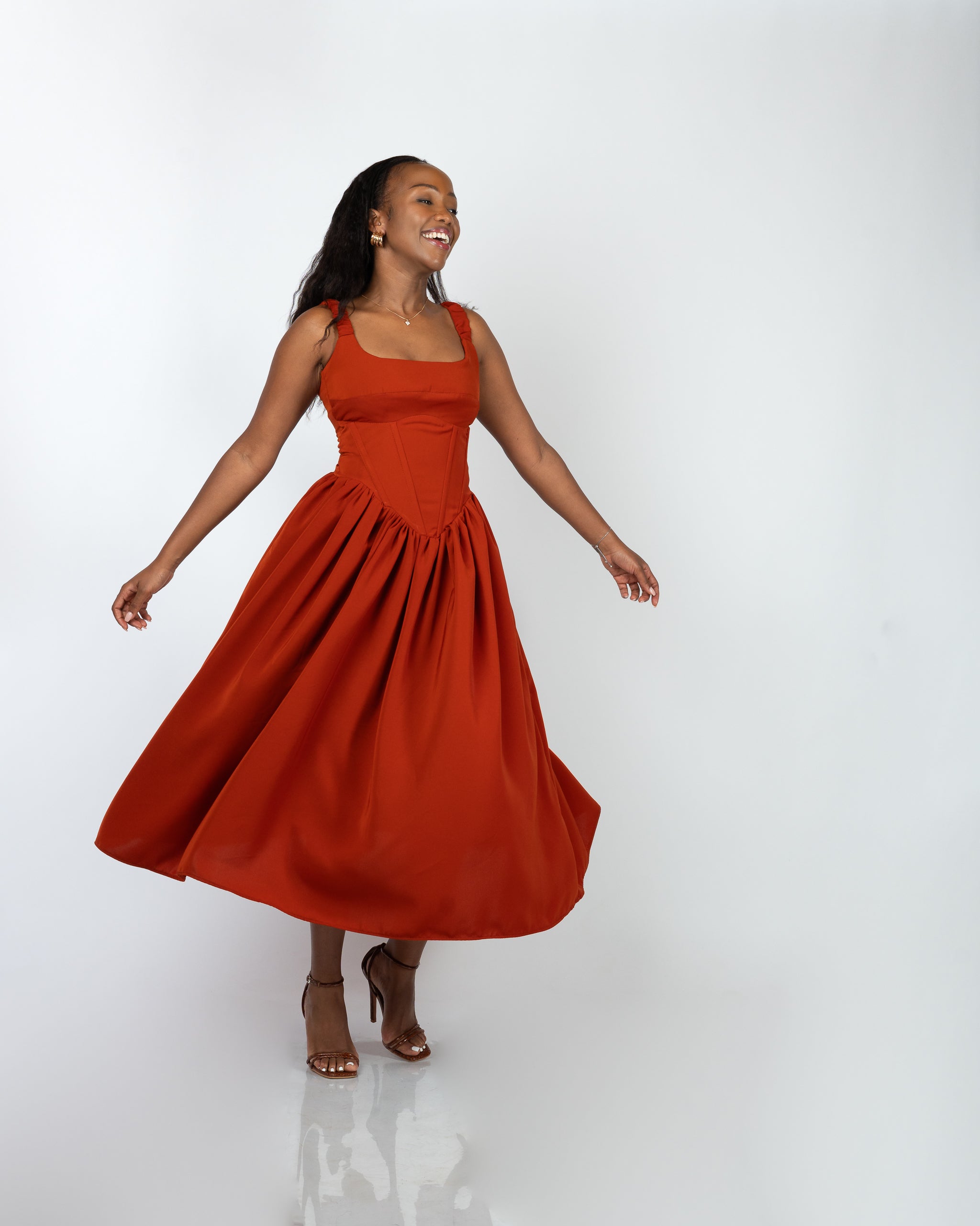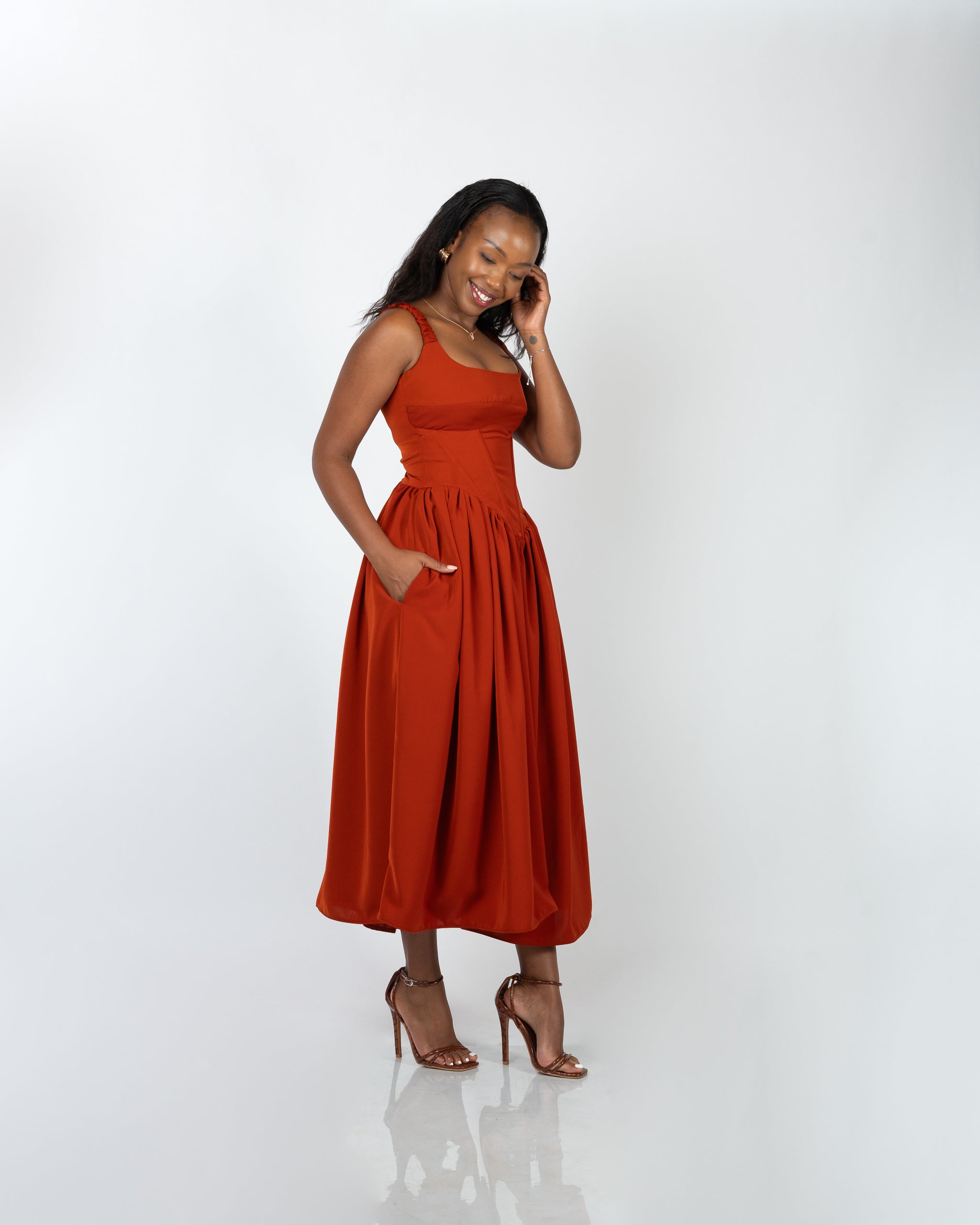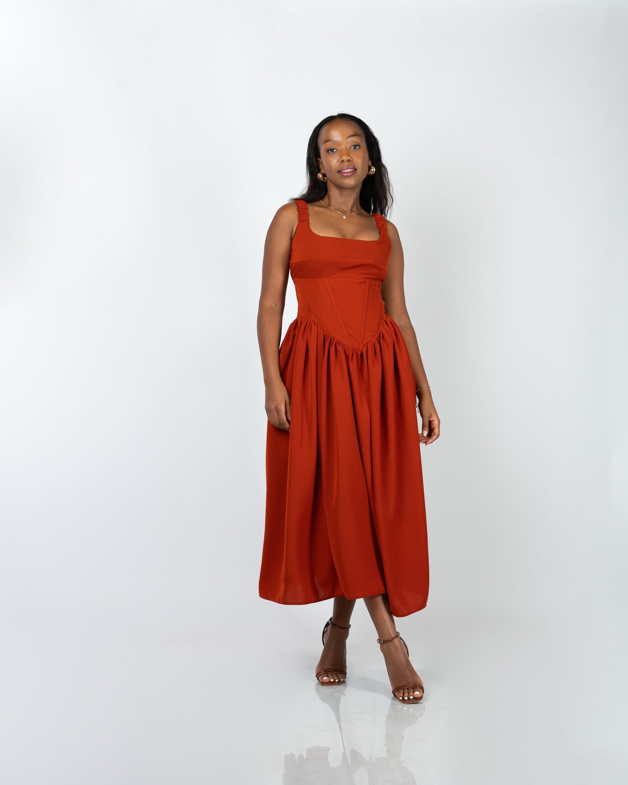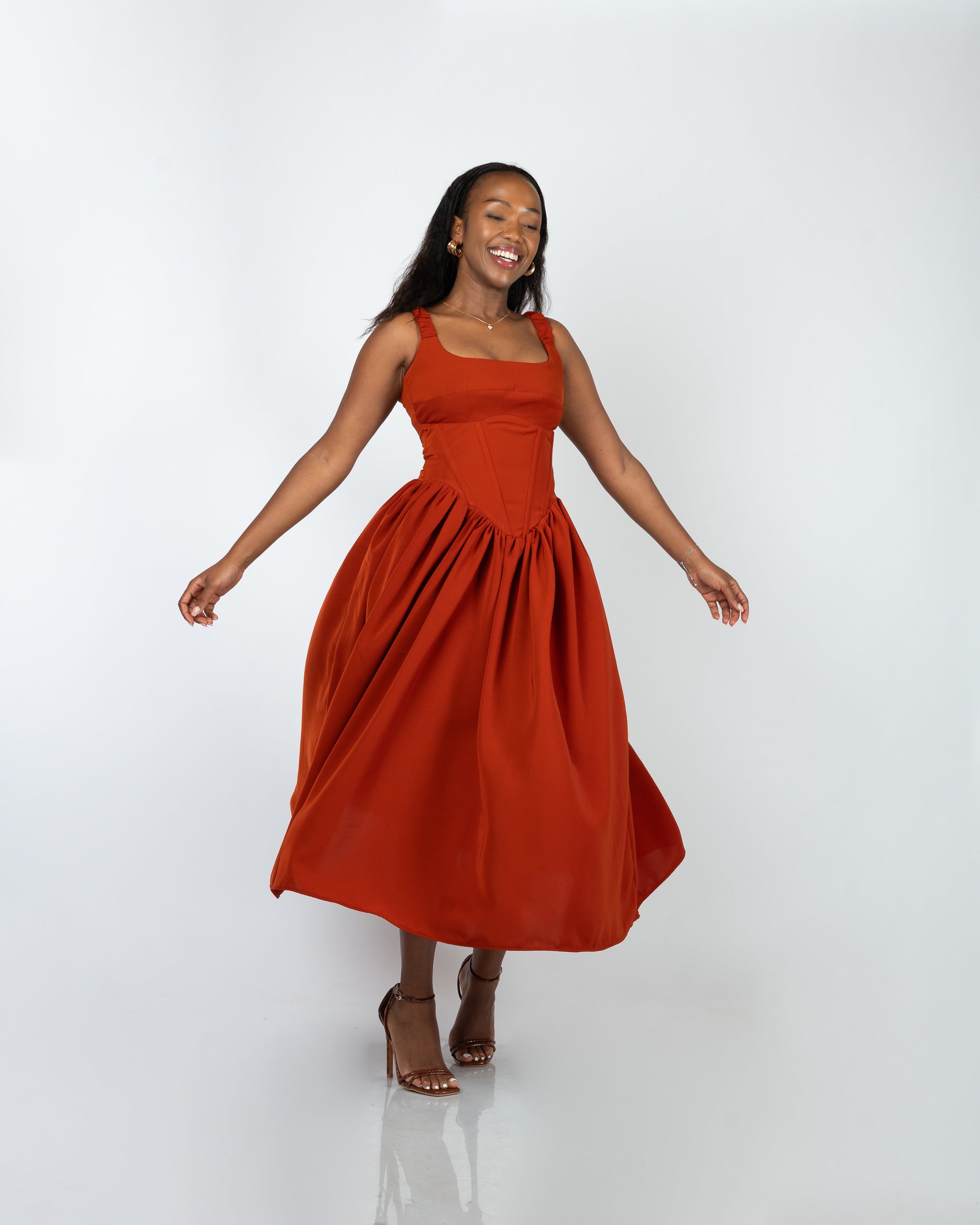 This stunning midi dress in a rich, orange hue is the perfect blend of classic elegance and modern style.