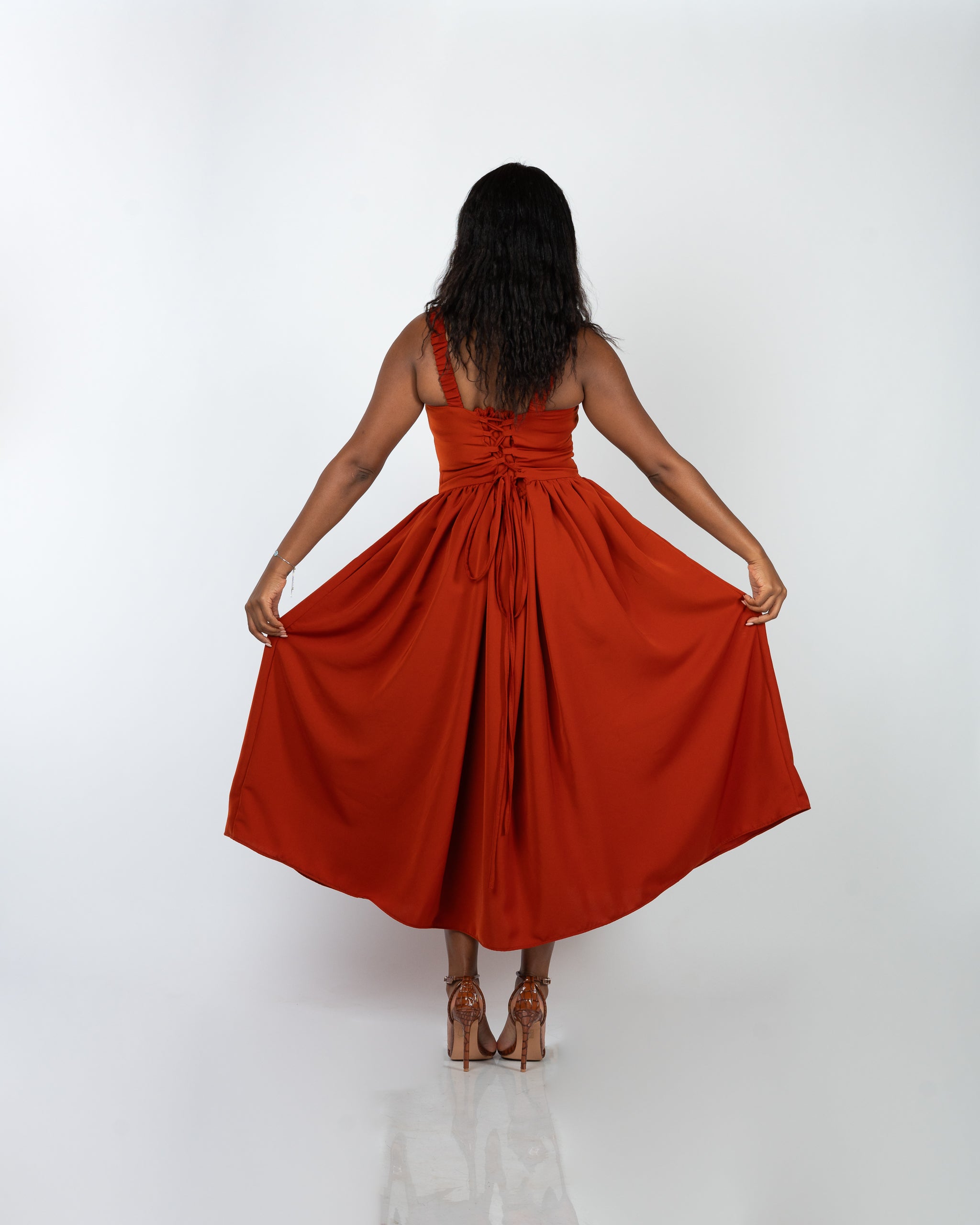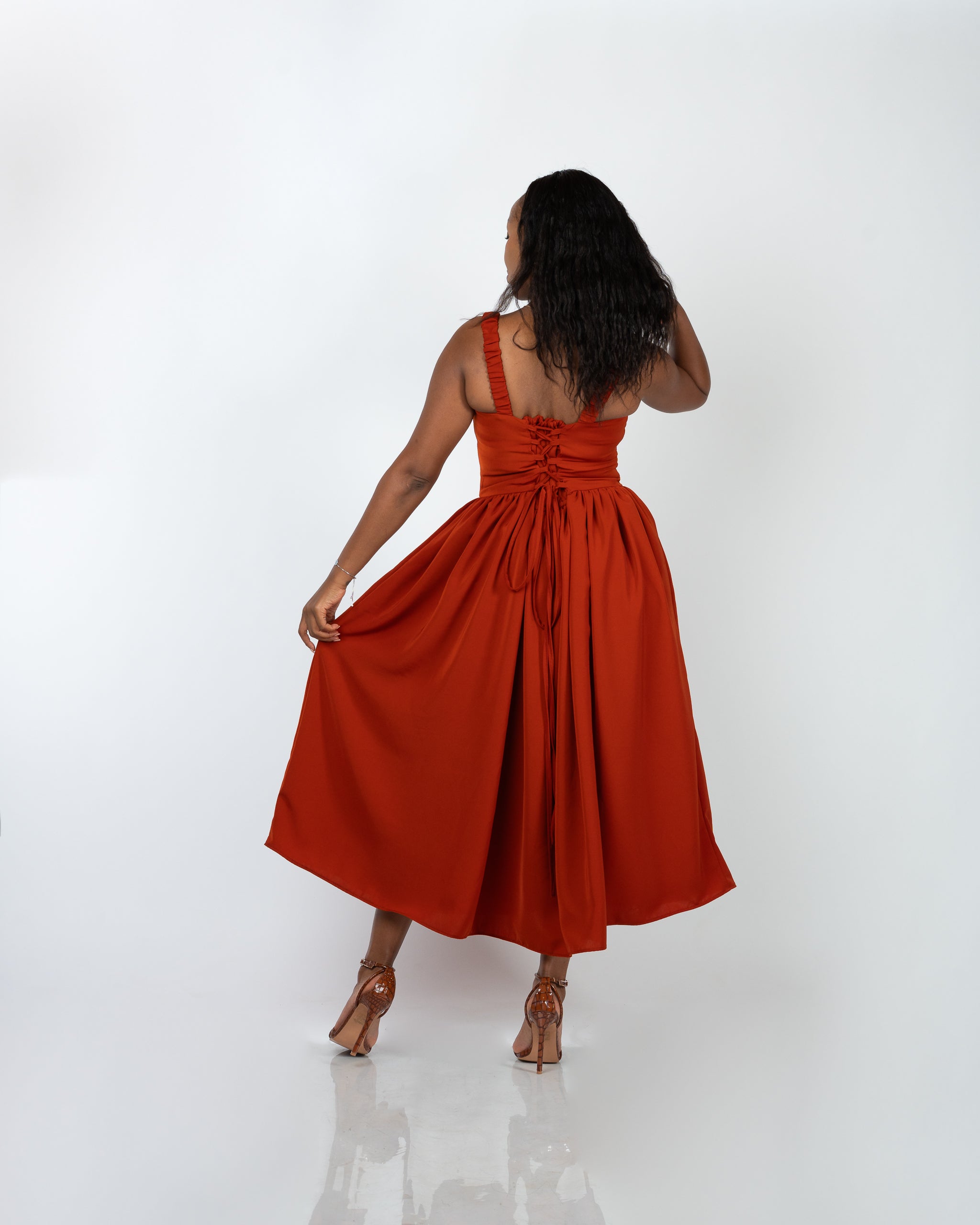 Turn heads as you walk away in this stunning midi dress, featuring a unique and eye-catching back detail. The back showcases a corset-inspired design with delicate lacing that not only adds allure but also serves as the closure, eliminating need for a zipper.