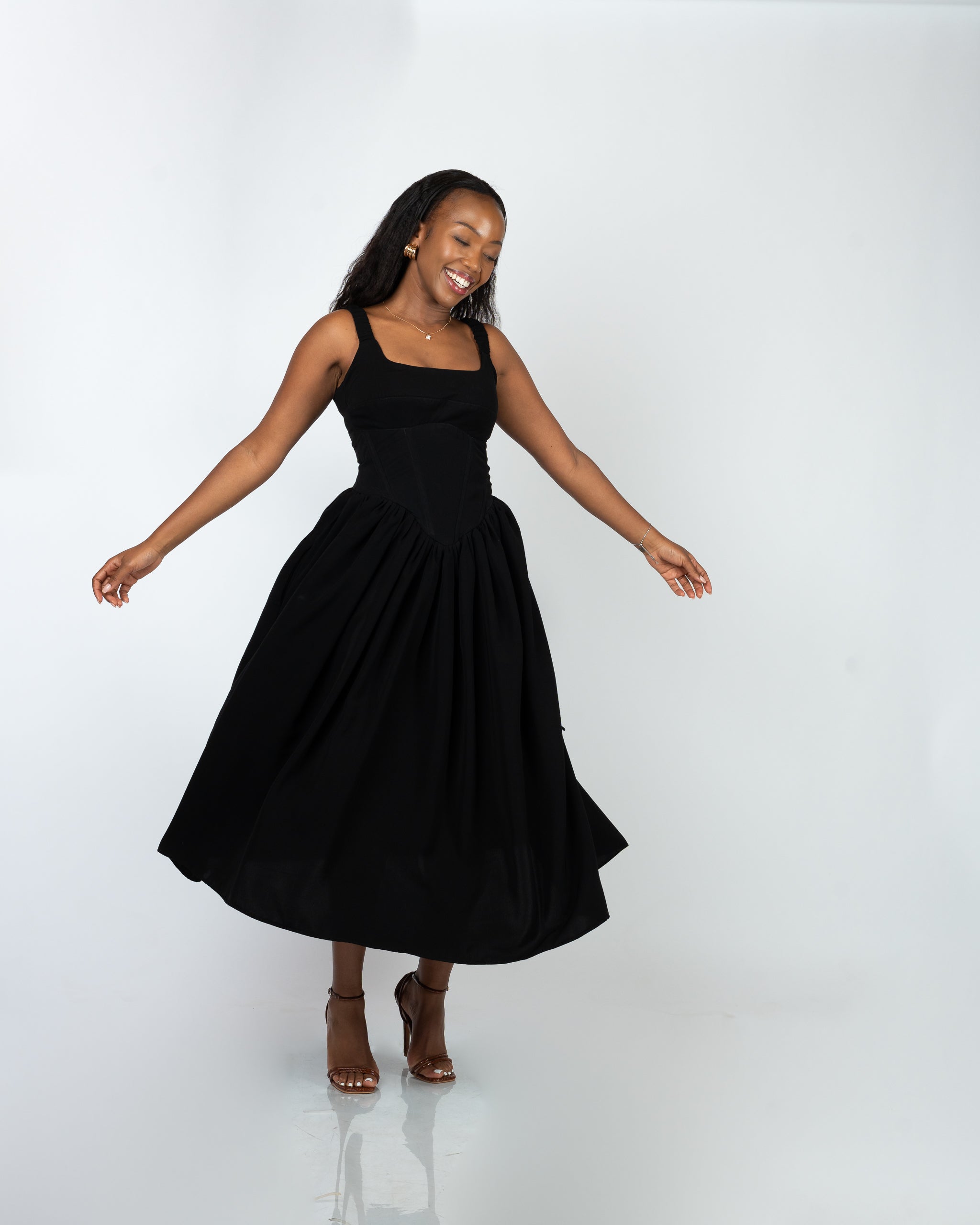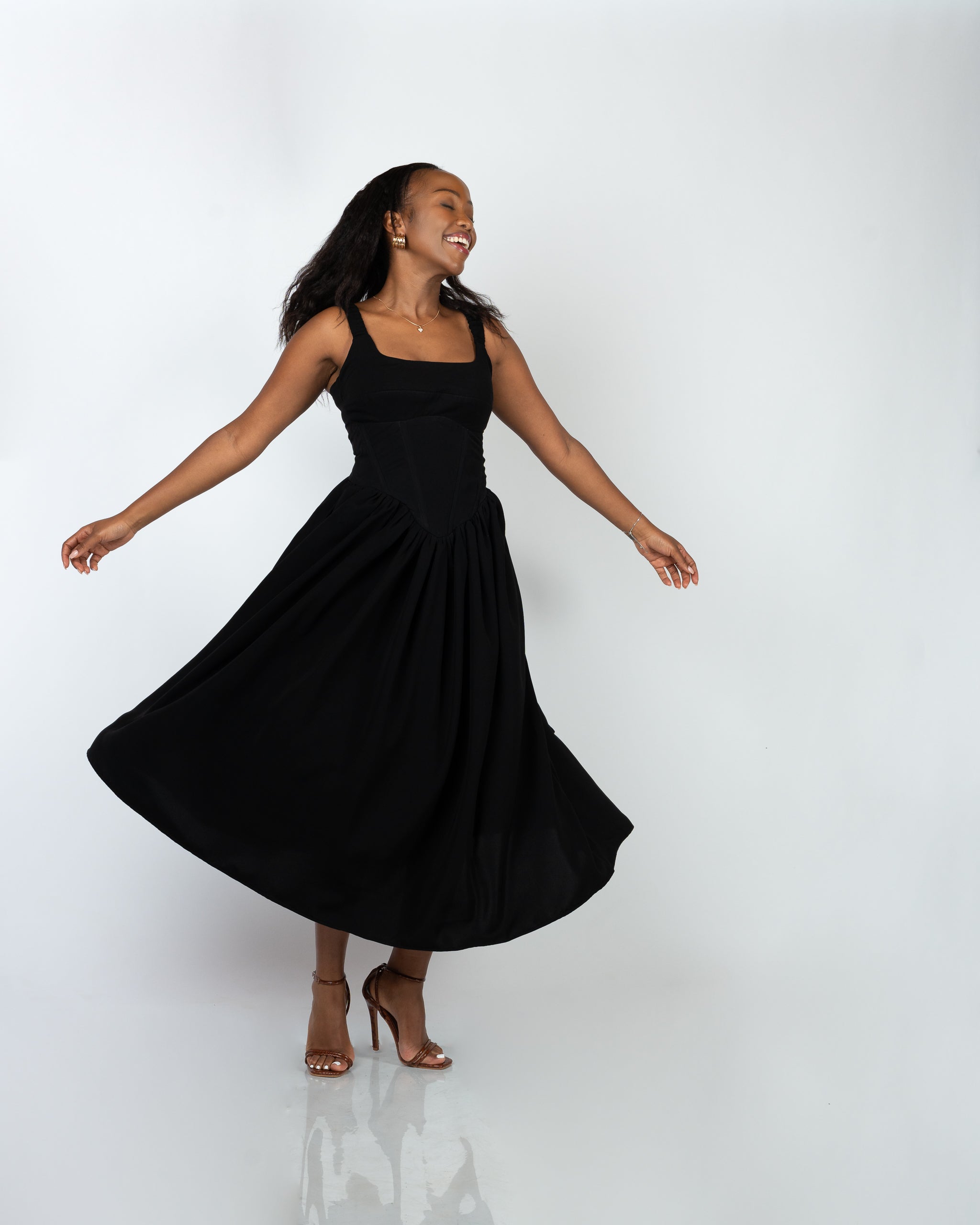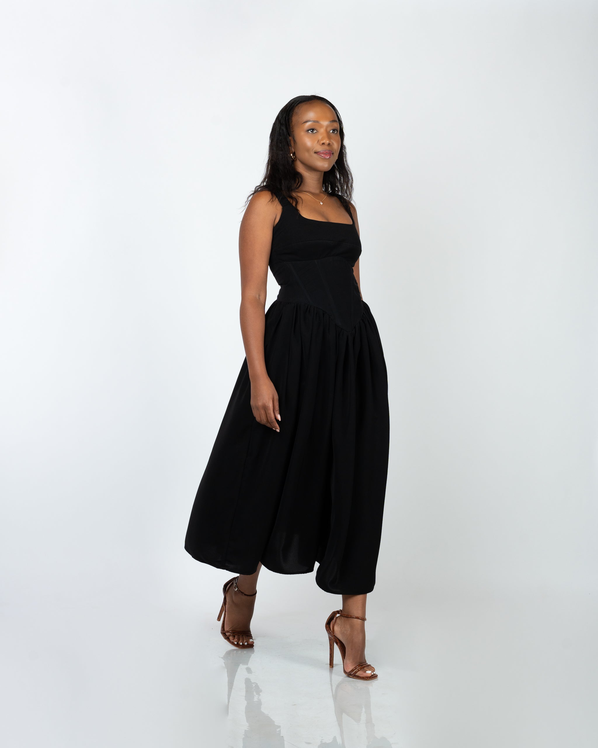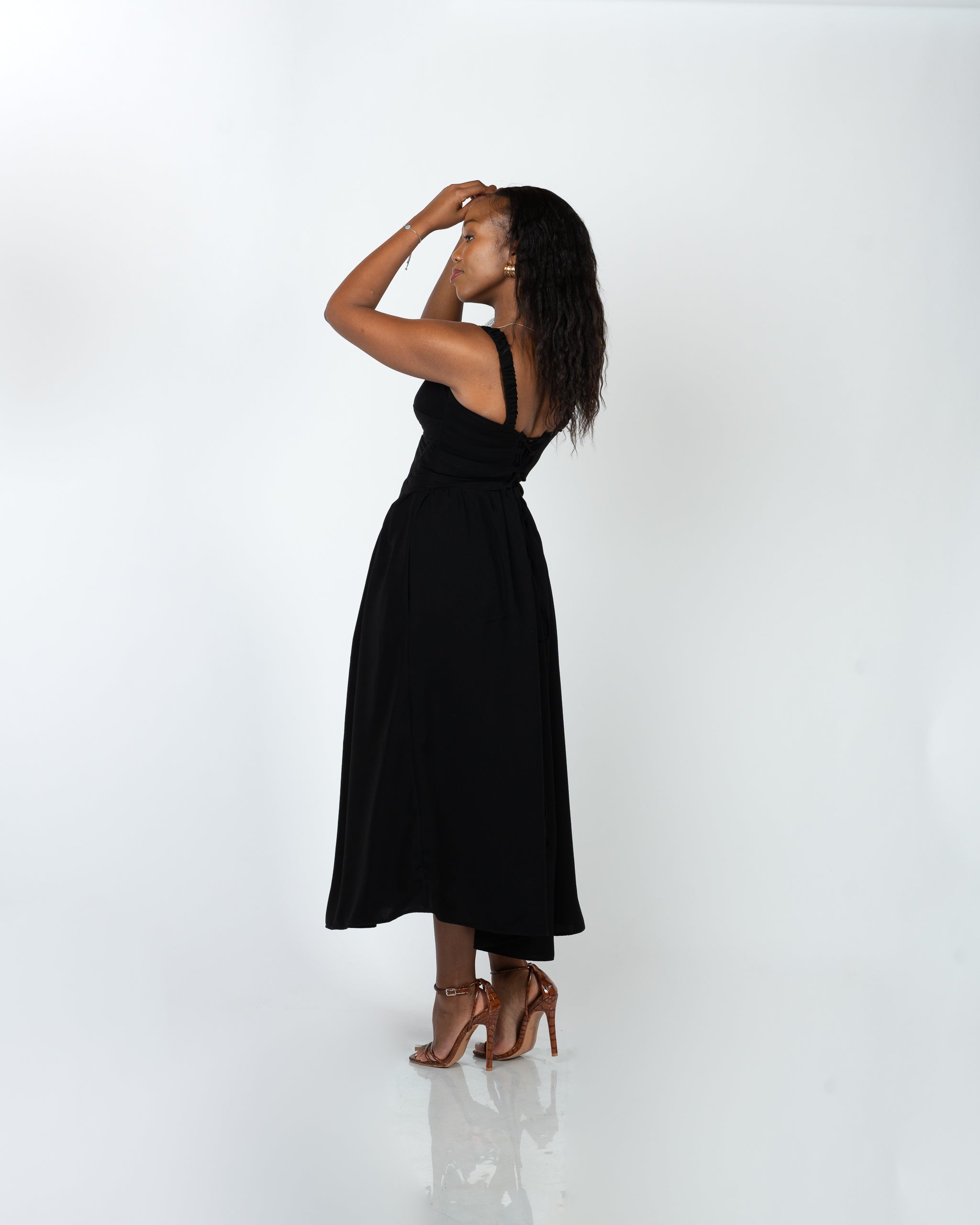 This stunning midi dress in a rich, black hue is the perfect blend of classic elegance and modern style.