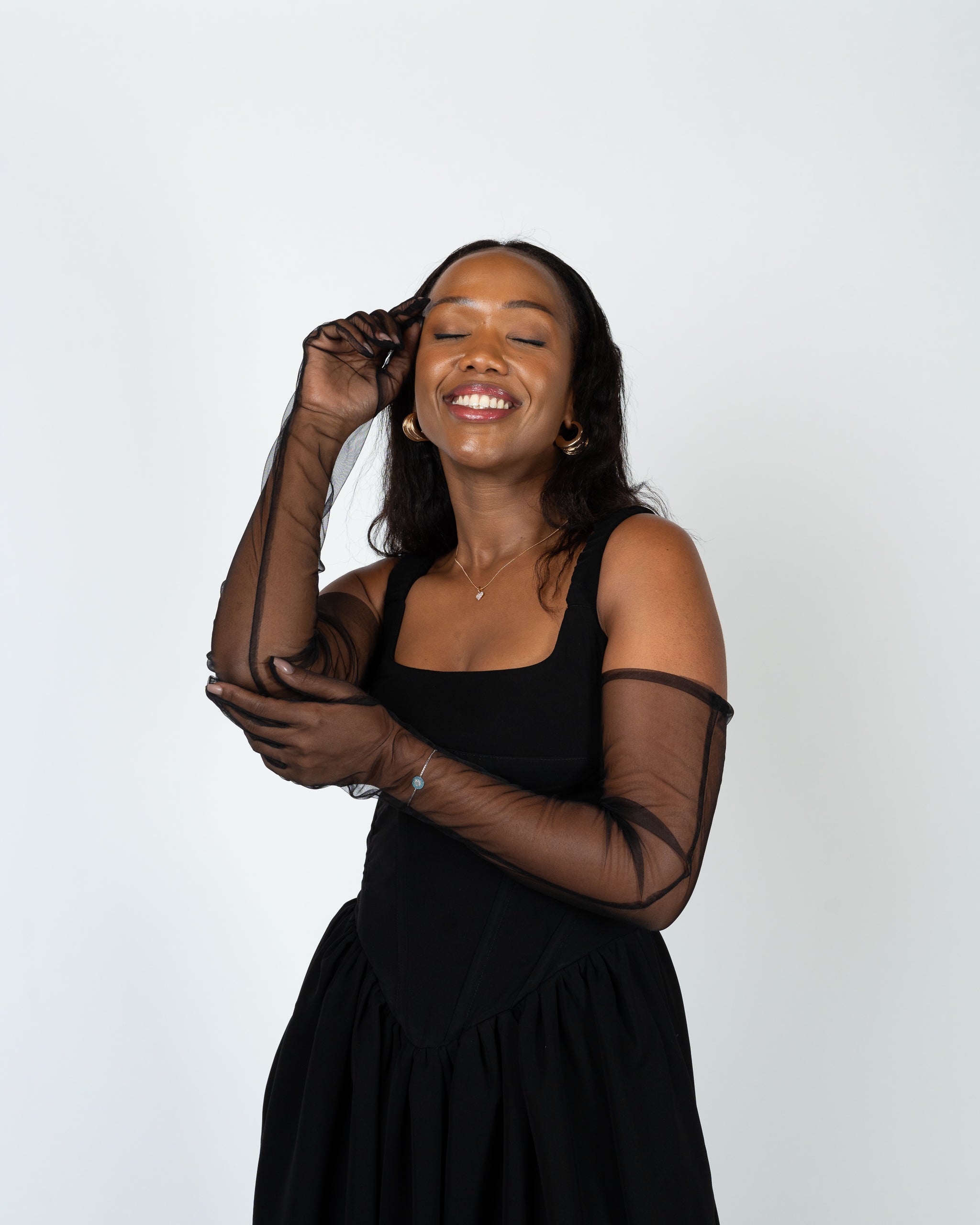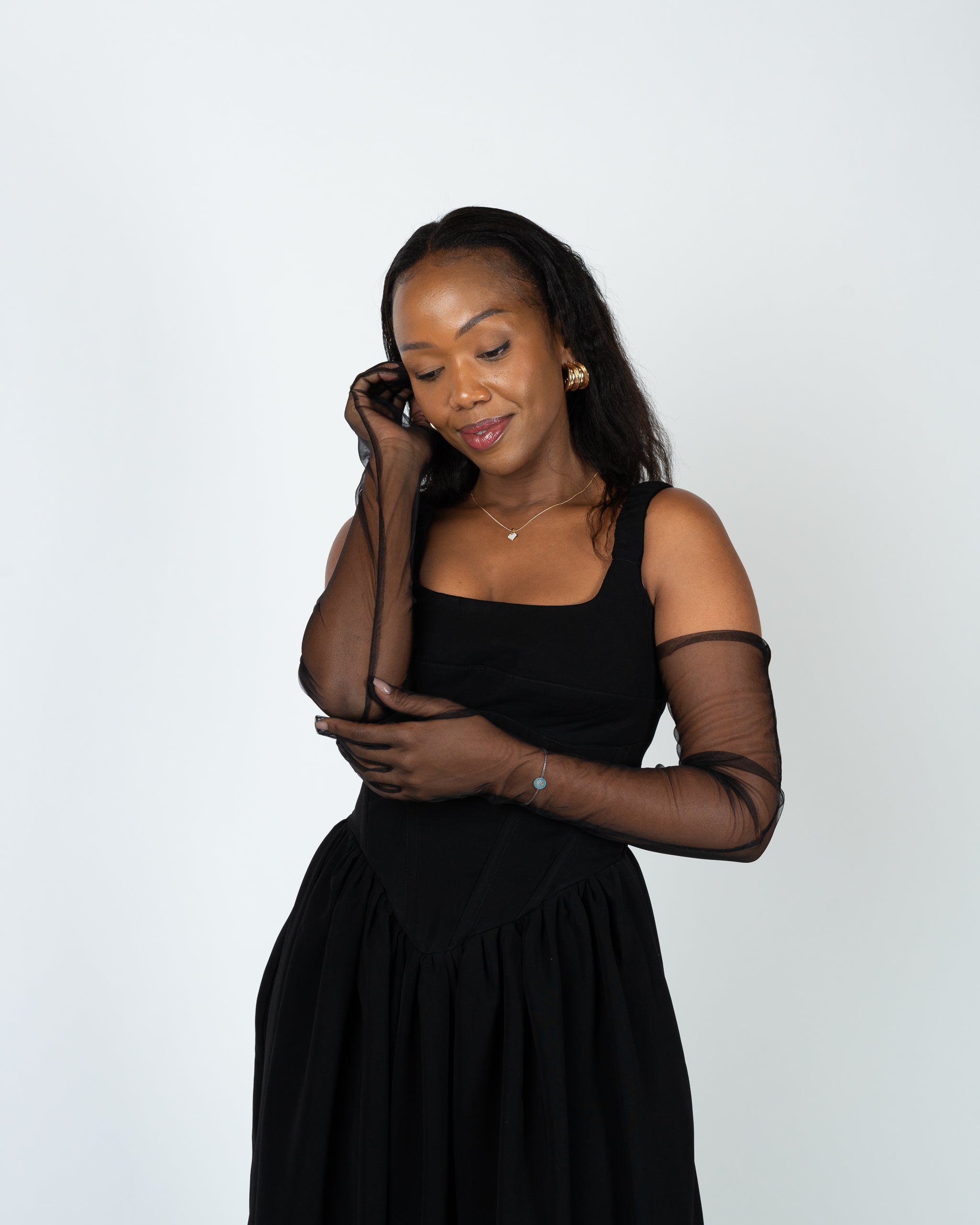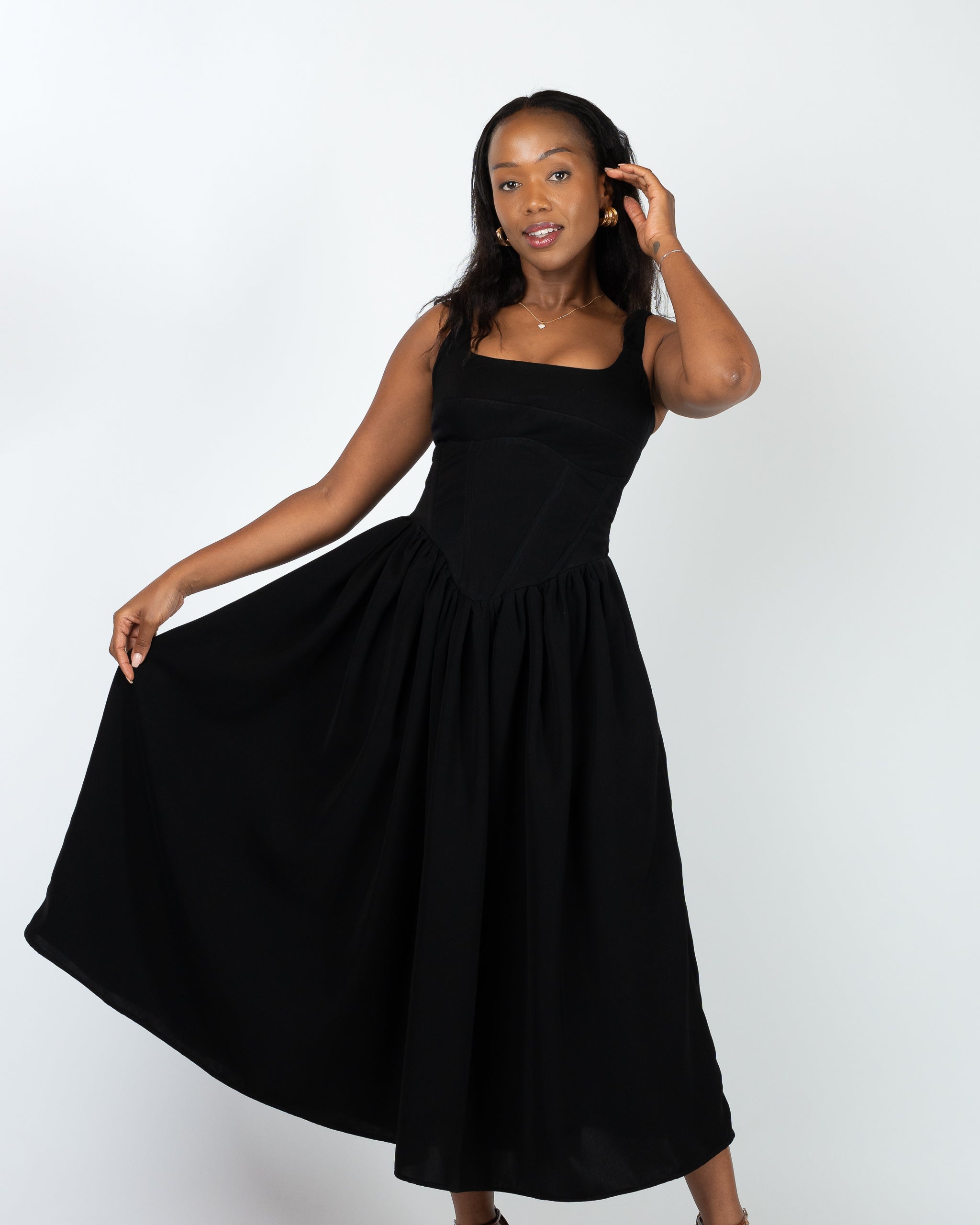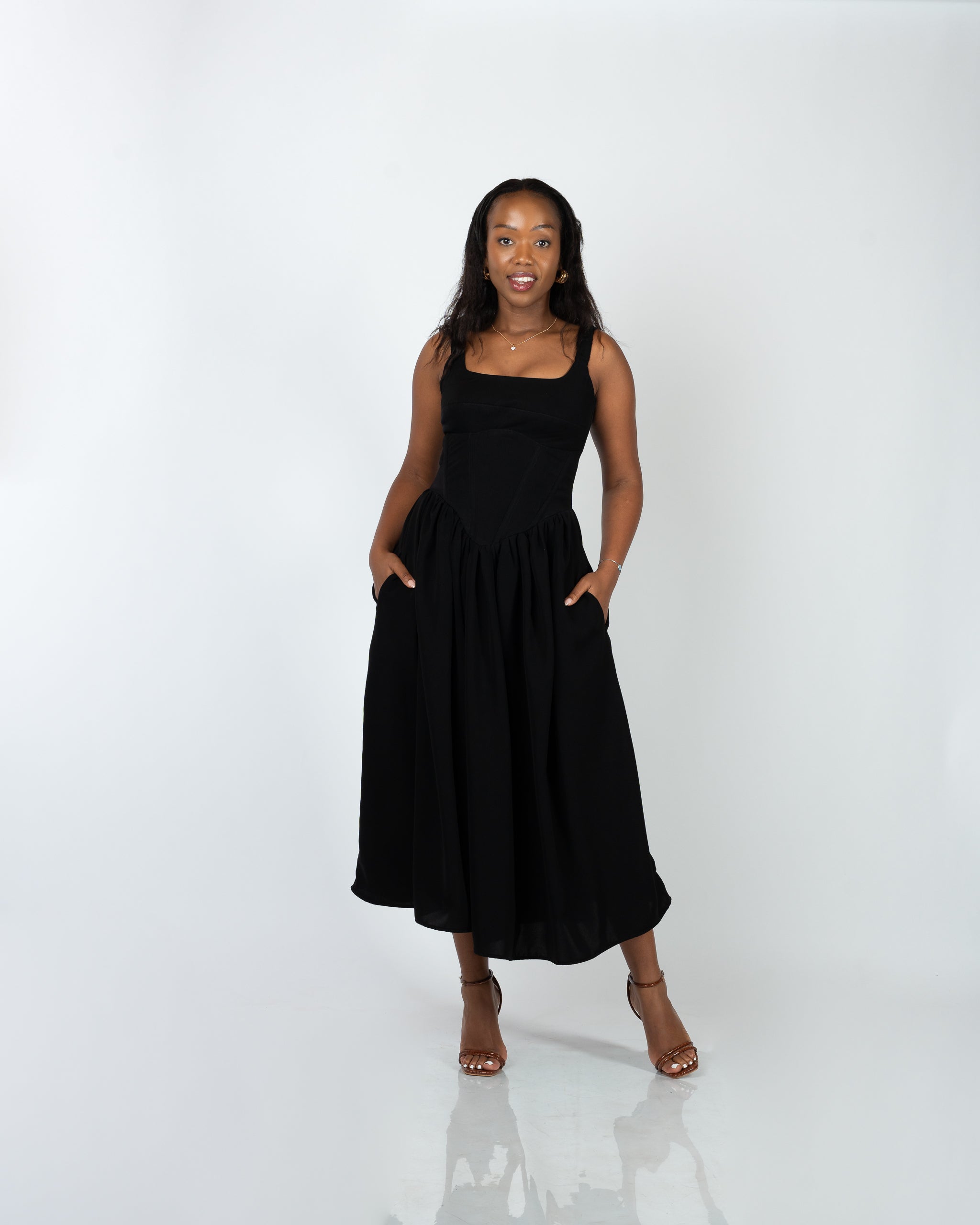 This stunning midi dress in a rich, black hue is the perfect blend of classic elegance and modern style.