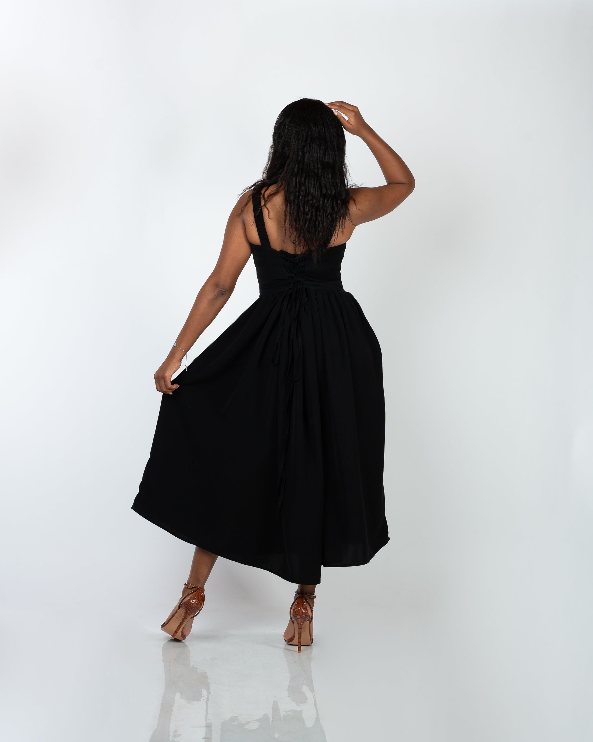 Turn heads as you walk away in this stunning midi dress, featuring a unique and eye-catching back detail. The back showcases a corset-inspired design with delicate lacing that not only adds allure but also serves as the closure, eliminating need for a zipper.
