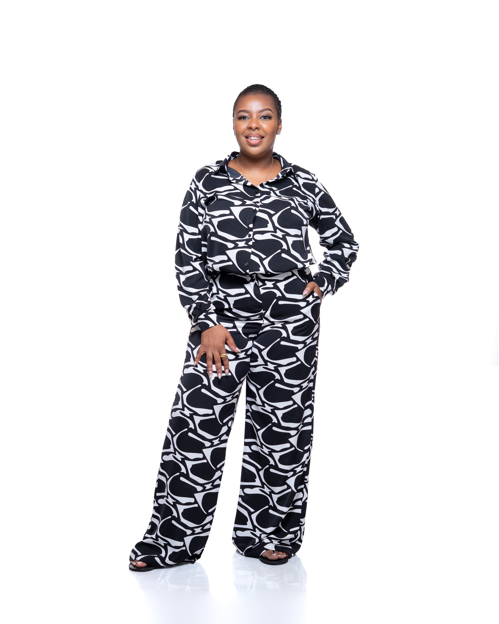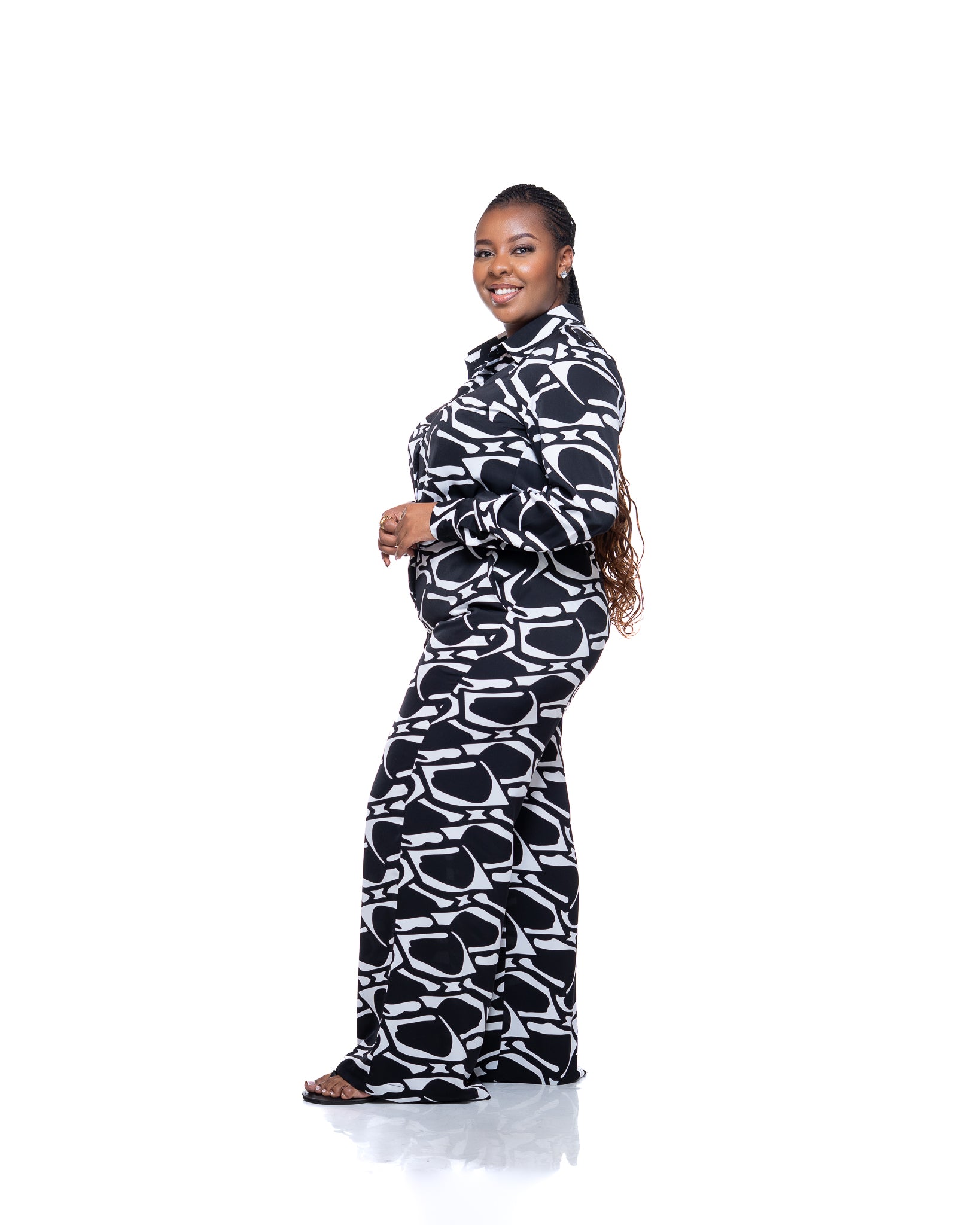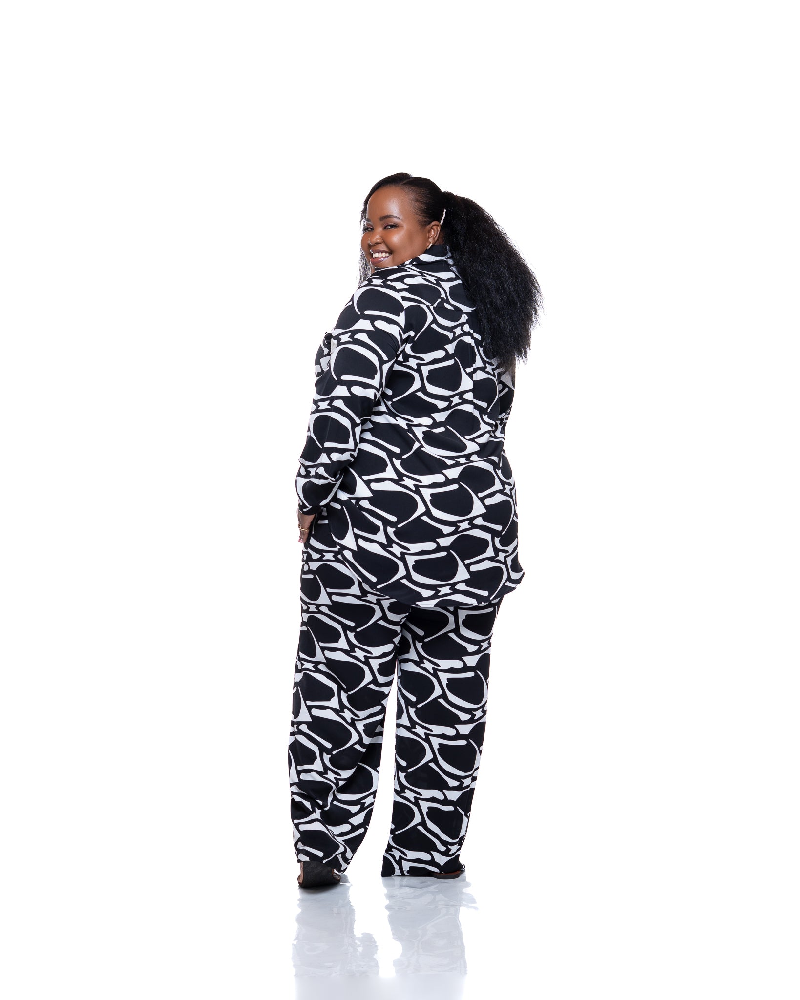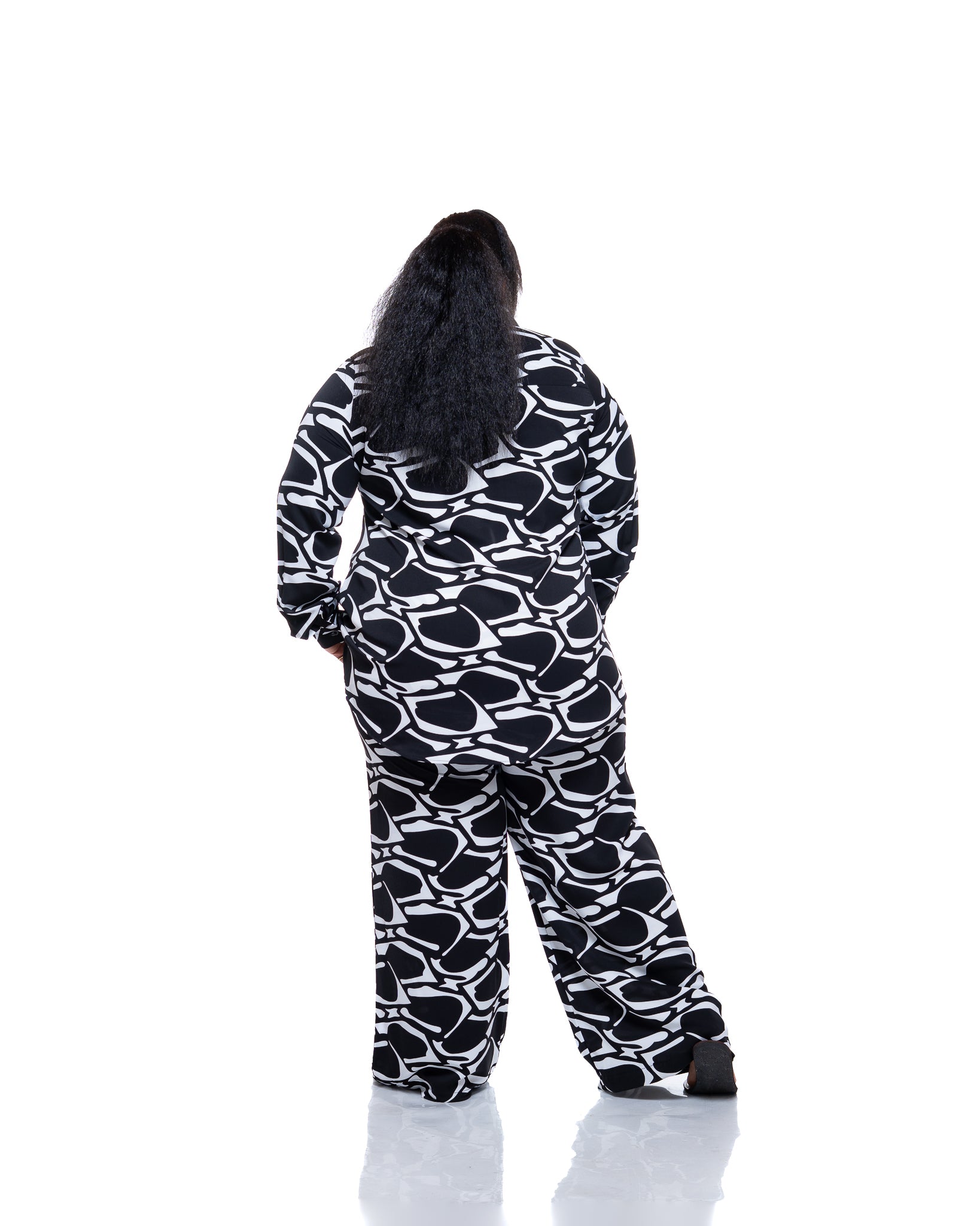 The standout detail is the fluid black-and-white swirl pattern — rhythmic, organic, and visually dynamic against the alabaster base. The result is a piece that feels artistic yet timeless, perfect for pairing with minimal tops or coordinating statement shirts.