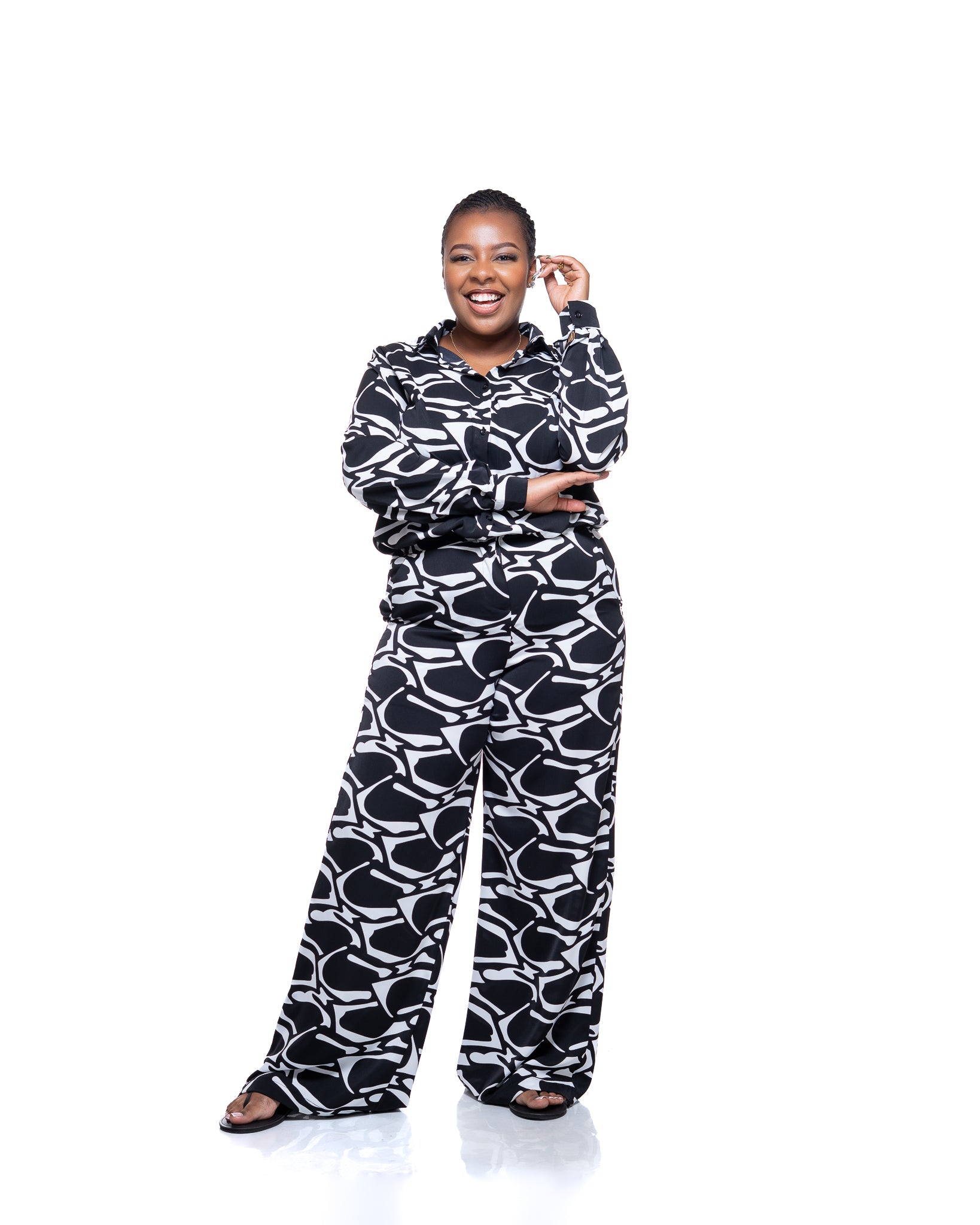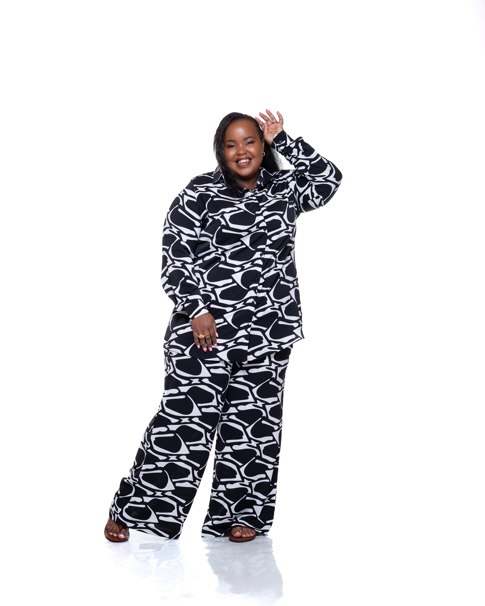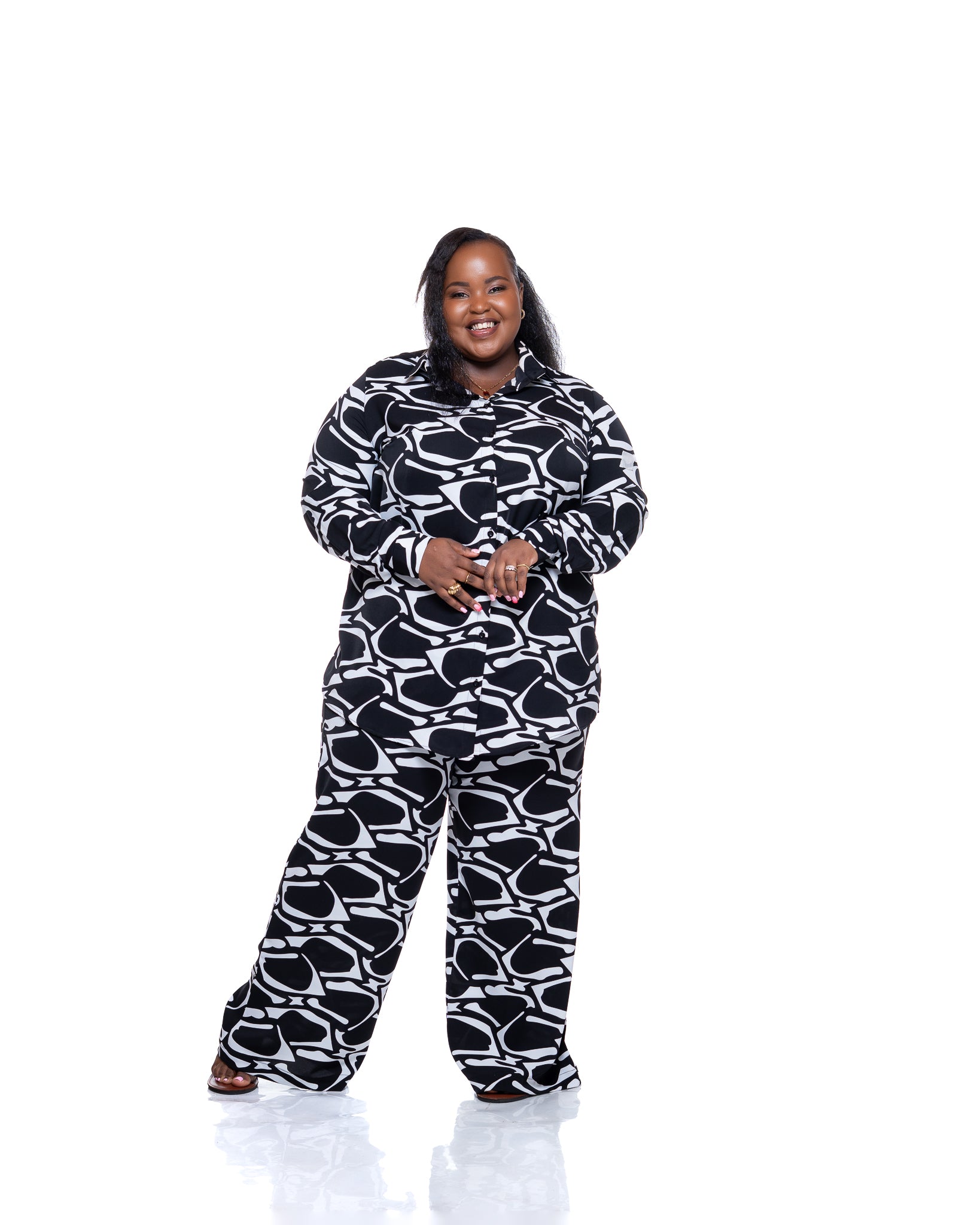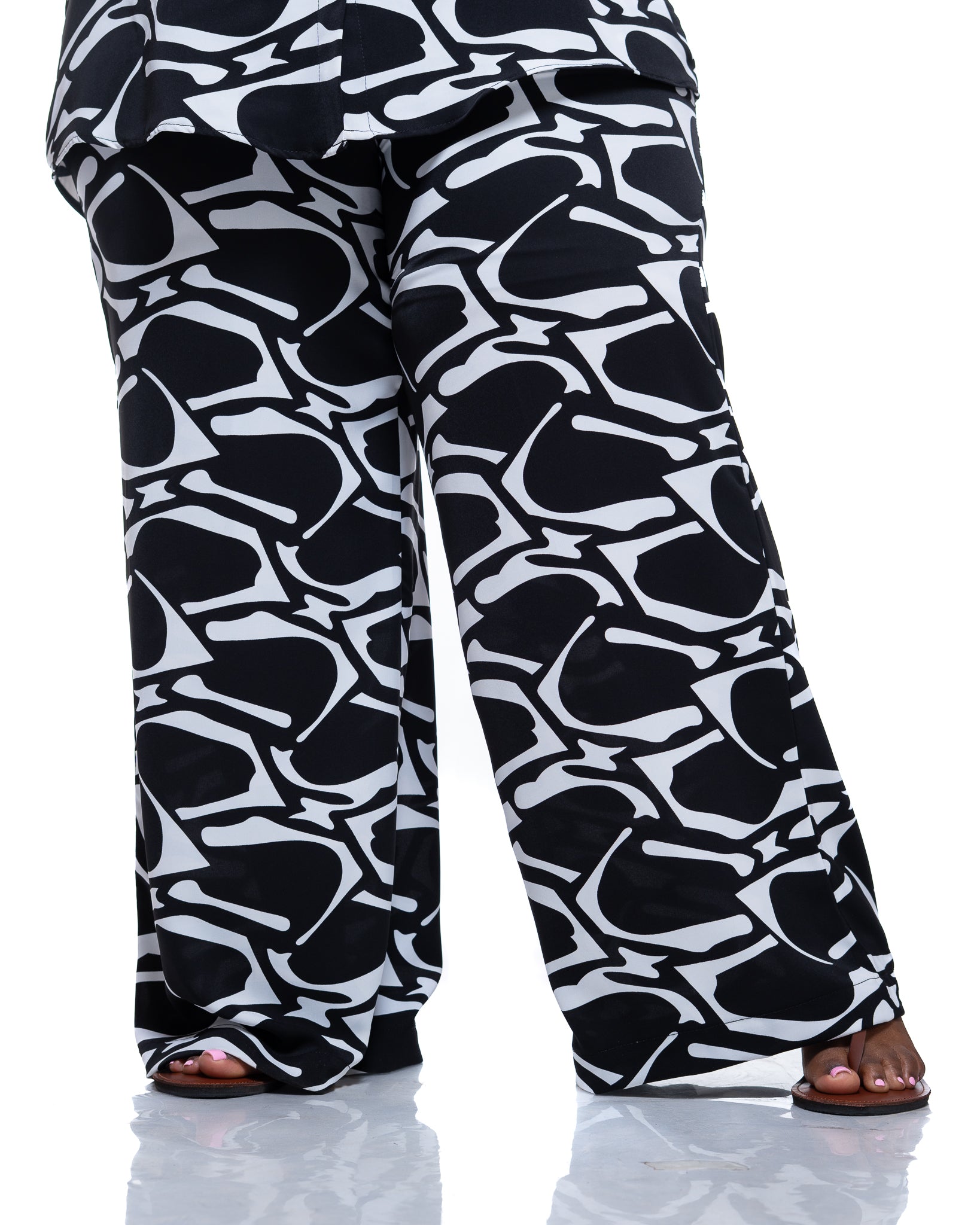 The standout detail is the fluid black-and-white swirl pattern — rhythmic, organic, and visually dynamic against the alabaster base. The result is a piece that feels artistic yet timeless, perfect for pairing with minimal tops or coordinating statement shirts.