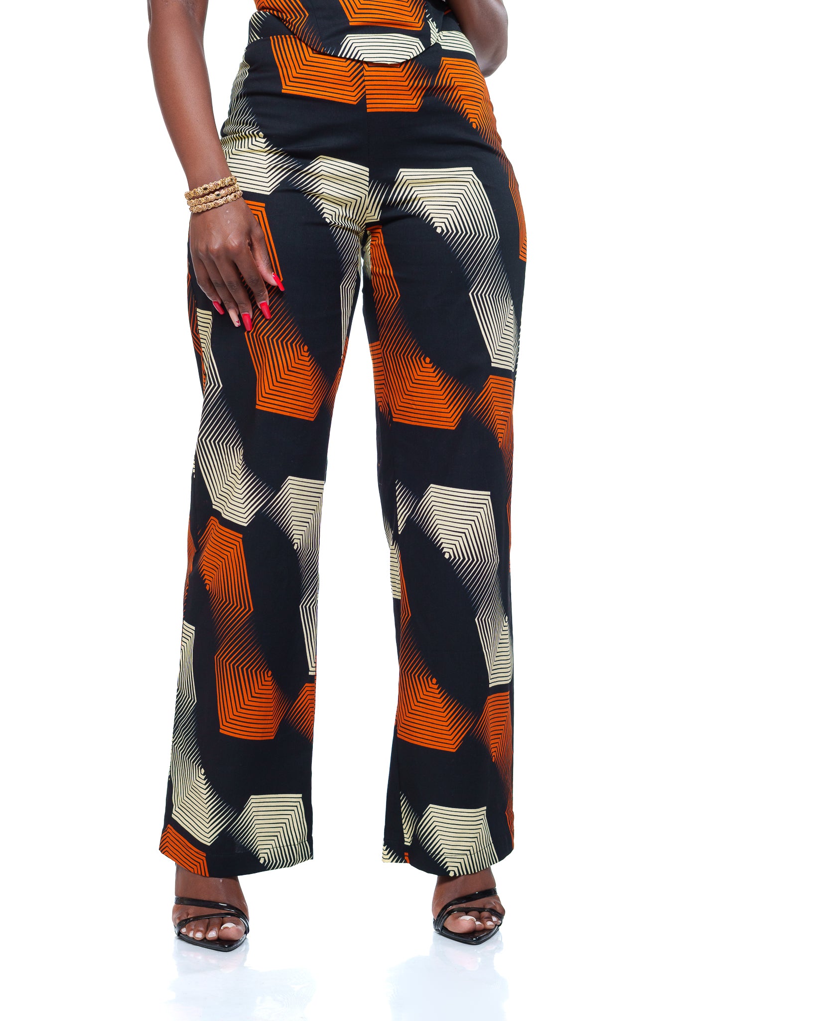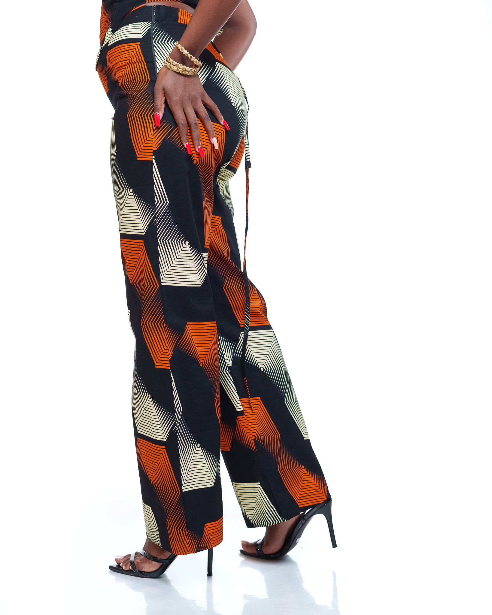 The Luanda Pants in Asili combine bold African-inspired design with effortless comfort. Crafted from 100% organic cotton in a vibrant orange, yellow, and black patterned fabric, these wide-leg pants feature an elastic waistband, hidden zip, and functional pockets. Pair them with the matching Asili top for a coordinated set or mix and match for versatile day-to-night styling.