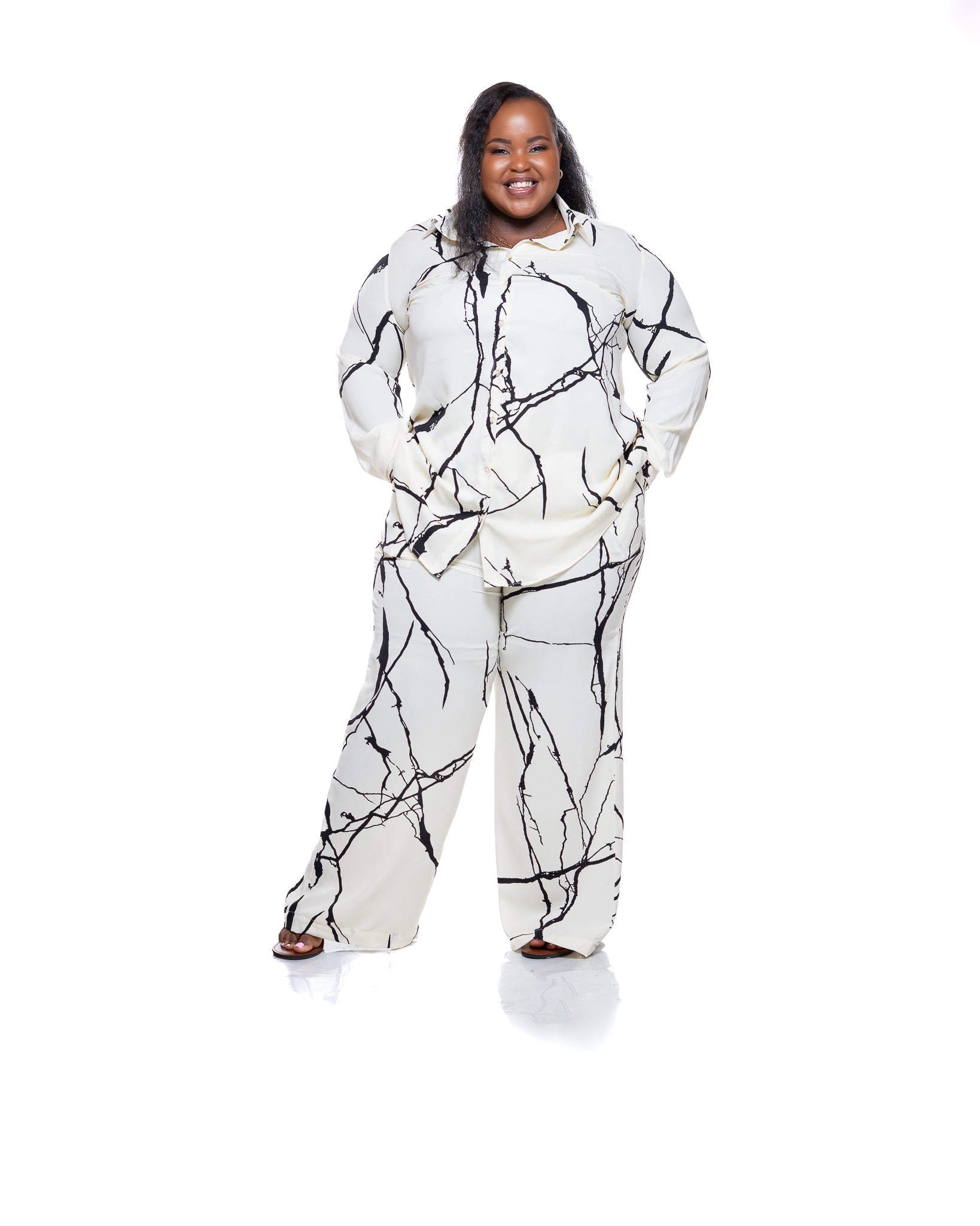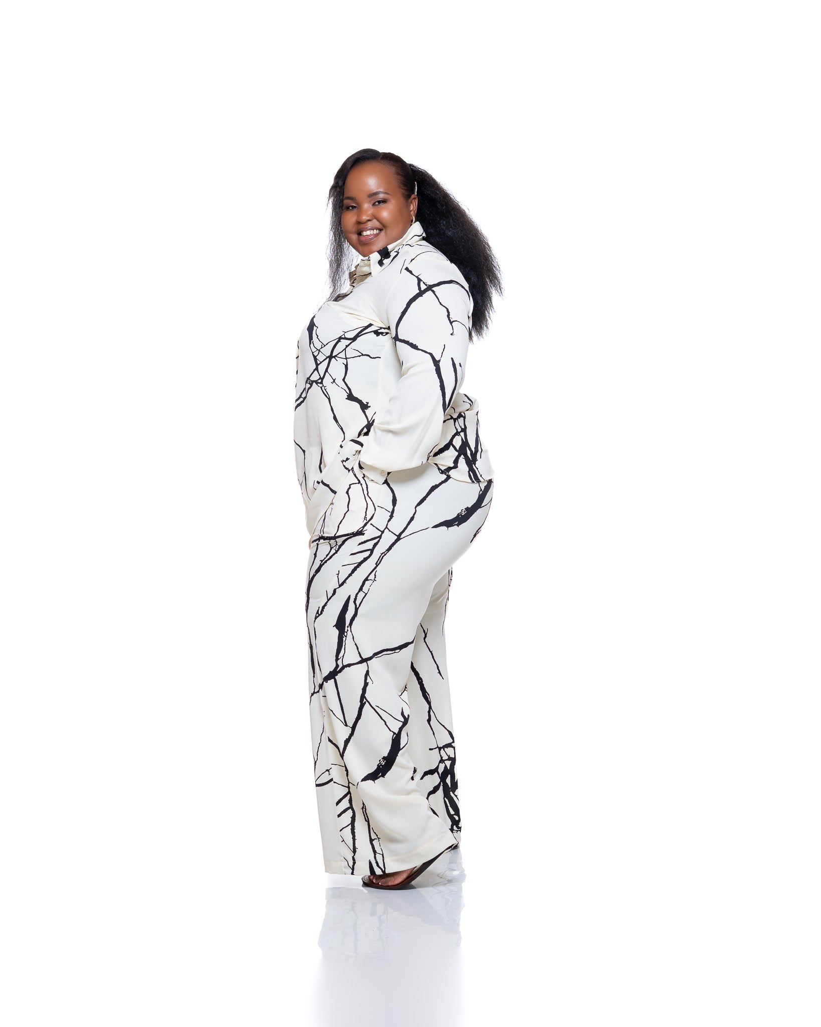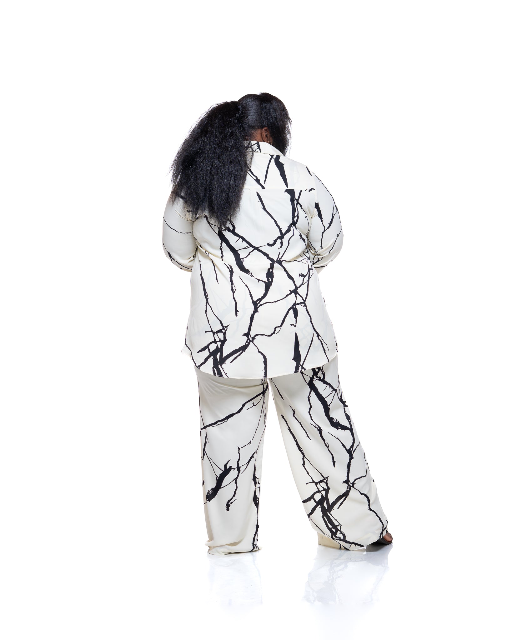 The design is finished with a solid black motif set against a soft cream background, creating a striking yet understated contrast. Whether worn as a matching set or styled on its own, the Monarch Shirt in Marble Mist brings quiet confidence and versatility to everyday dressing.
