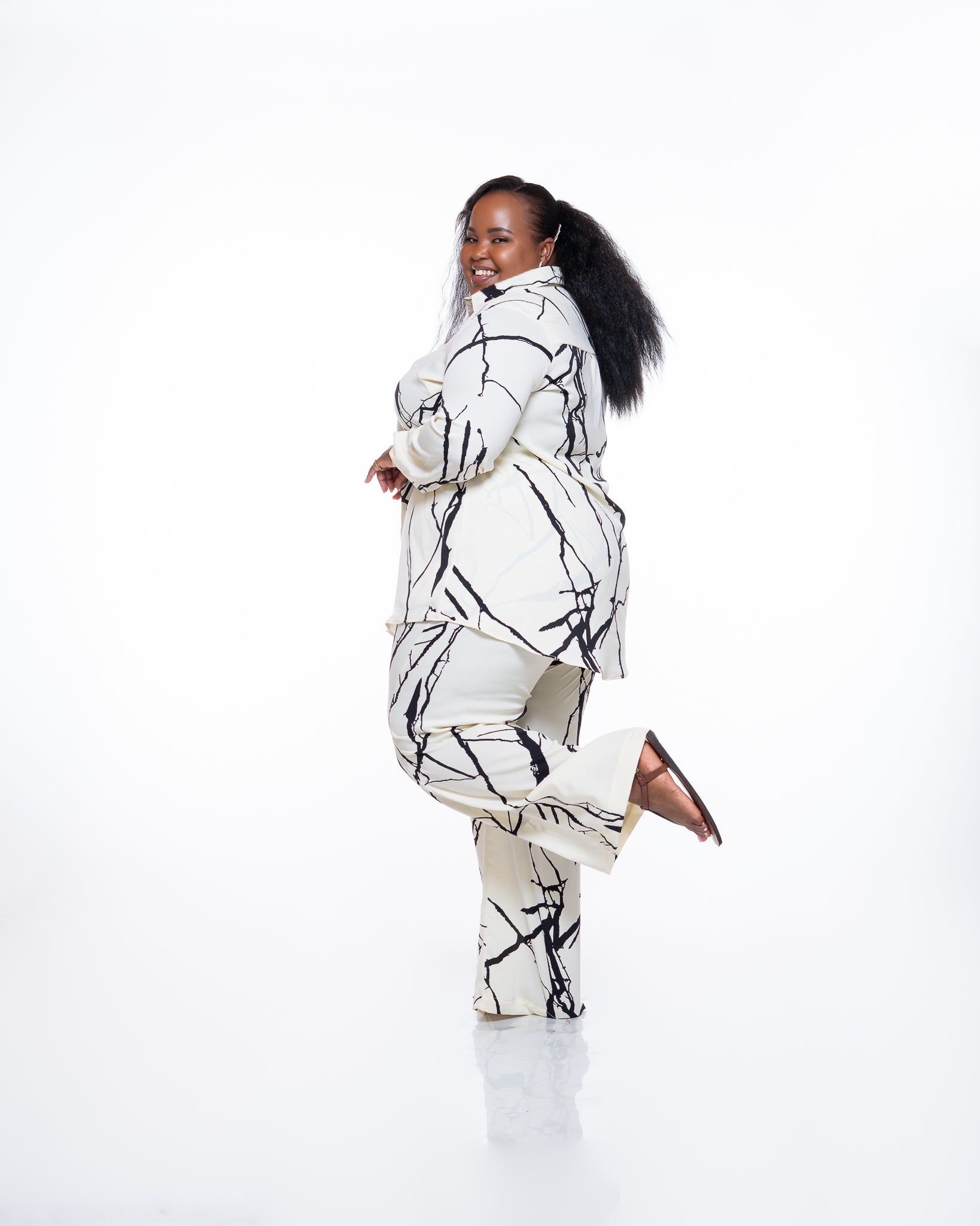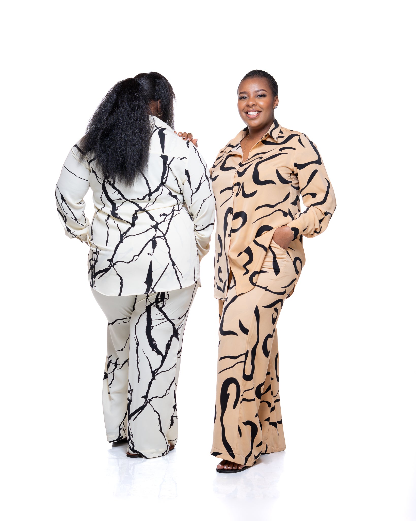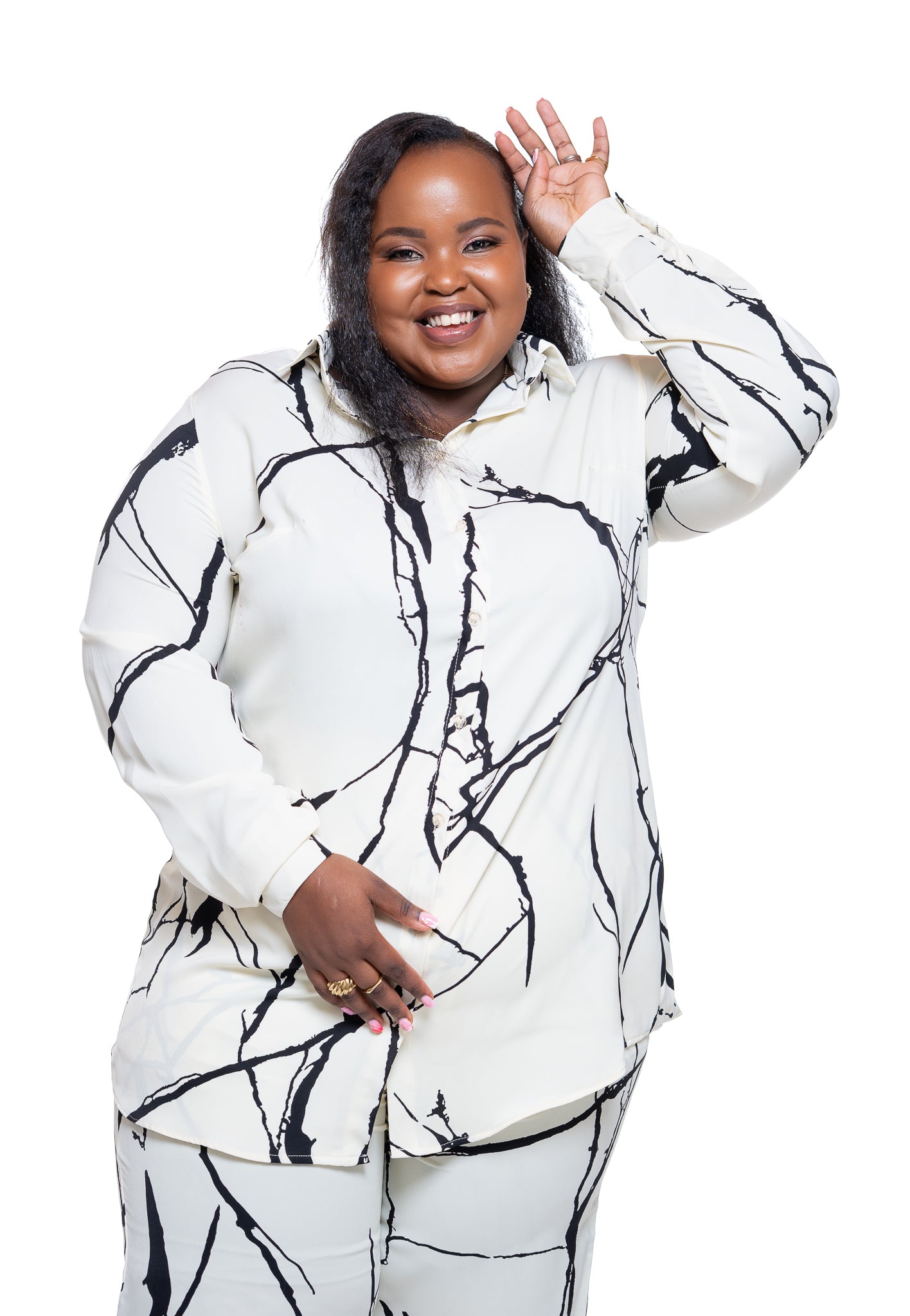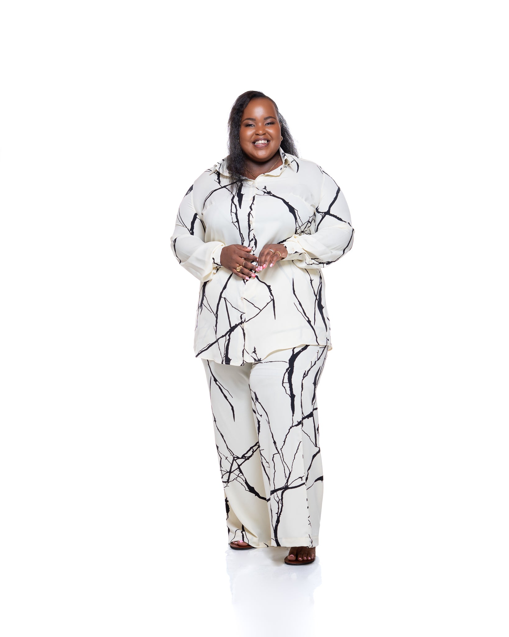 The design is finished with a solid black motif set against a soft cream background, creating a striking yet understated contrast. Whether worn as a matching set or styled on its own, the Monarch Shirt in Marble Mist brings quiet confidence and versatility to everyday dressing.
