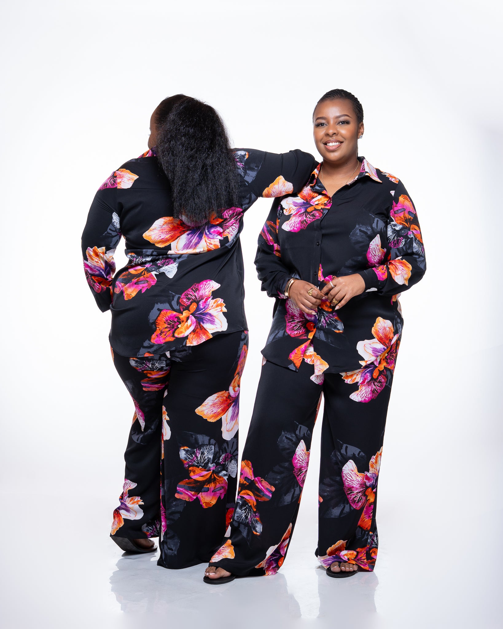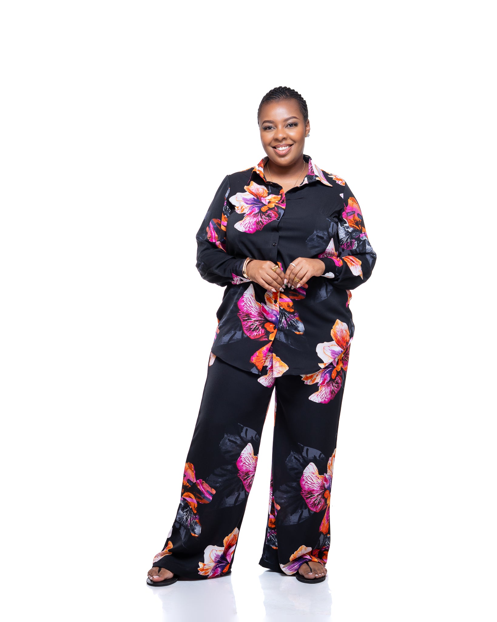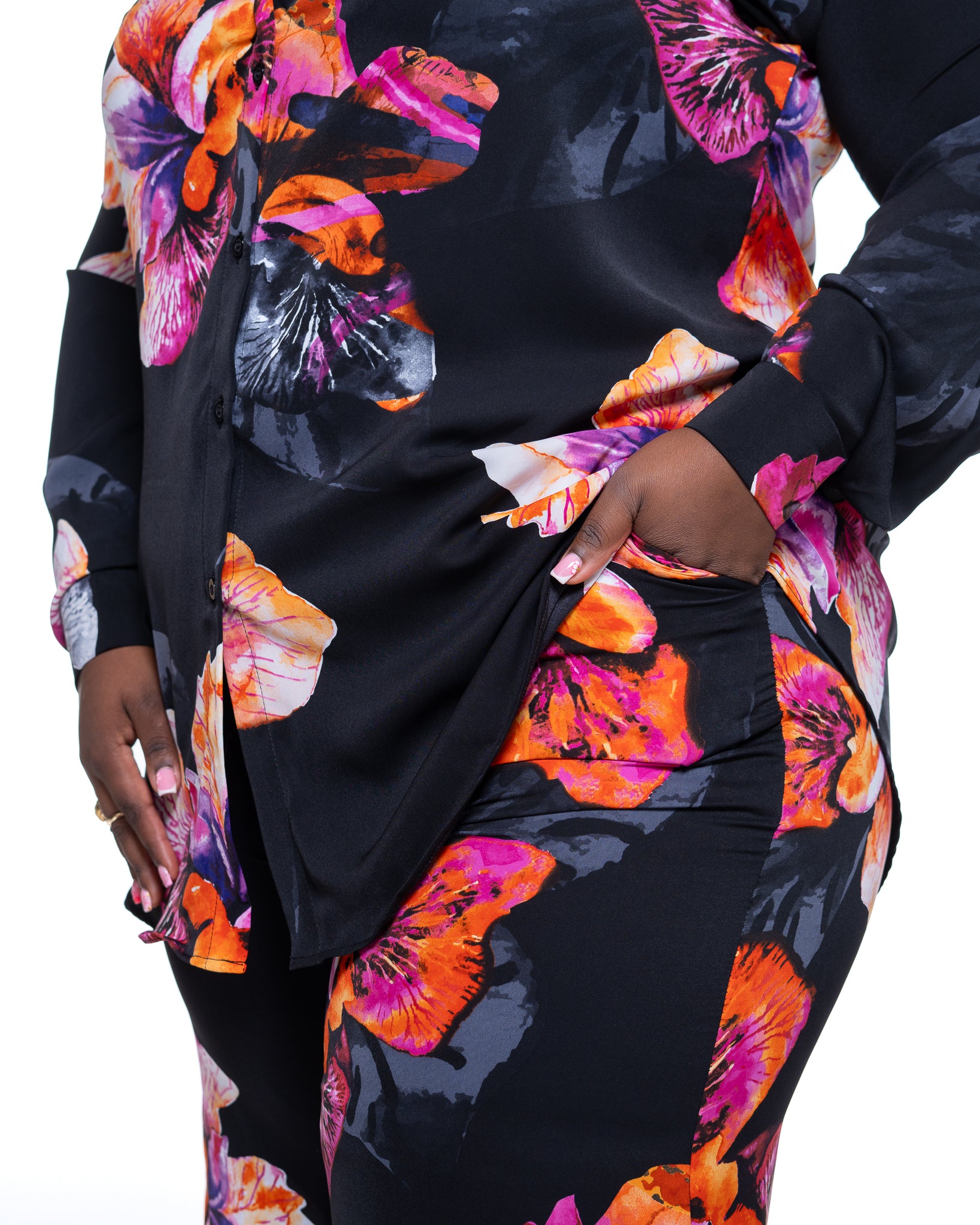 The standout bold floral pattern set against a deep black base creates striking contrast and visual depth. Whether styled as a matching set or worn on its own, the Monarch Shirt in Raya brings confident expression and versatility to everyday dressing.