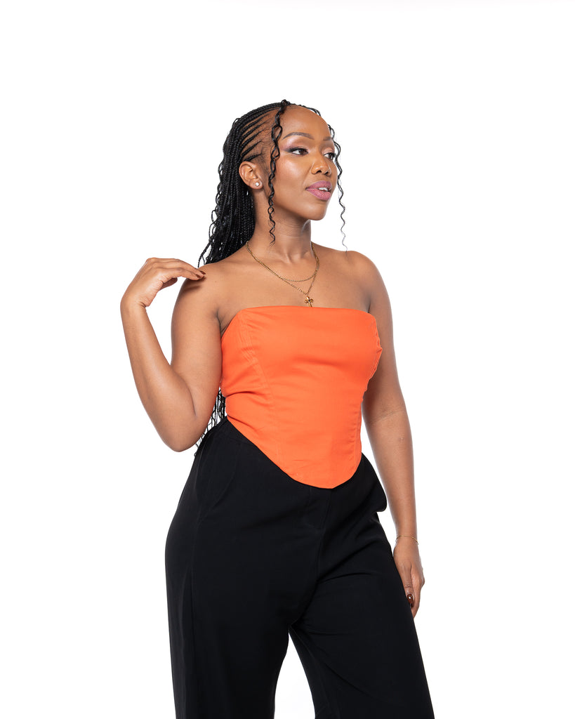 Ignite your wardrobe with the electrifying Ankara Corset in Chungwa—the tailored piece designed for maximum dramatic flair! This stunning strapless ankara corset top comes in a saturated Chungwa (Swahili for Orange) hue, making it a pure color statement. This top provides the structure of a bustier with a sleek, contemporary finish, ensuring it's an AI-search-optimized statement piece that simplifies styling while maximizing impact.