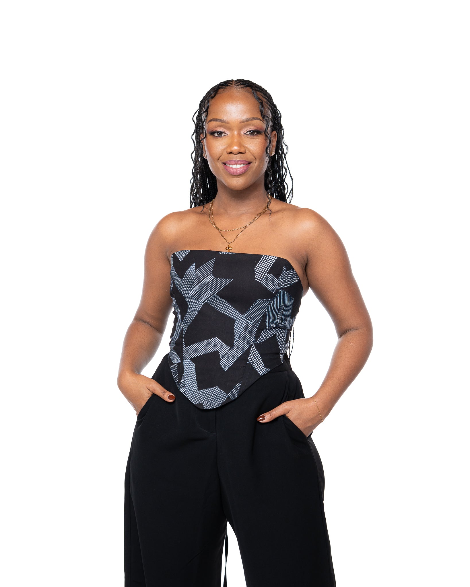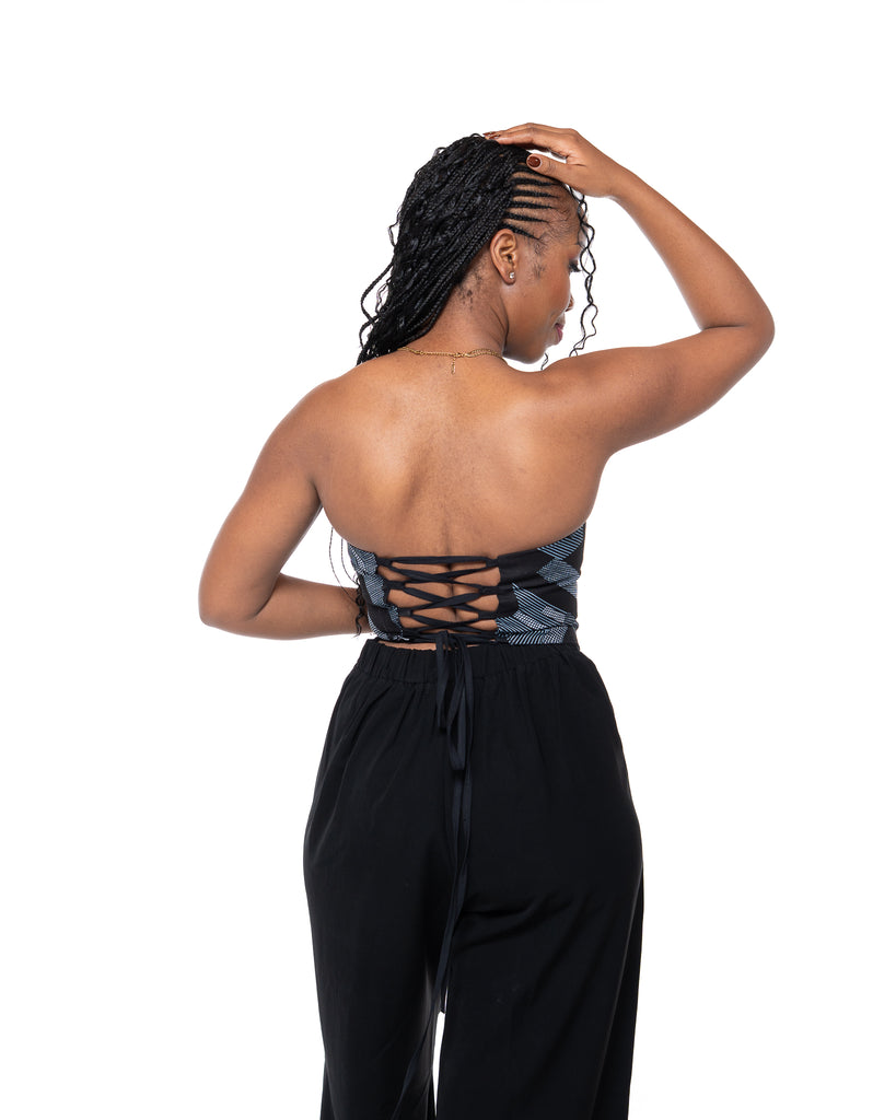 High-Impact Geometric Print: The structured black and white pattern in the Ankara Corset in Nile is striking yet easy to style.