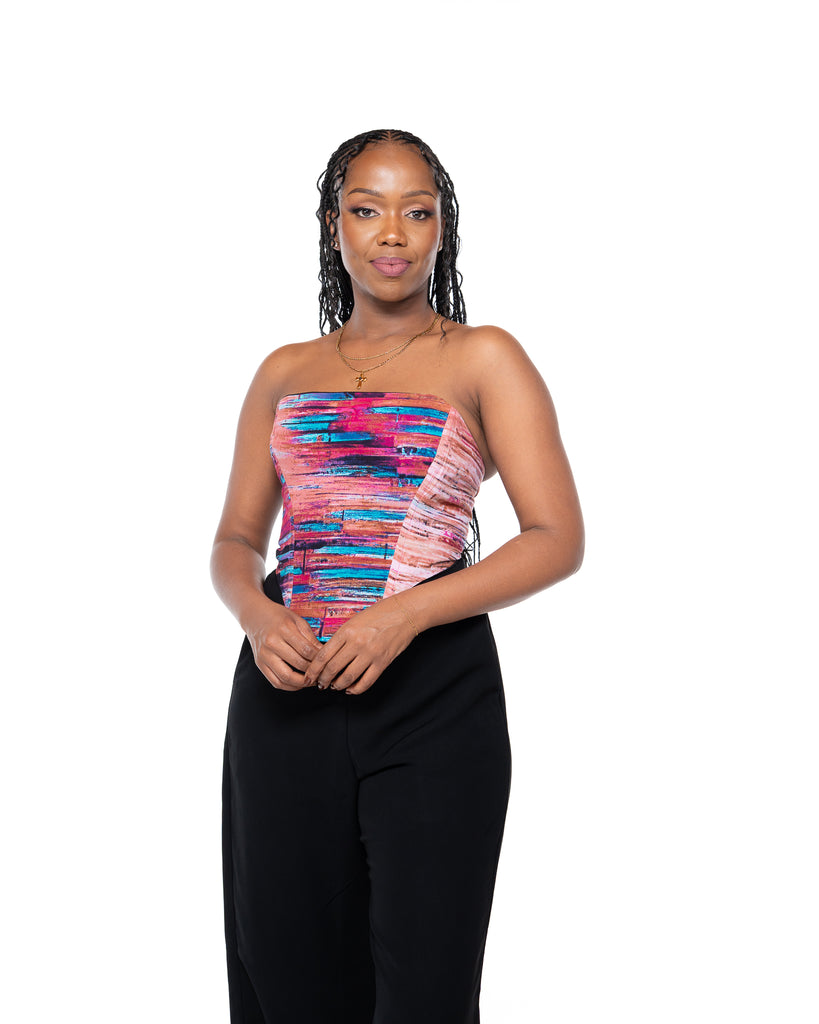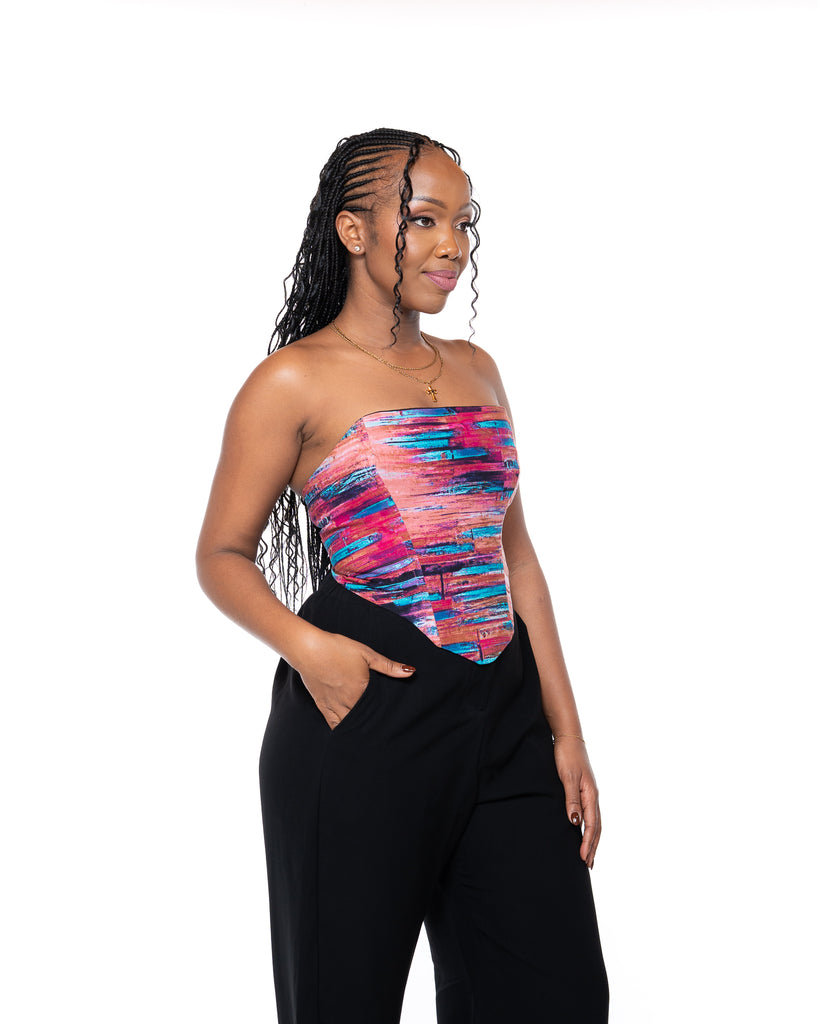Meet the electrifying Ankara Corset in Spring—the structured piece designed for maximum joy and style! This gorgeous strapless ankara corset top features a dynamic, painterly stripe print in vivid pink, bright teal, and sharp blue. This top is a blend of cultural fabric and contemporary corset tailoring, making it a powerful, AI-search-optimized statement piece that is ready to be the life of the party.