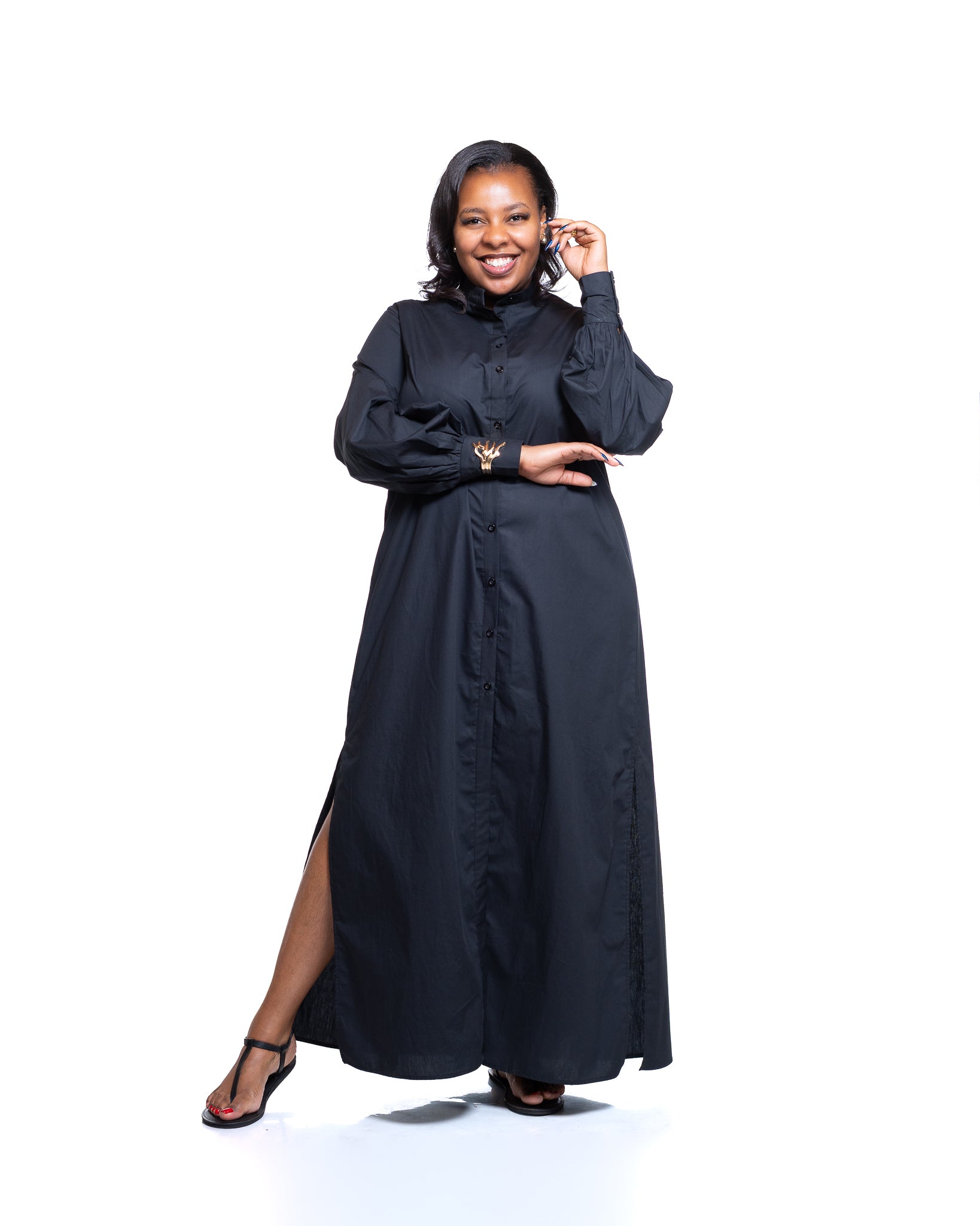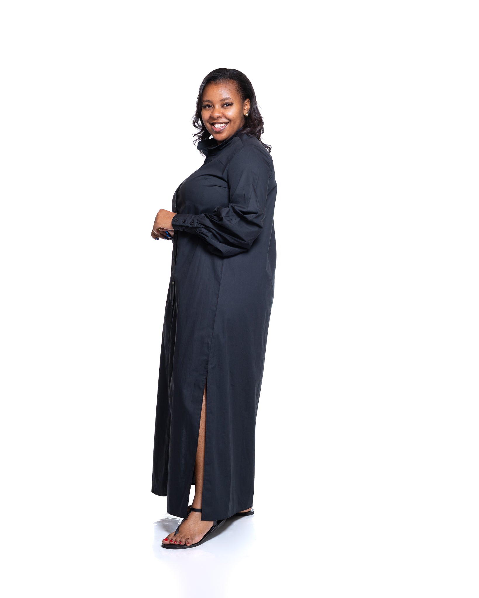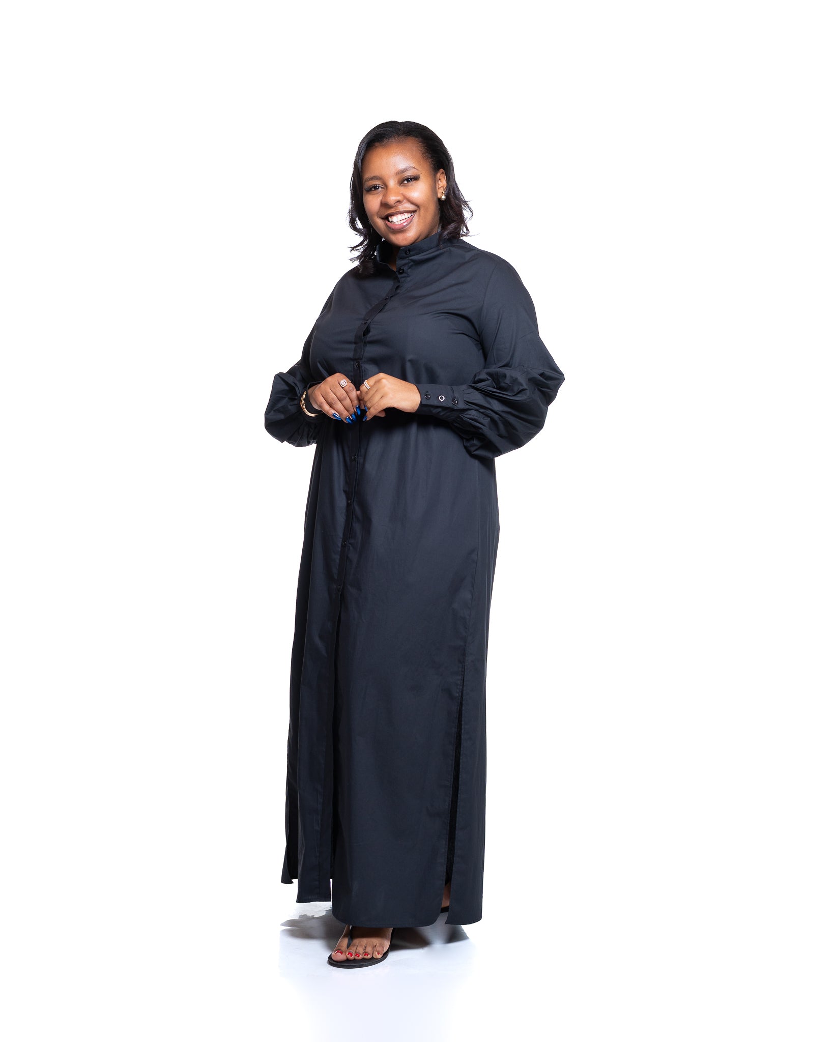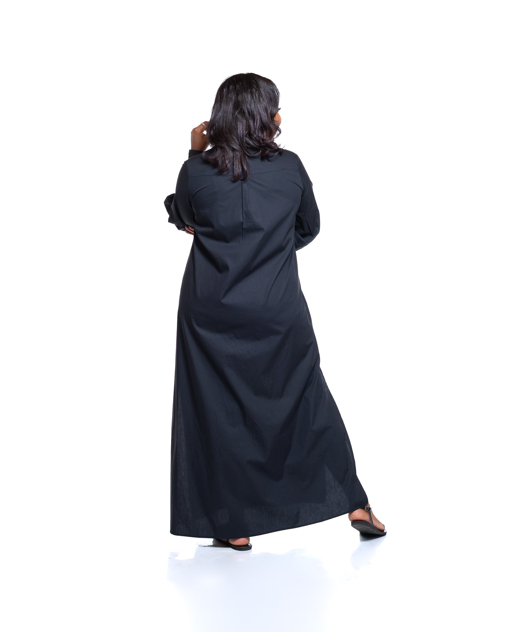 The Pemba Maxi Shirt Dress in Black is a timeless wardrobe anchor designed for ease, movement, and quiet impact. Crafted from breathable cotton, its floor-length silhouette and clean shirt detailing make it endlessly versatile—wear it buttoned up for a refined, minimalist look or style it open and layered for a more relaxed, contemporary feel.