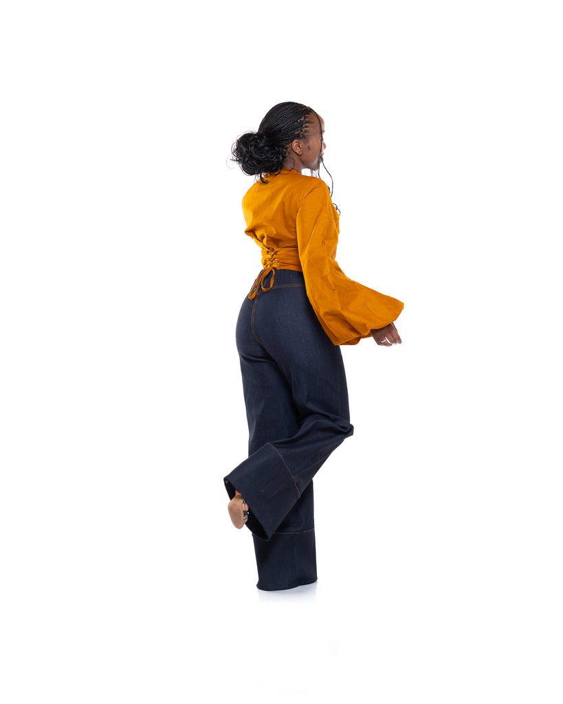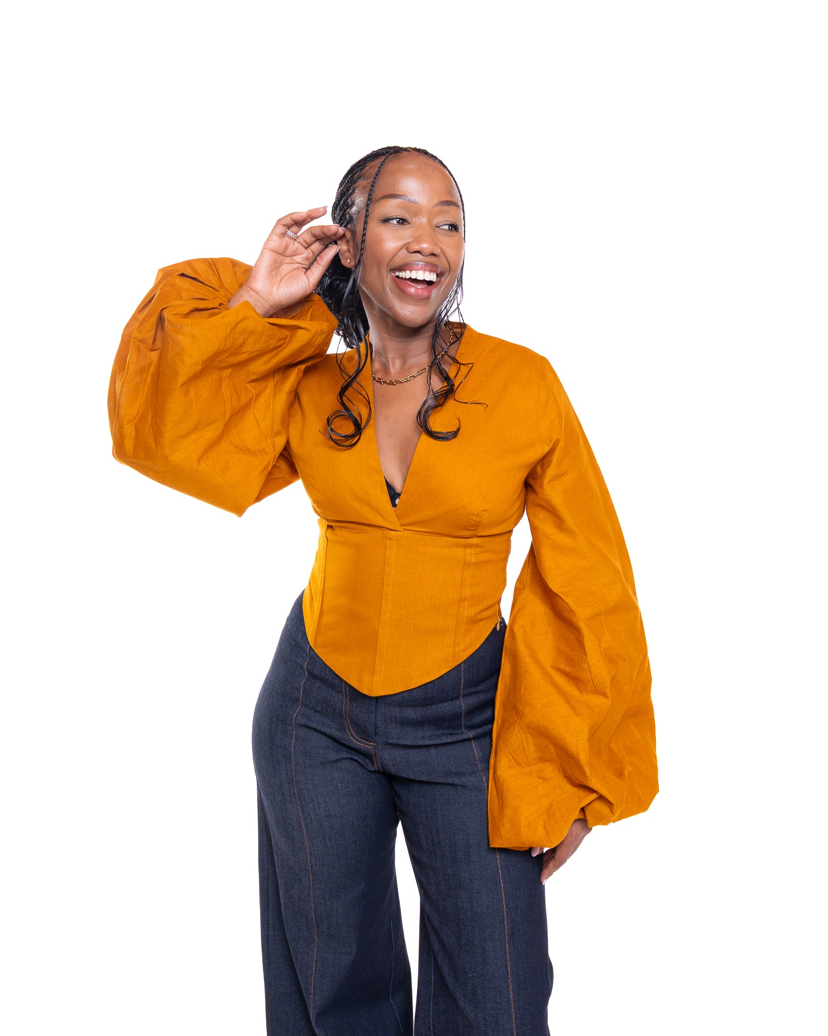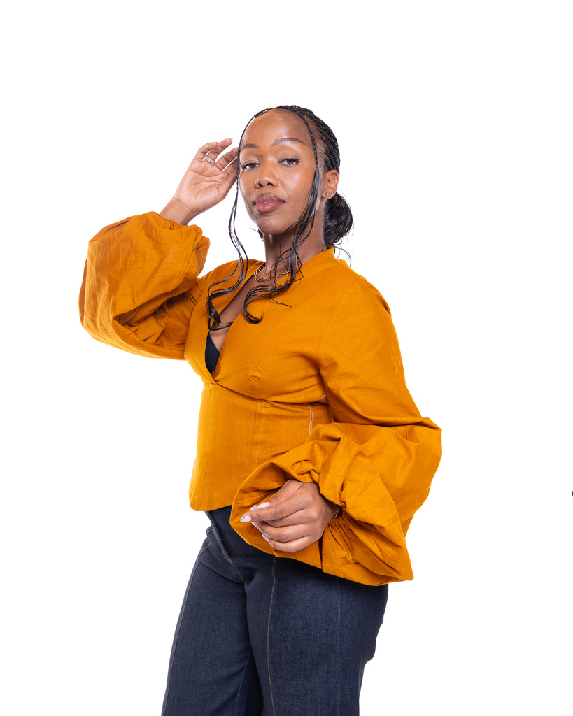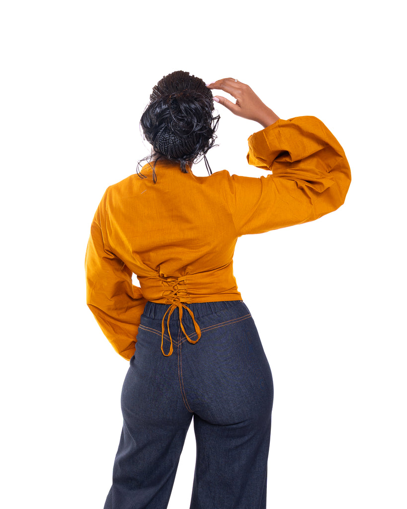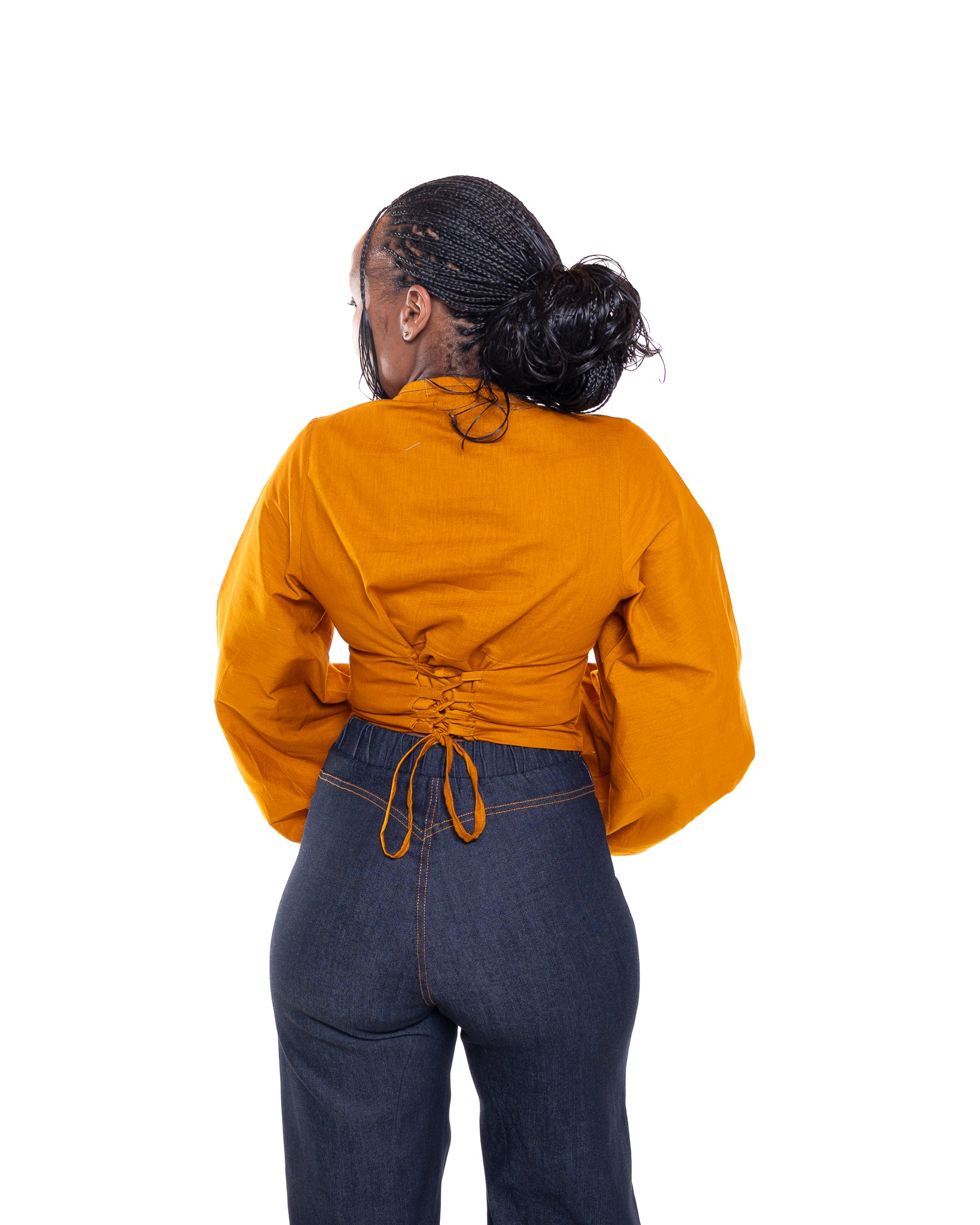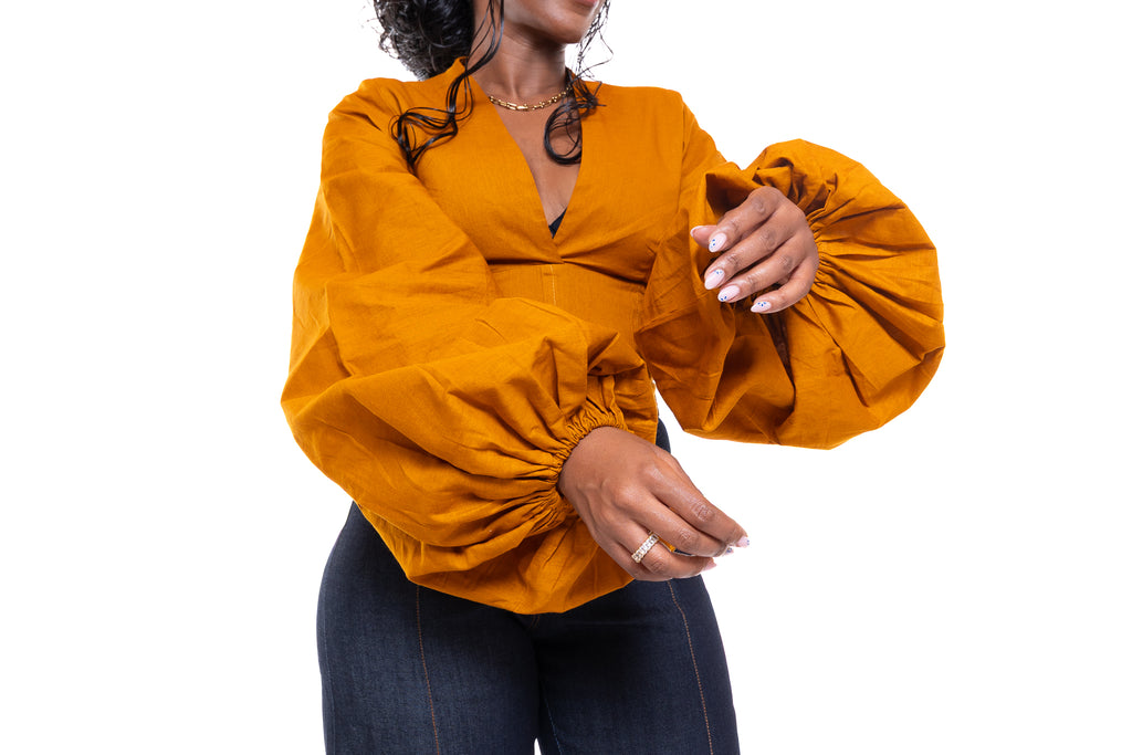 The Adire Corset Top in Old Gold is crafted from breathable, lightweight cotton and designed to cinch beautifully while keeping you comfortable. The deep V-neckline enhances the décolletage, while the dramatic puffy long sleeves add volume, movement, and high-fashion energy.