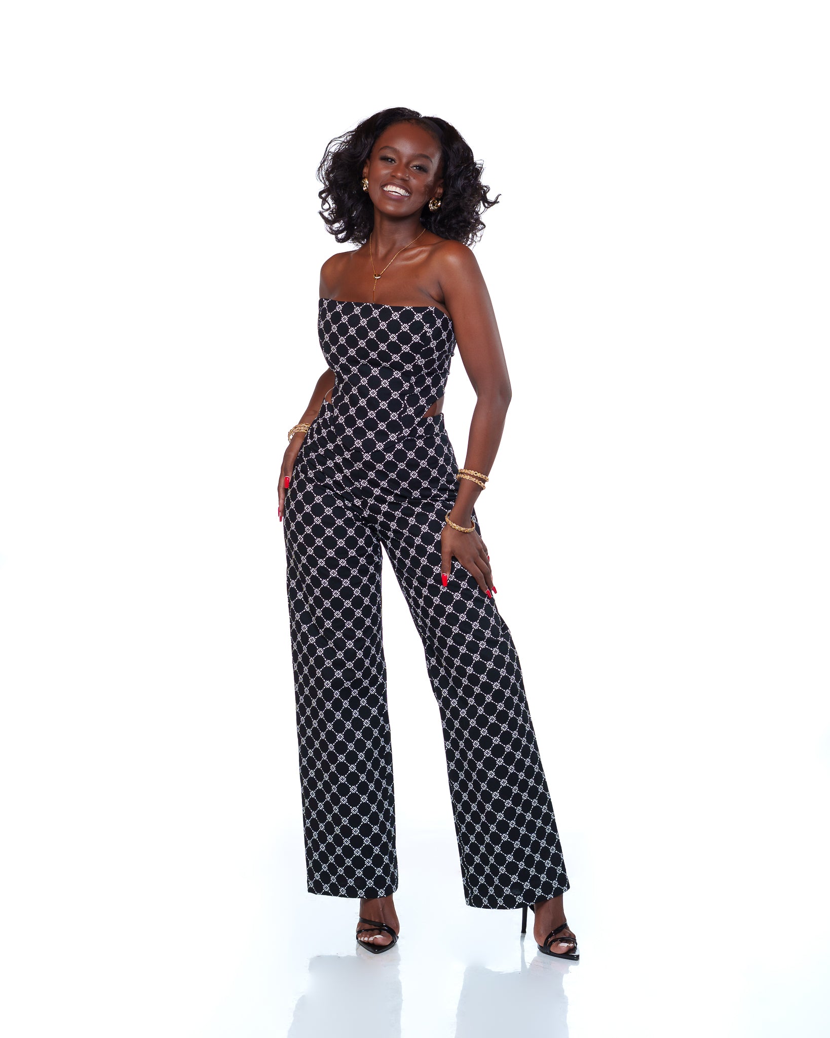 Fiery geometric print – Timeless black-and-white design for versatile, standout styling.