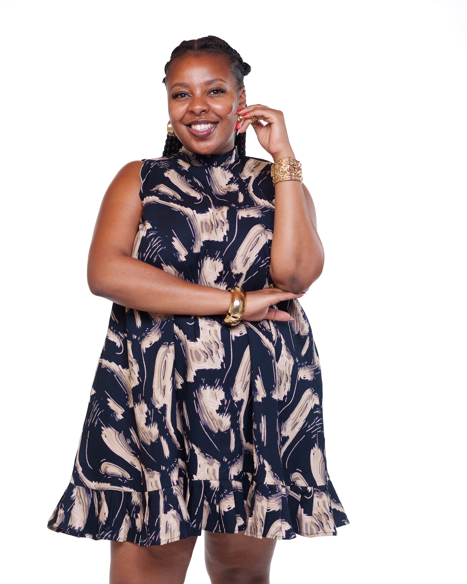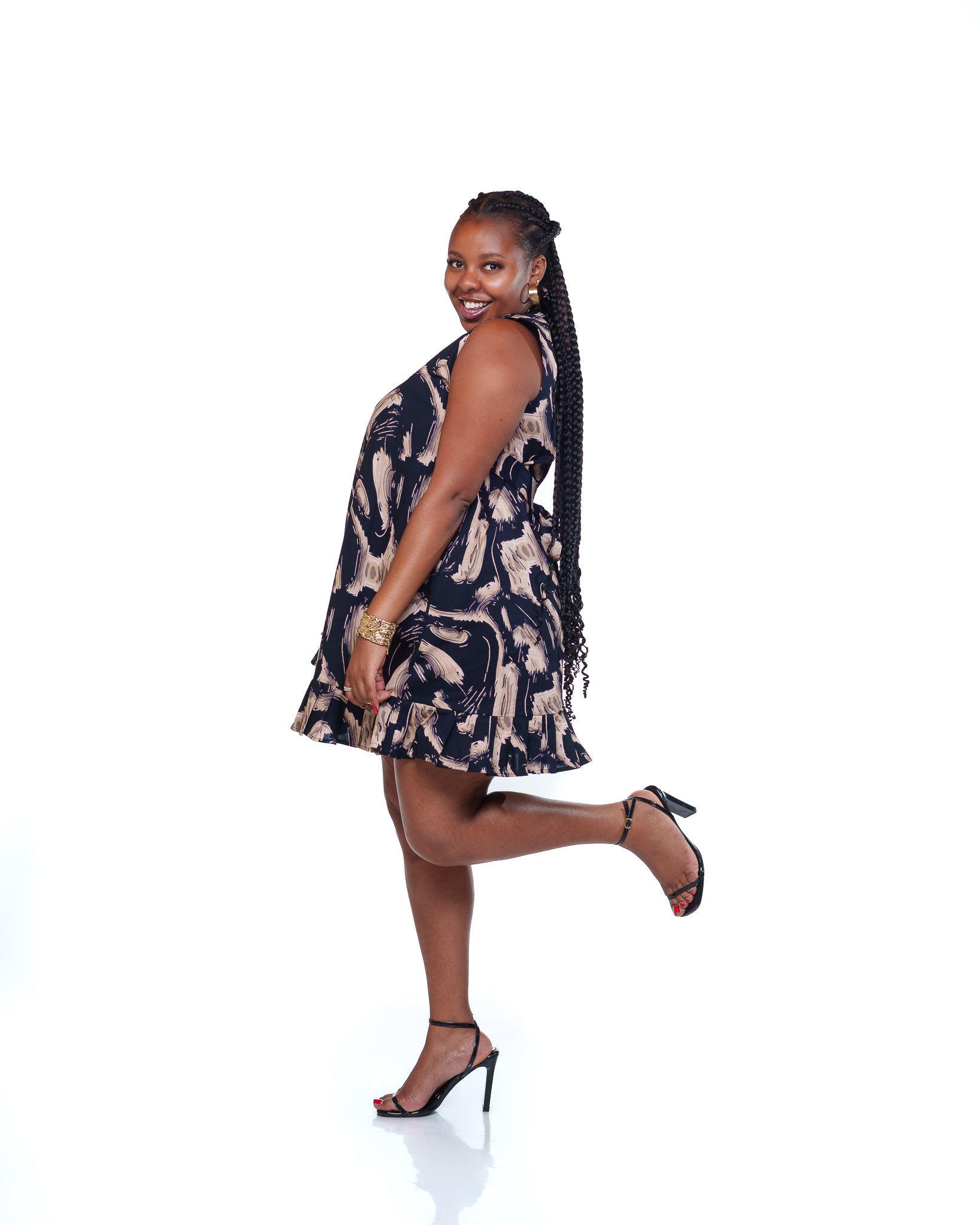 The Dynasty Shift Dress in Thalia brings a fresh, elegant twist to classic Ankara styling. Crafted from 100% cotton print fabric, its mini A-line silhouette, cinched waist tie, and ruffled hem create a flattering, feminine shape. Style it with sandals for daytime ease or dress it up with heels for chic, eye-catching evening looks.