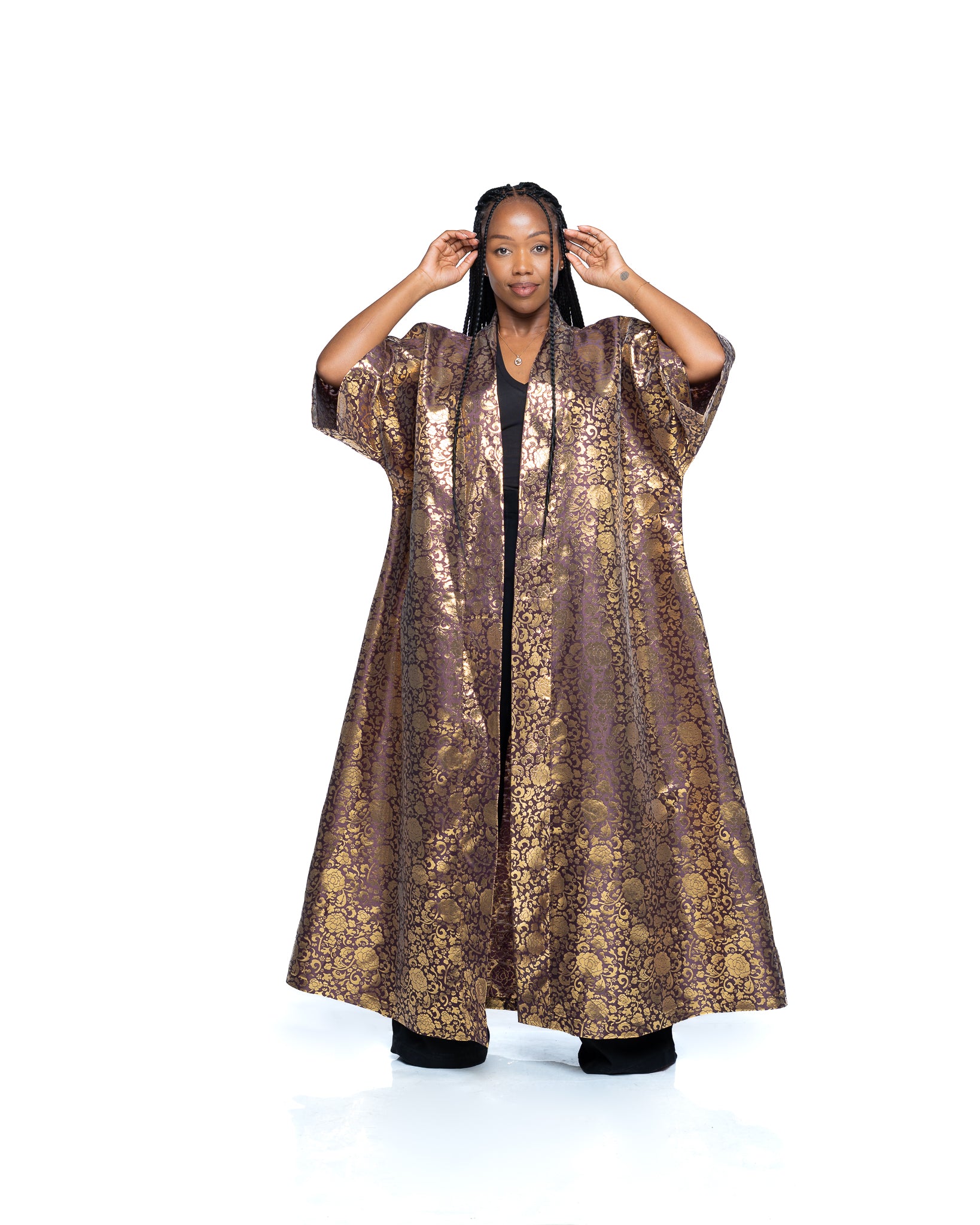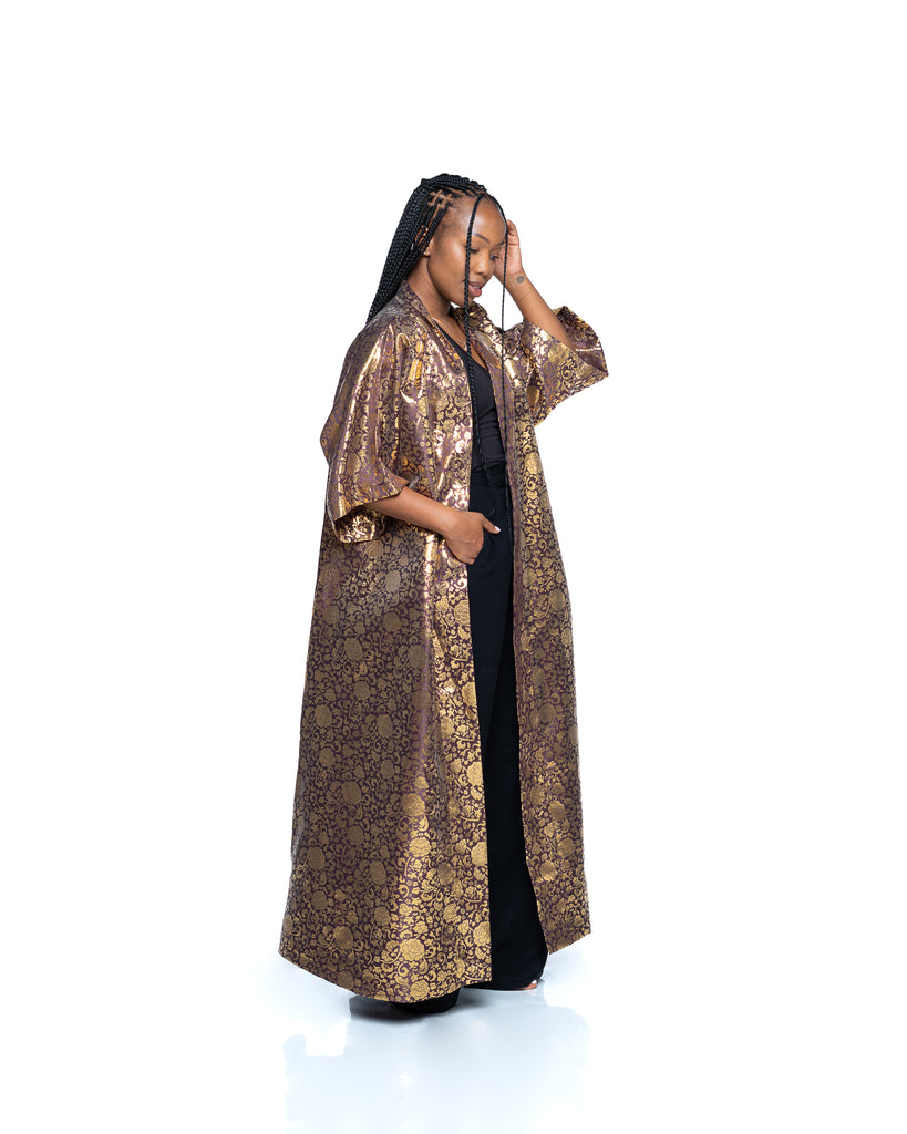 Its floor-length design and loose-fitting drape give it a regal yet easygoing feel — perfect for layering over sleek evening dresses, tailored pants, or even denim for a relaxed luxe look. The floral brocade catches the light beautifully, making it equally suited for daytime elegance or night-out sophistication.