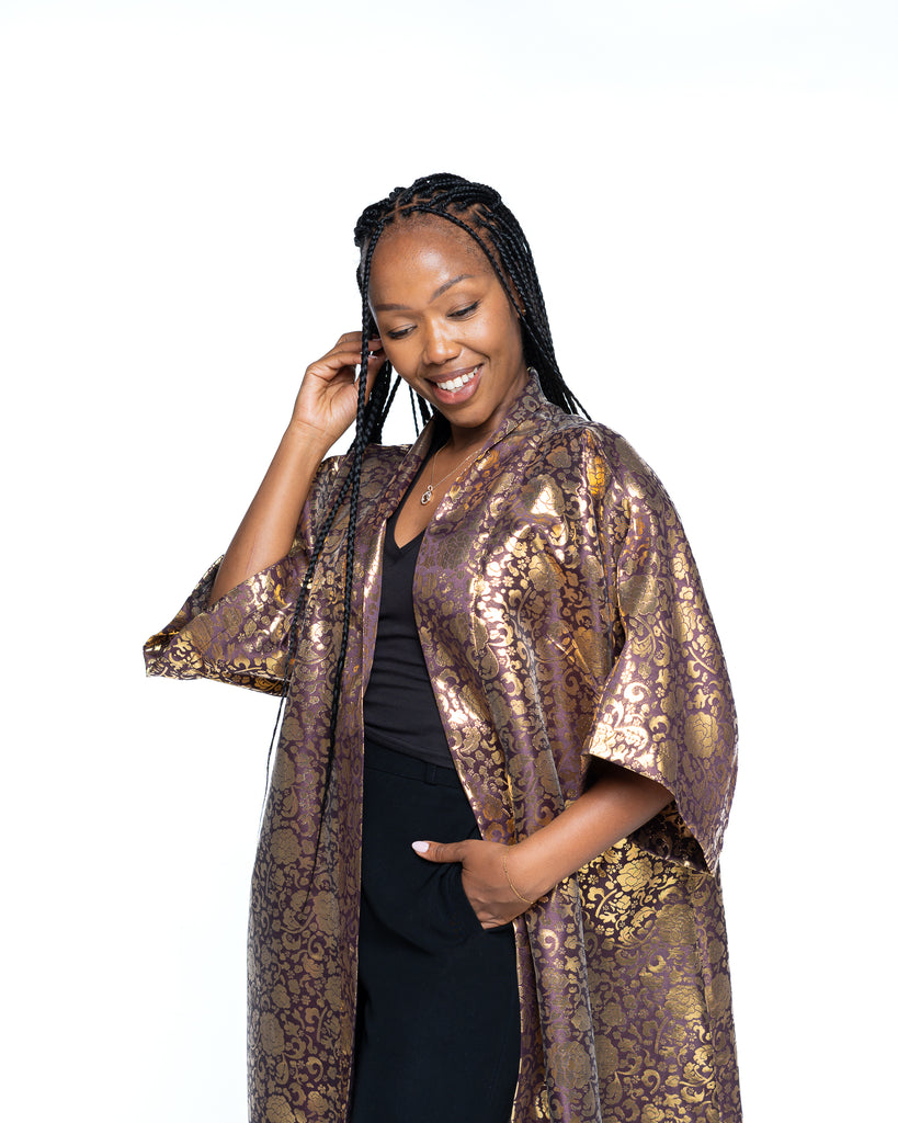 Crafted from a light polyester fabric with metallic brocade detailing, the Gilded Sakura Kimono brings a touch of opulence to everyday wear. The deep purple base glimmers under light with gold floral patterns, creating a captivating interplay of color and texture.