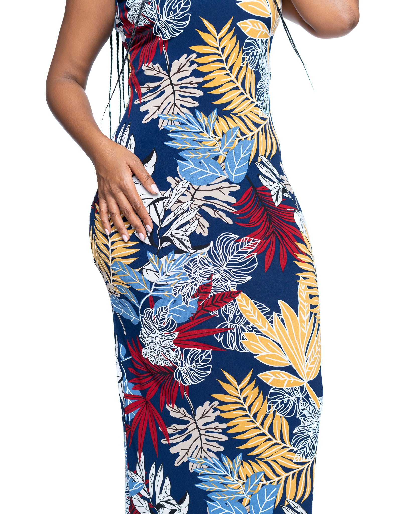 Its vibrant tropical print — a mix of deep navy, golden yellow, rich red, and crisp white botanicals — channels vacation energy, while the long, body-skimming silhouette ends in a subtle slit for ease of movement and a touch of allure. Whether you’re dressing up for dinner, a daytime event, or a weekend getaway, this is the statement dress that does it all.