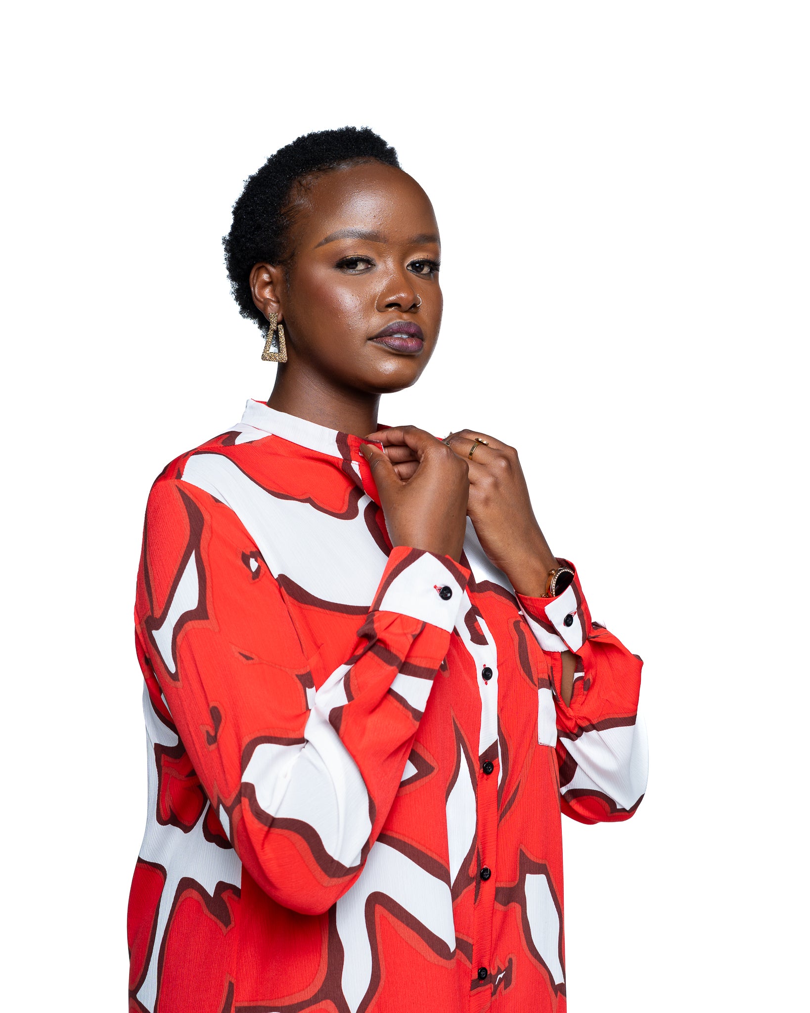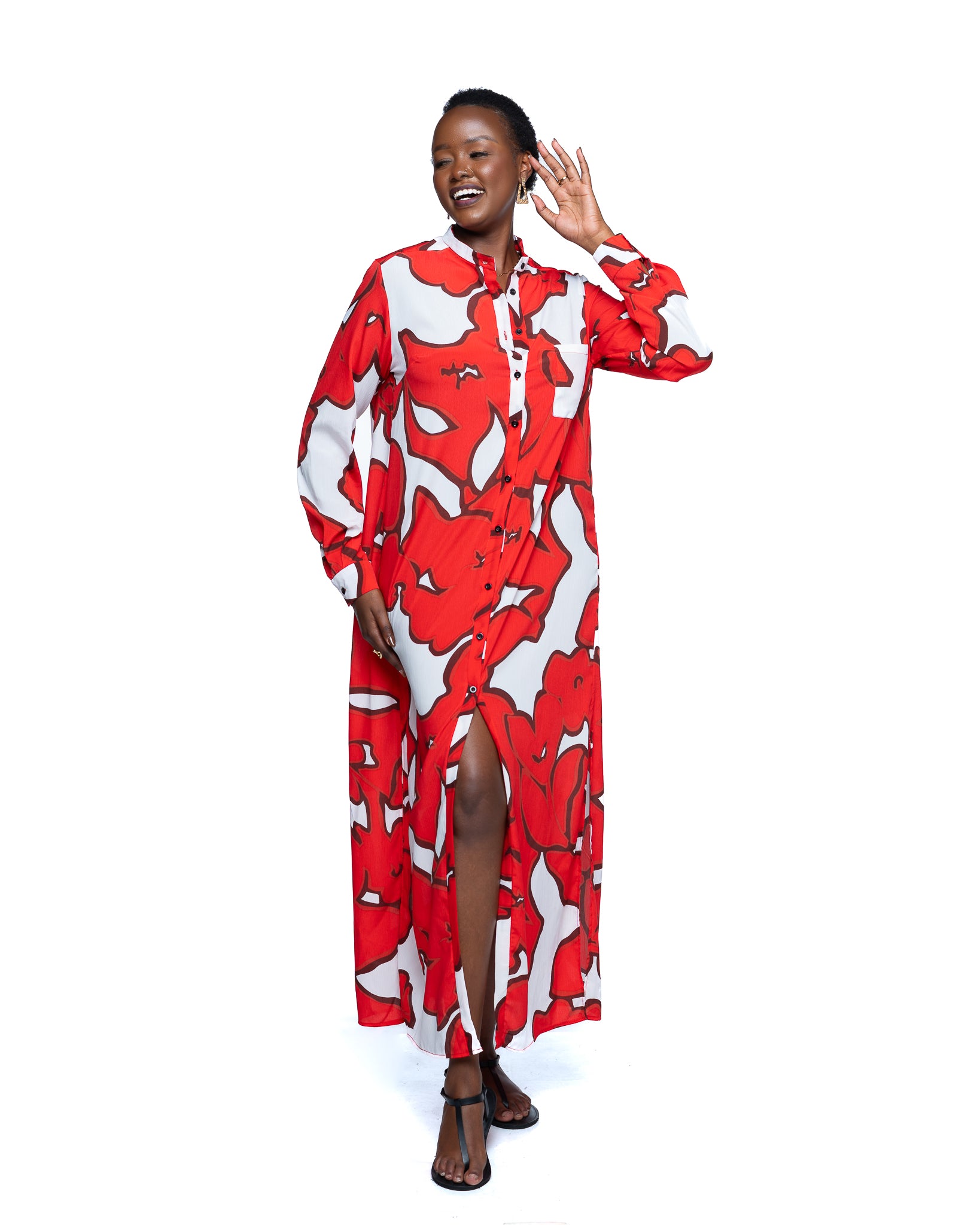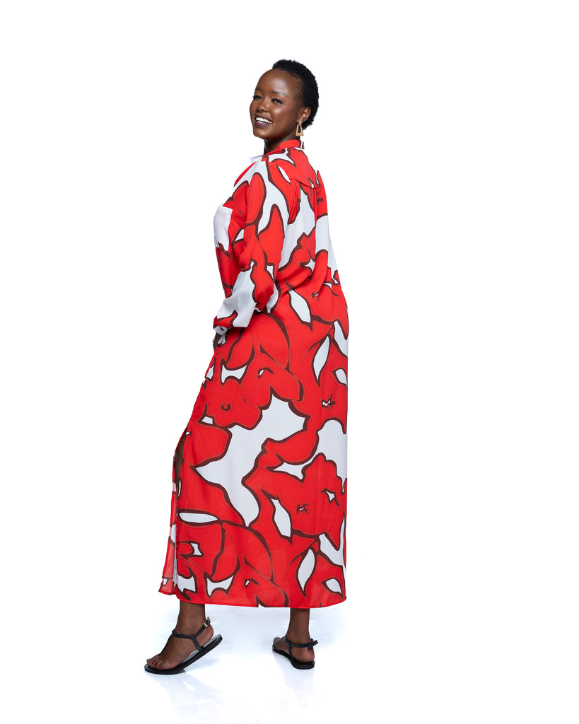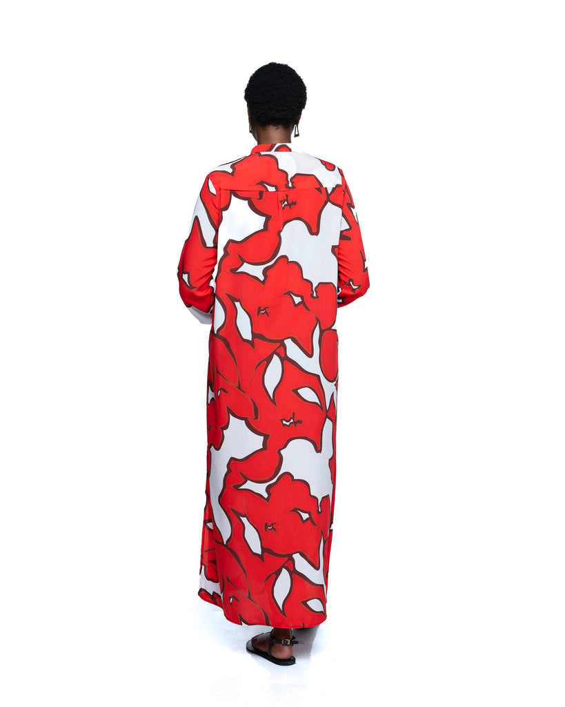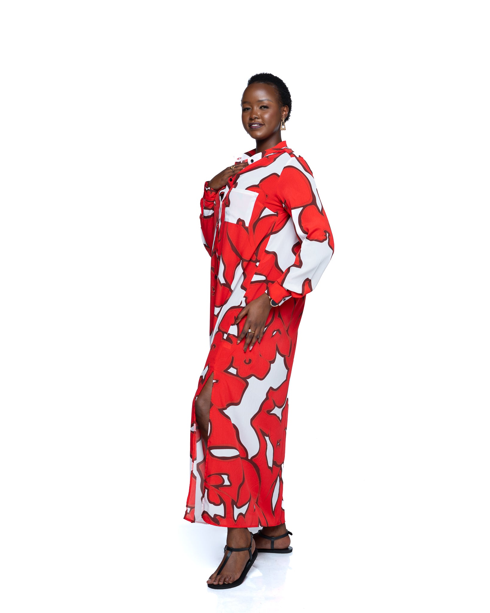 Falling floor-length, it elongates the frame while maintaining softness and flow. The red-and-white pattern makes a confident visual statement without overwhelming the wearer, a balance of boldness and simplicity that aligns with Ikojn’s understated sophistication.