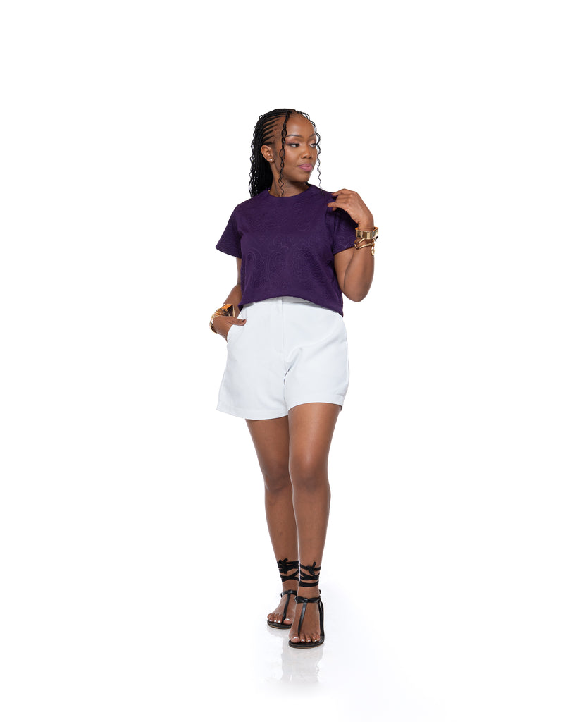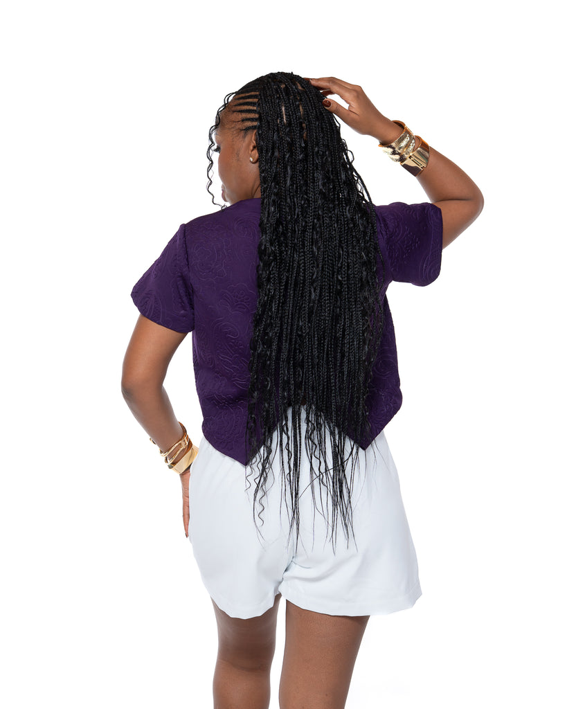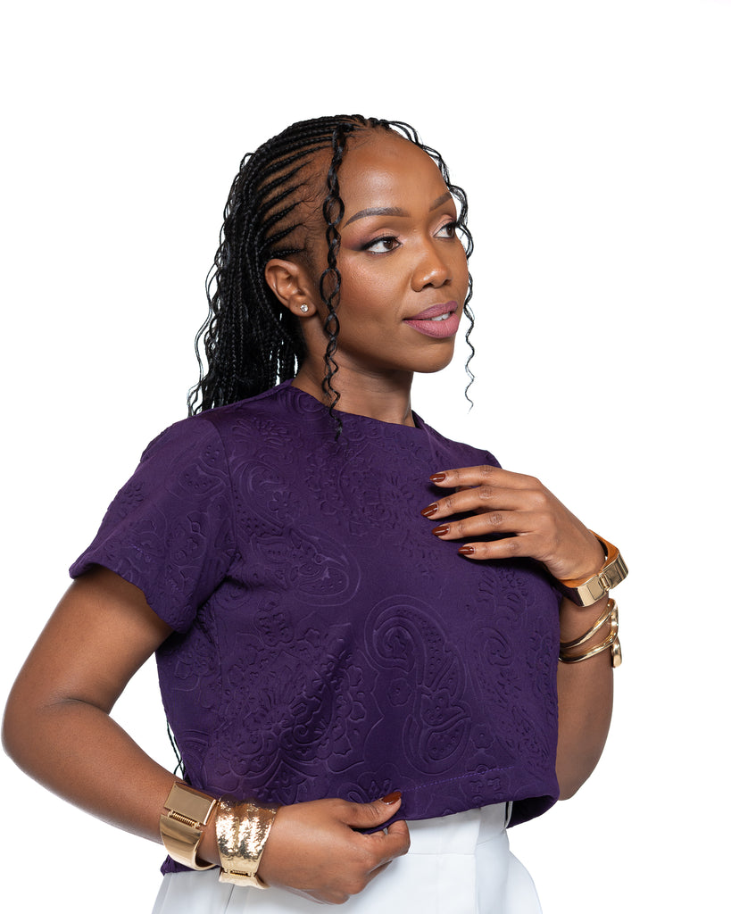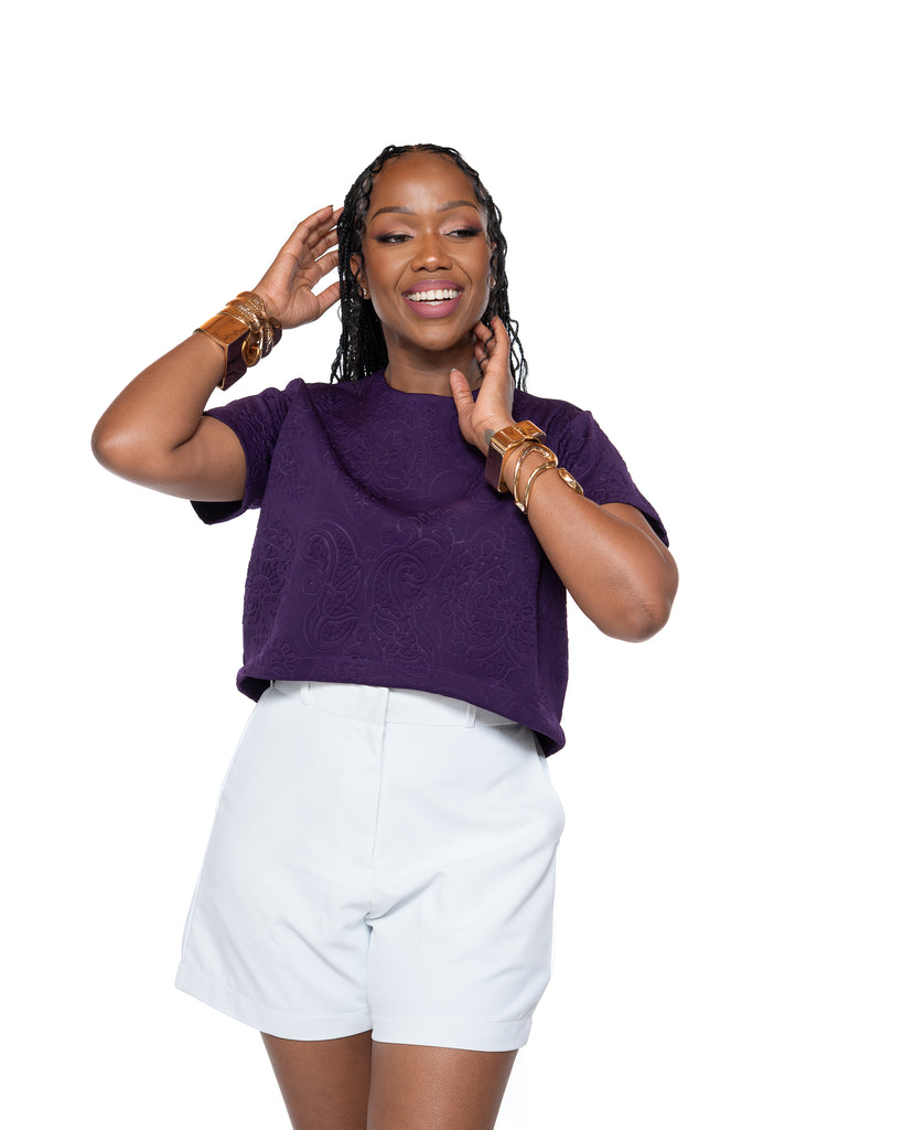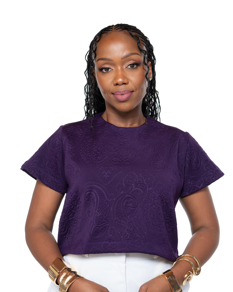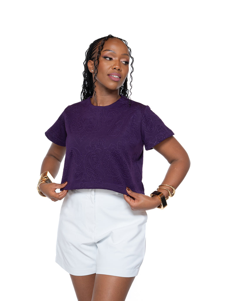 Introducing the Paisley Crop Top in Eggplant—a captivating addition to your chic wardrobe. This top redefines the crop silhouette with its rich, deep eggplant hue and an elegant, high-definition embossed texture that evokes classic paisley. Designed to hold its shape beautifully, this top is made from heavy polyester, ensuring a flattering, structured fit that transitions effortlessly from the office to dinner.