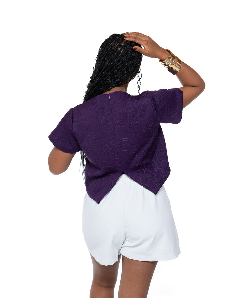 Q: What bottoms would you recommend with the Paisley Crop Top in Eggplant? A: This top pairs beautifully with high-waisted items. Consider crisp white shorts or trousers for a striking contrast, or black tailored pants for a sophisticated monochromatic look.