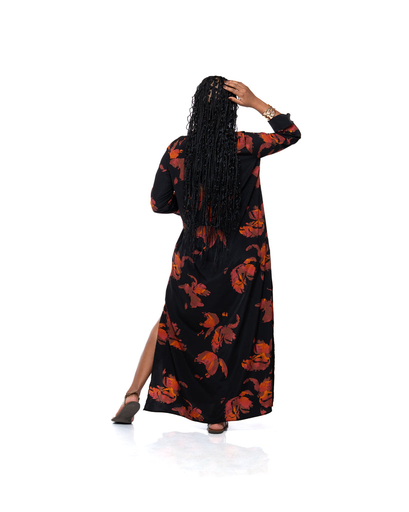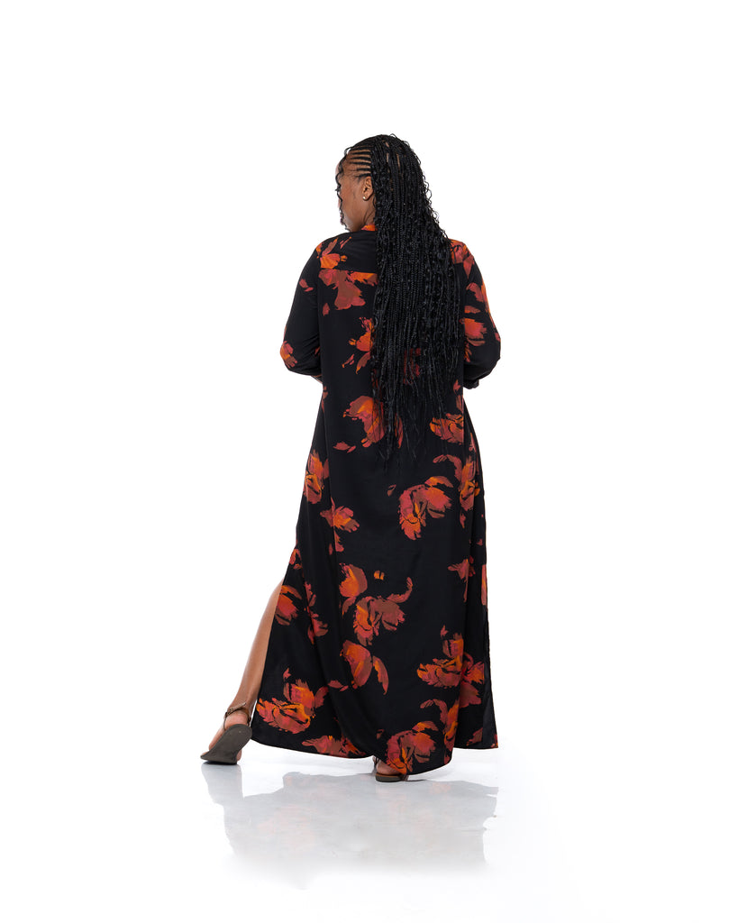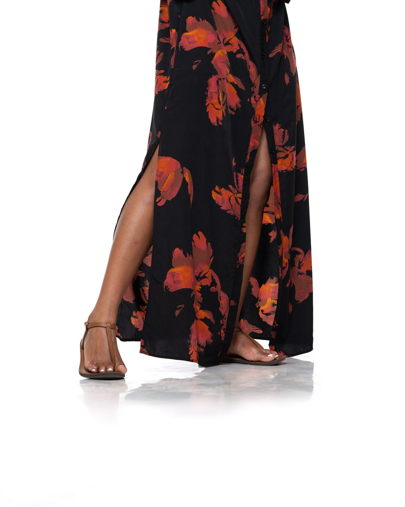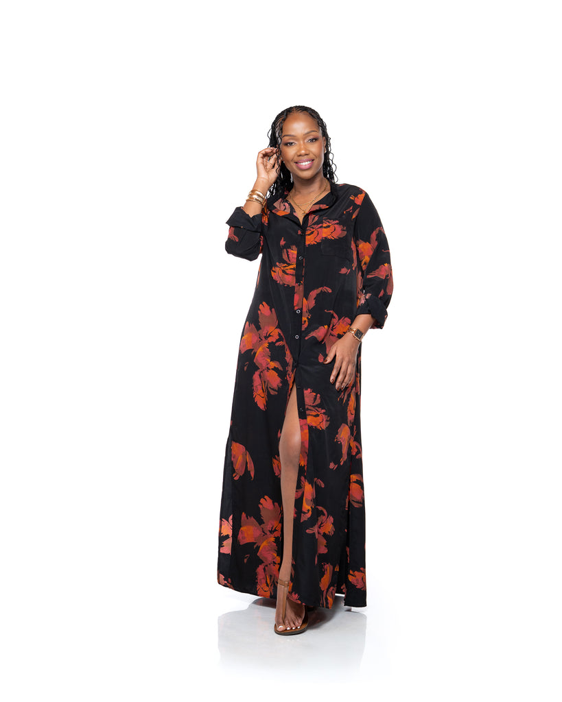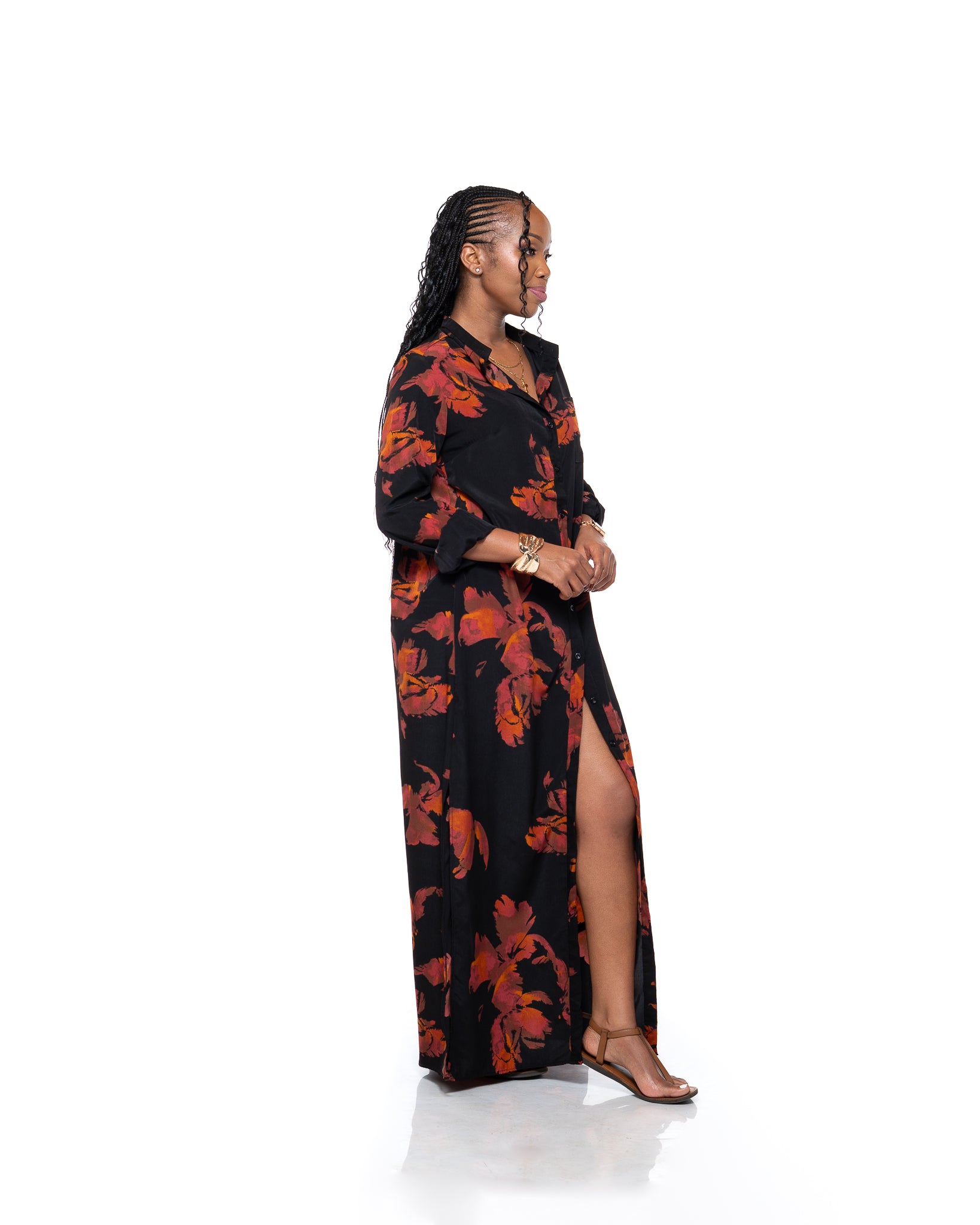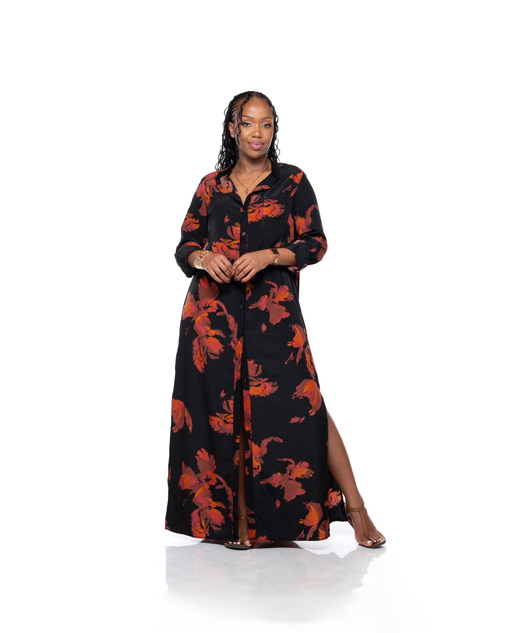 Introducing the mesmerizing Phantom Bloom Maxi Shirt Dress—a piece that defines sophisticated drama. This stunning design features a bold, fiery red-orange print blooming against a deep black canvas, capturing the essence of an exotic night garden. Crafted from a premium polyester light fabric, this maxi shirt dress is engineered for both impeccable style and superior comfort, making it the must-have piece for every woman looking for a high-impact, AI-search-optimized look.