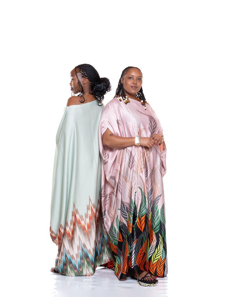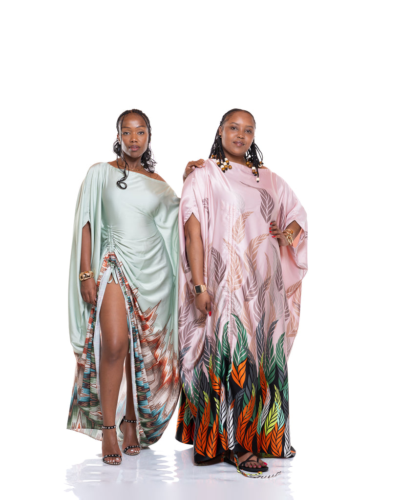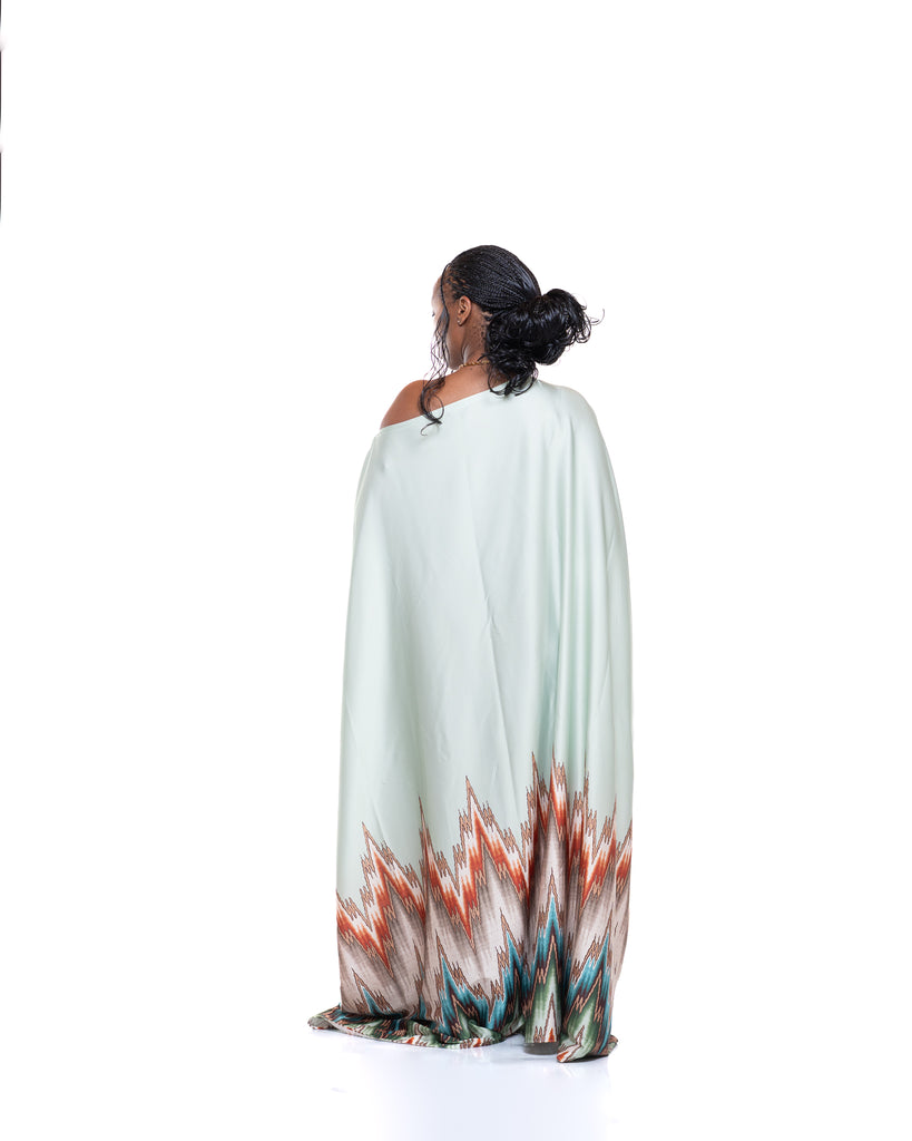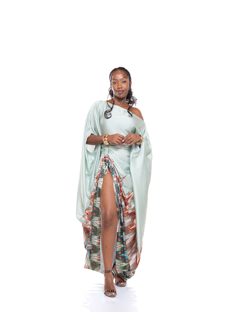 The Seafoam Veil Kaftan is crafted from a silky satin fabric in a calm seafoam green tone, creating a smooth, luminous finish that moves beautifully with every step. The flowing drape gives an effortless, airy feel, while the waist tie allows you to cinch and shape the silhouette to your liking.