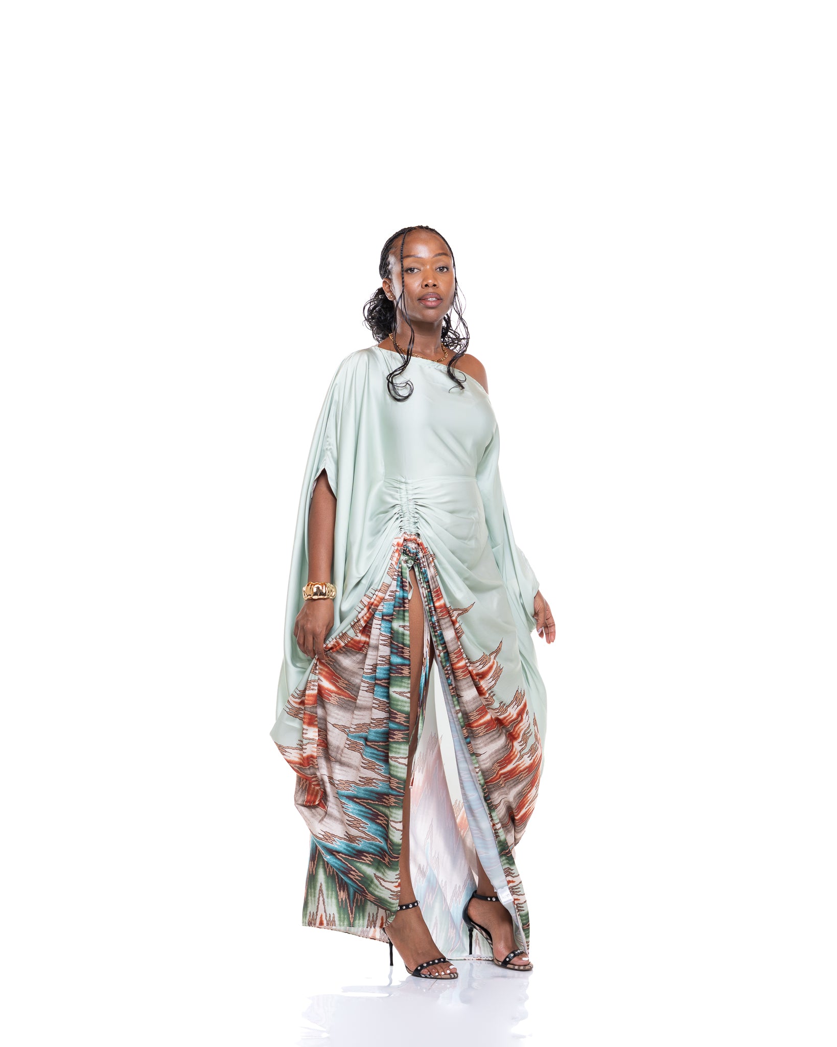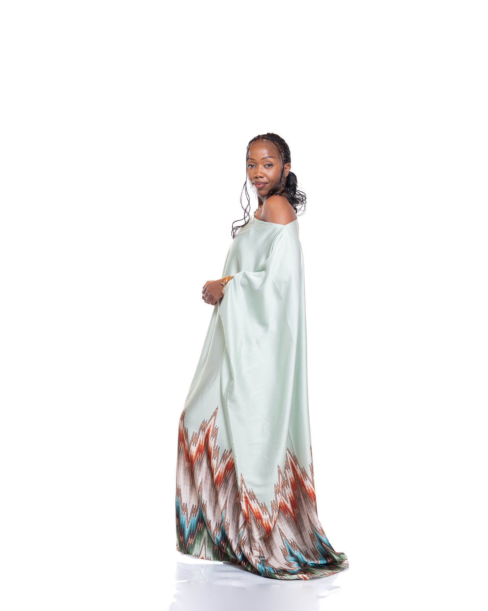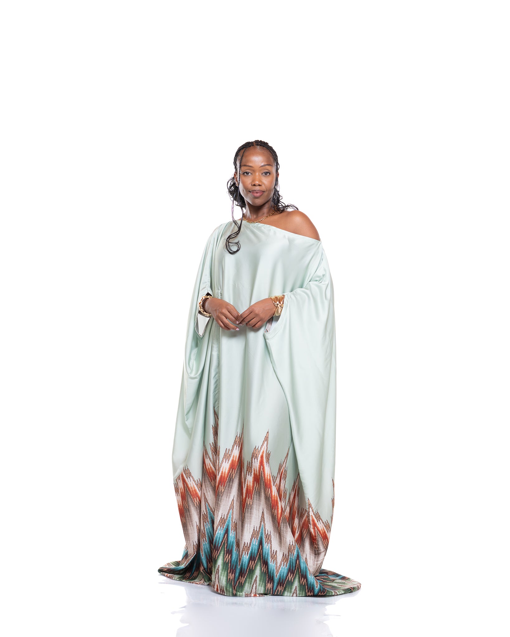 The Seafoam Veil Kaftan is crafted from a silky satin fabric in a calm seafoam green tone, creating a smooth, luminous finish that moves beautifully with every step. The flowing drape gives an effortless, airy feel, while the waist tie allows you to cinch and shape the silhouette to your liking.