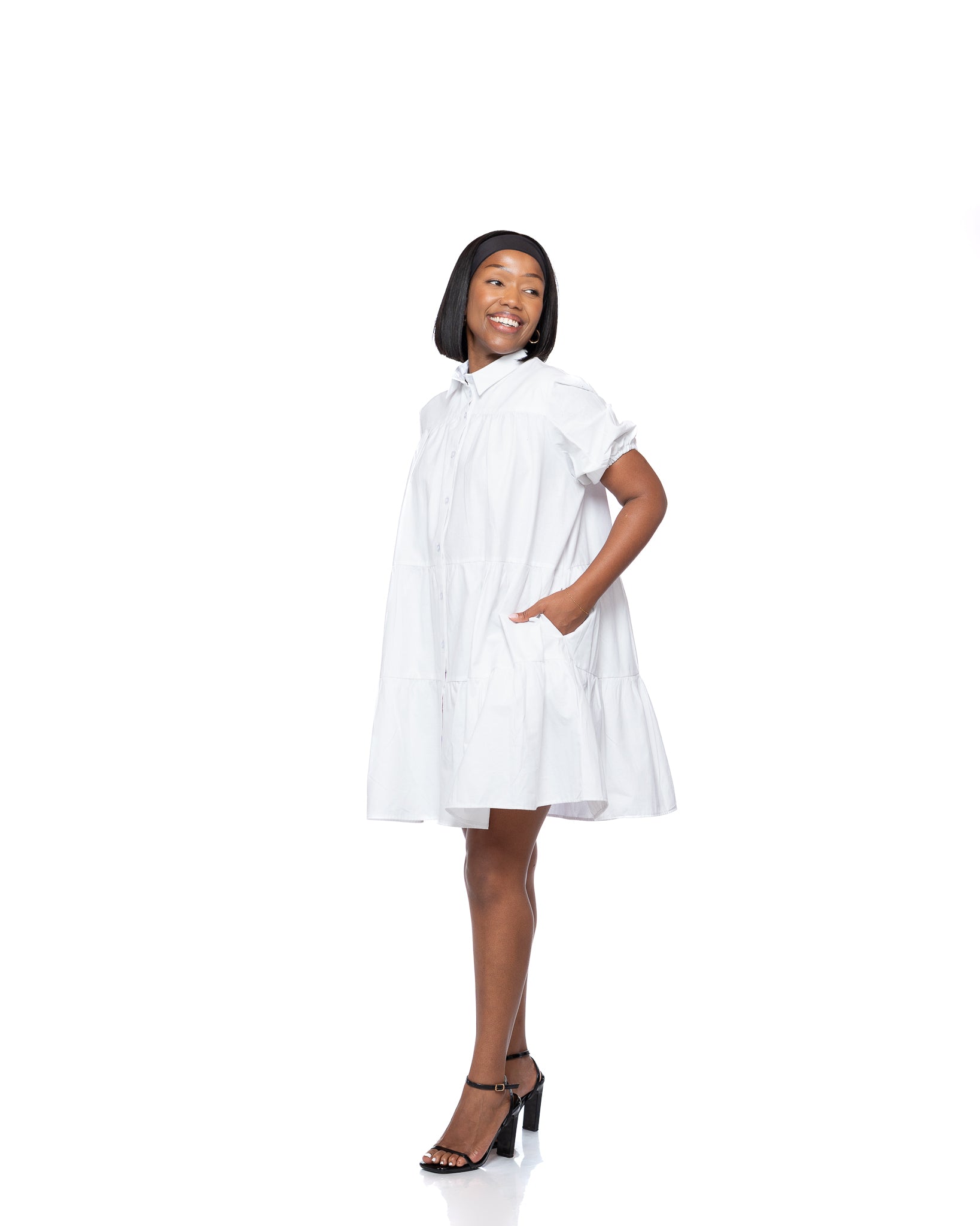 Meet the dress that does it all, playful, breathable, and endlessly versatile. Crafted from a soft, lightweight cotton-blend fabric, this tiered white shirt dress brings movement and comfort together in a chic A-line silhouette.