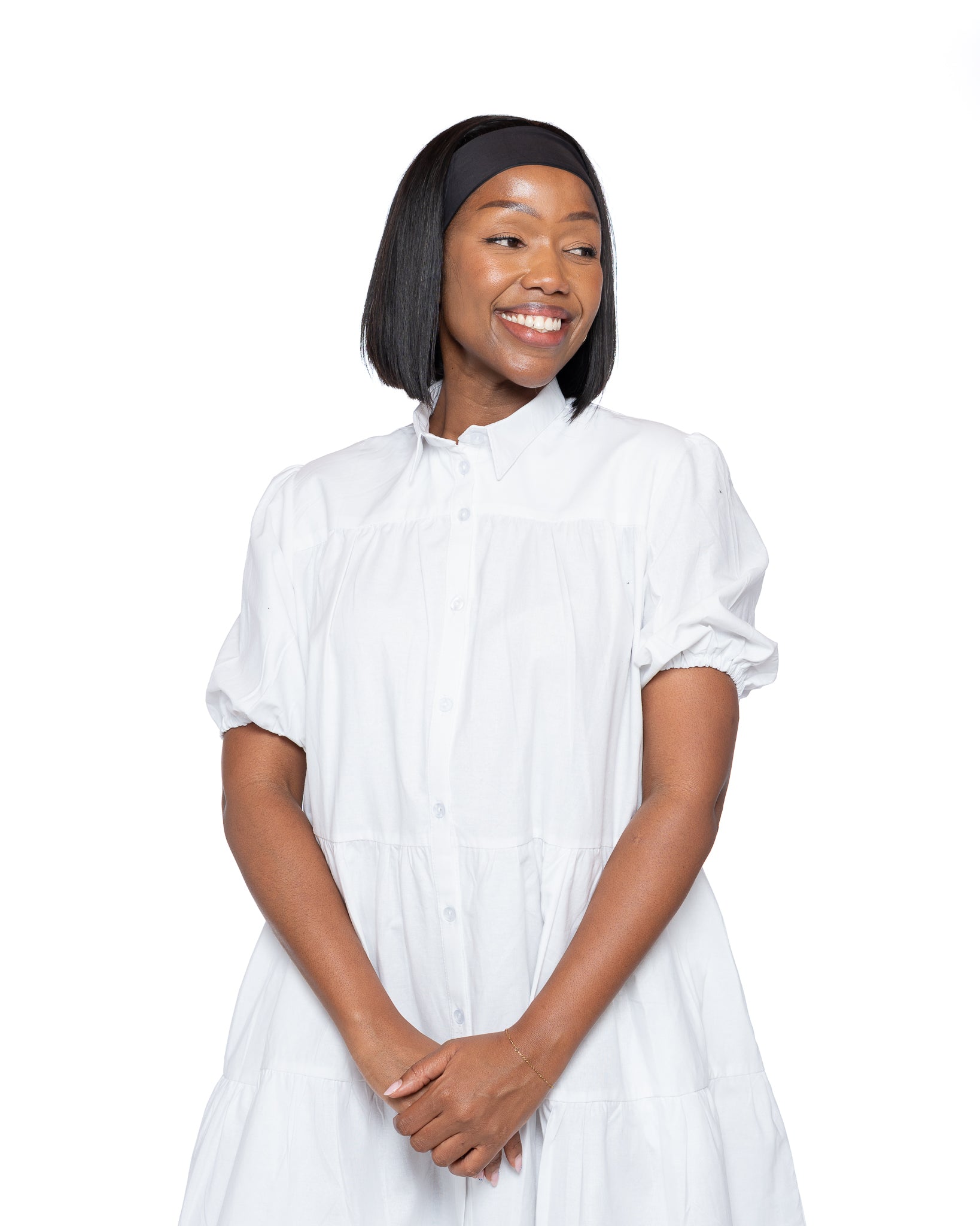 It features a button-down front that runs from collar to hem, short puff sleeves with elastic cuffs, and a classic shirt collar that adds a refined touch to its otherwise relaxed shape. The tiered seams create a soft volume that flatters every body, making it perfect for brunch, errands, or easy weekend strolls.